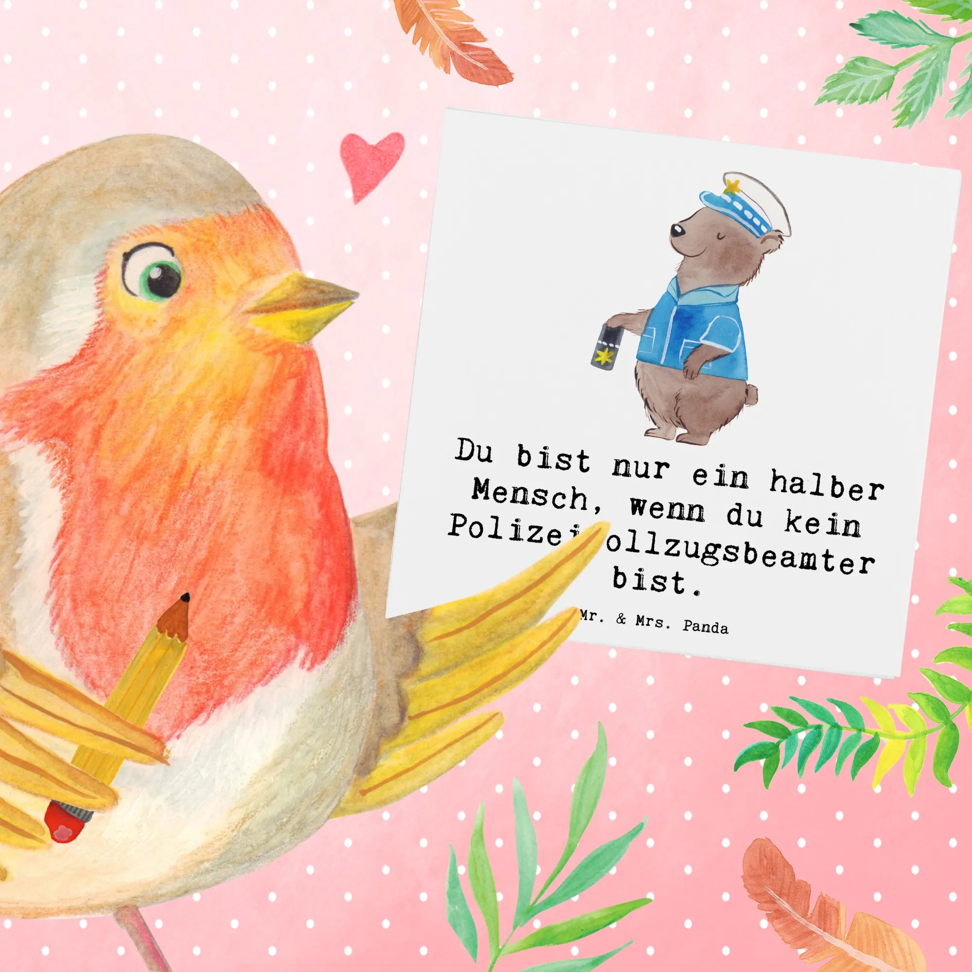 Du suchst das perfekte Geschenk für einen Polizeivollzugsbeamten oder eine Polizeivollzugsbeamtin? Dann ist die Grußkarte mit dem Motiv "Polizeivollzugsbeamter mit Herz" von Mr. & Mrs. Panda genau das Richtige für dich!