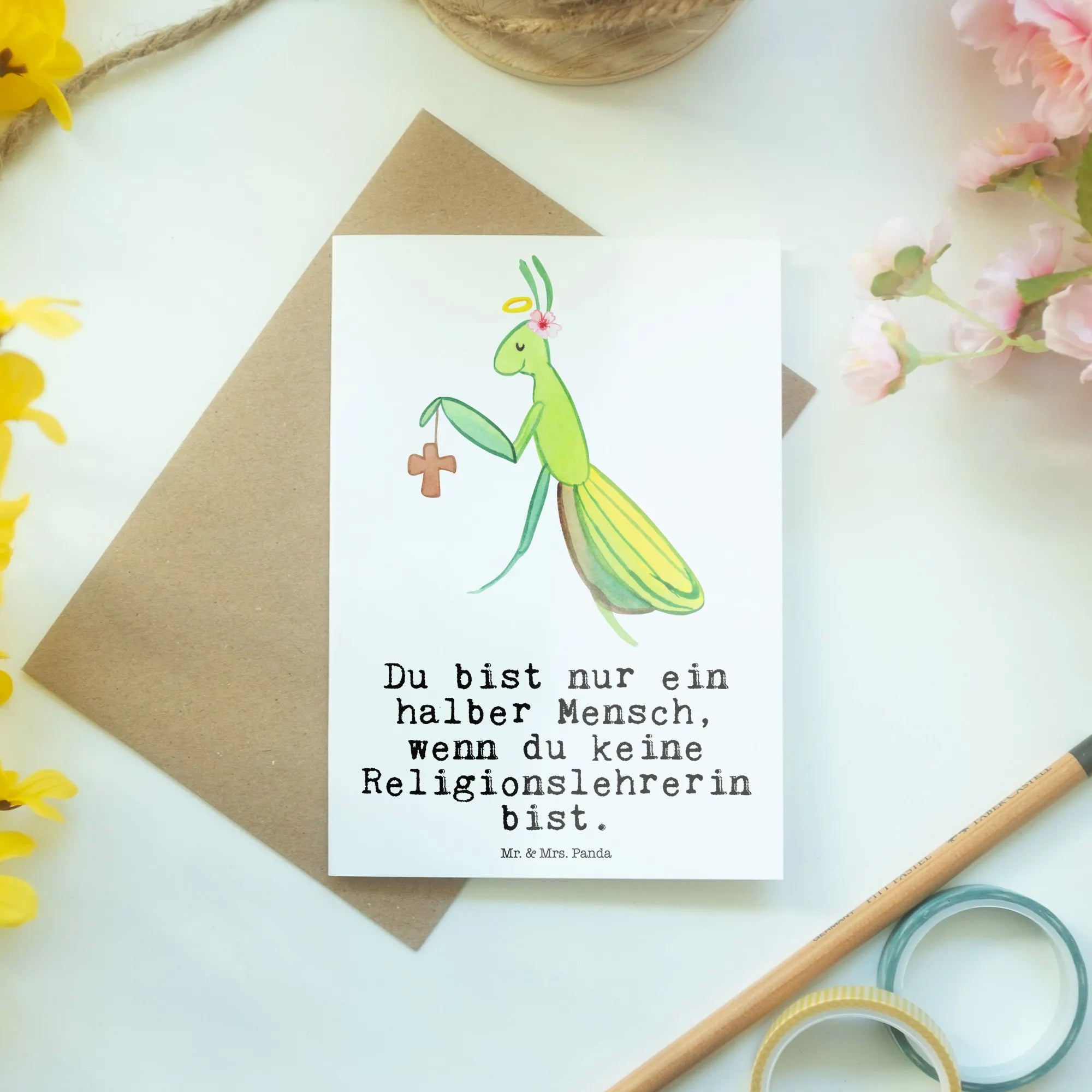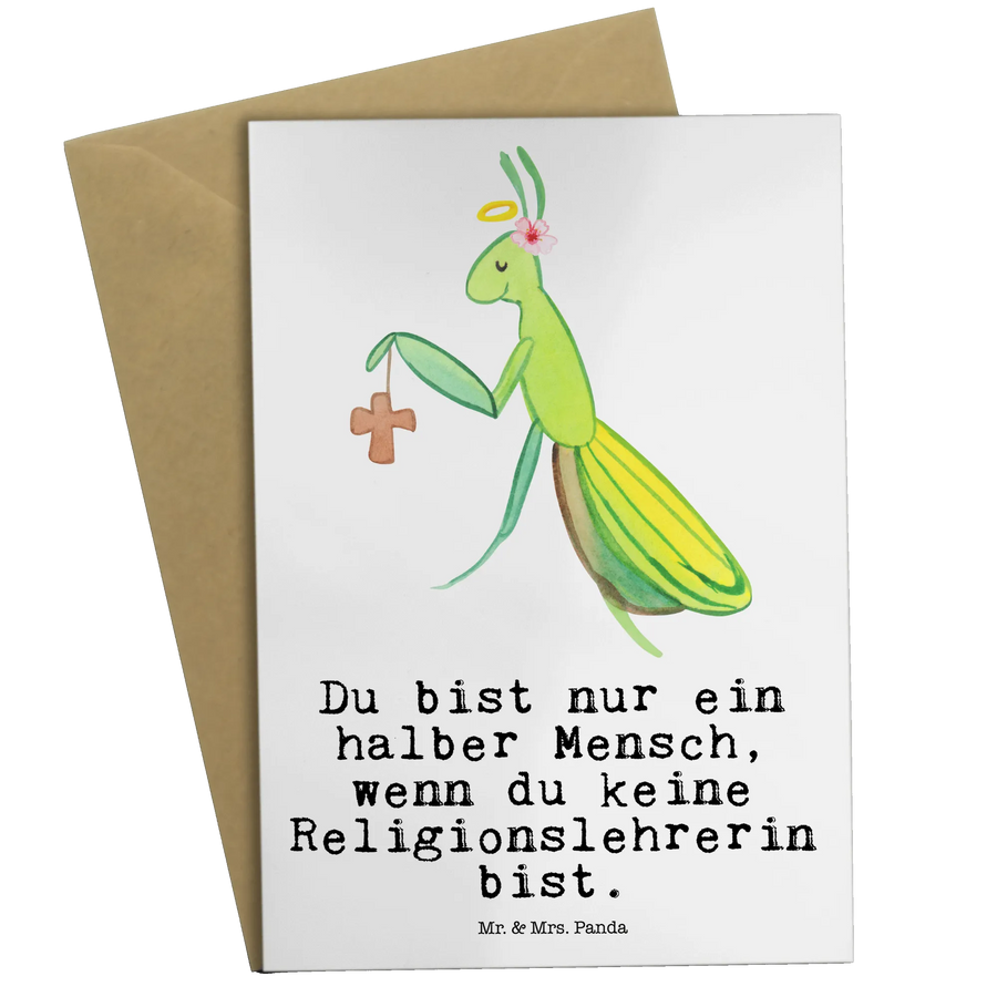 Mit dem Slogan 'Du bist nur ein halber Mensch, wenn du keine Religionslehrerin bist' wird ein Lächeln auf das Gesicht deiner Lehrerin gezaubert. Die Karte wurde mit viel Liebe zum Detail gestaltet und zeigt eine süße Gottesanbeterin, die ein Kreuz und einen Heiligenschein in den Händen hält.