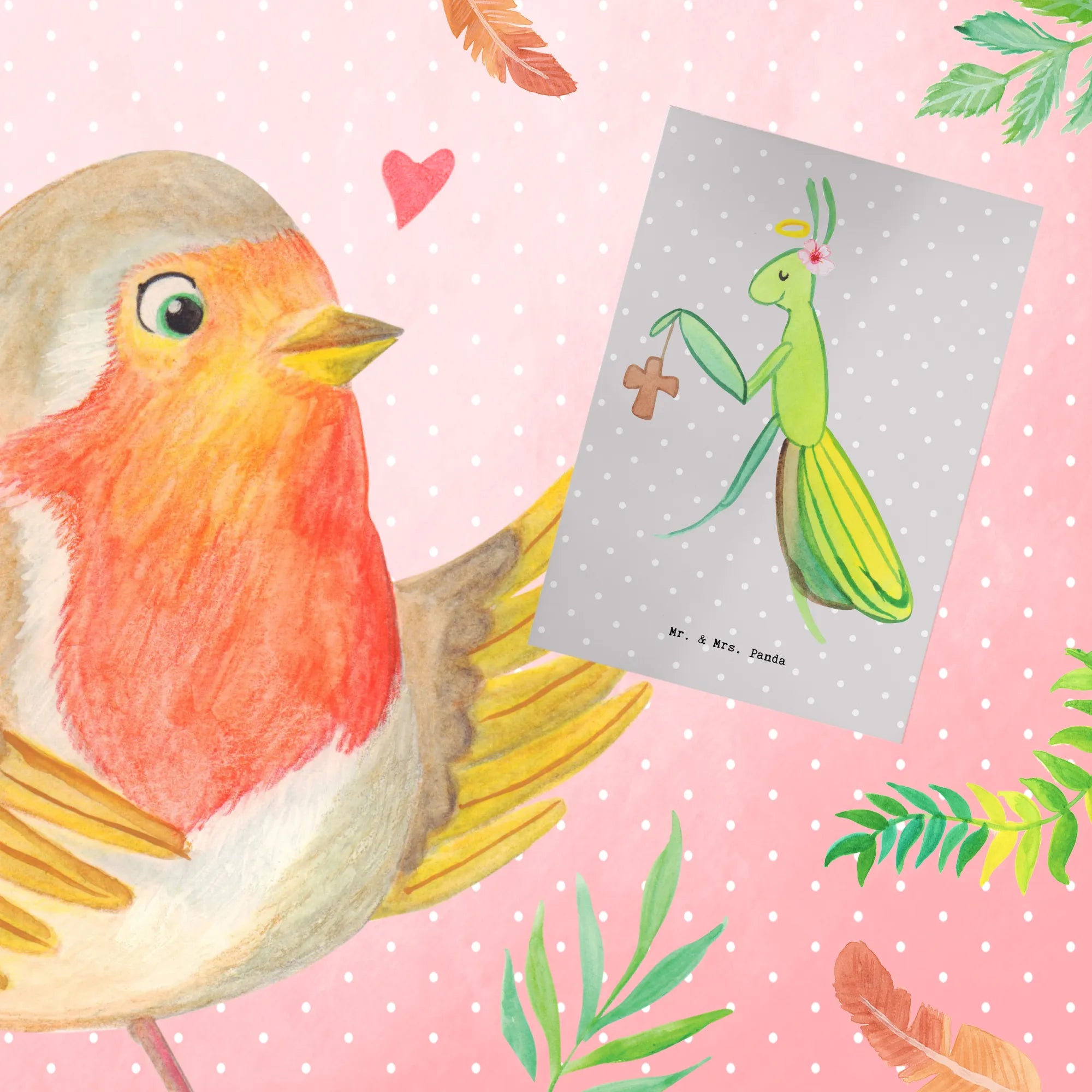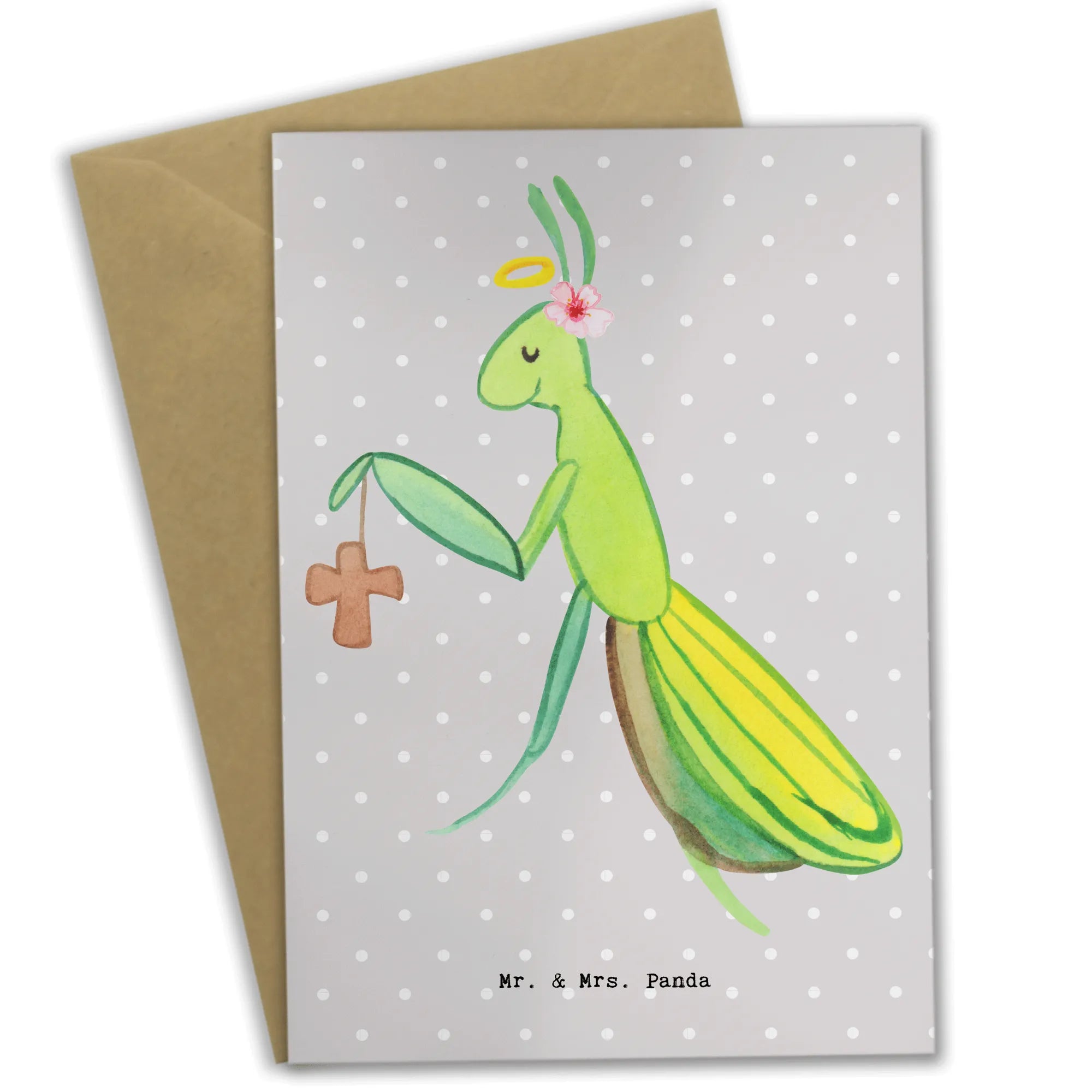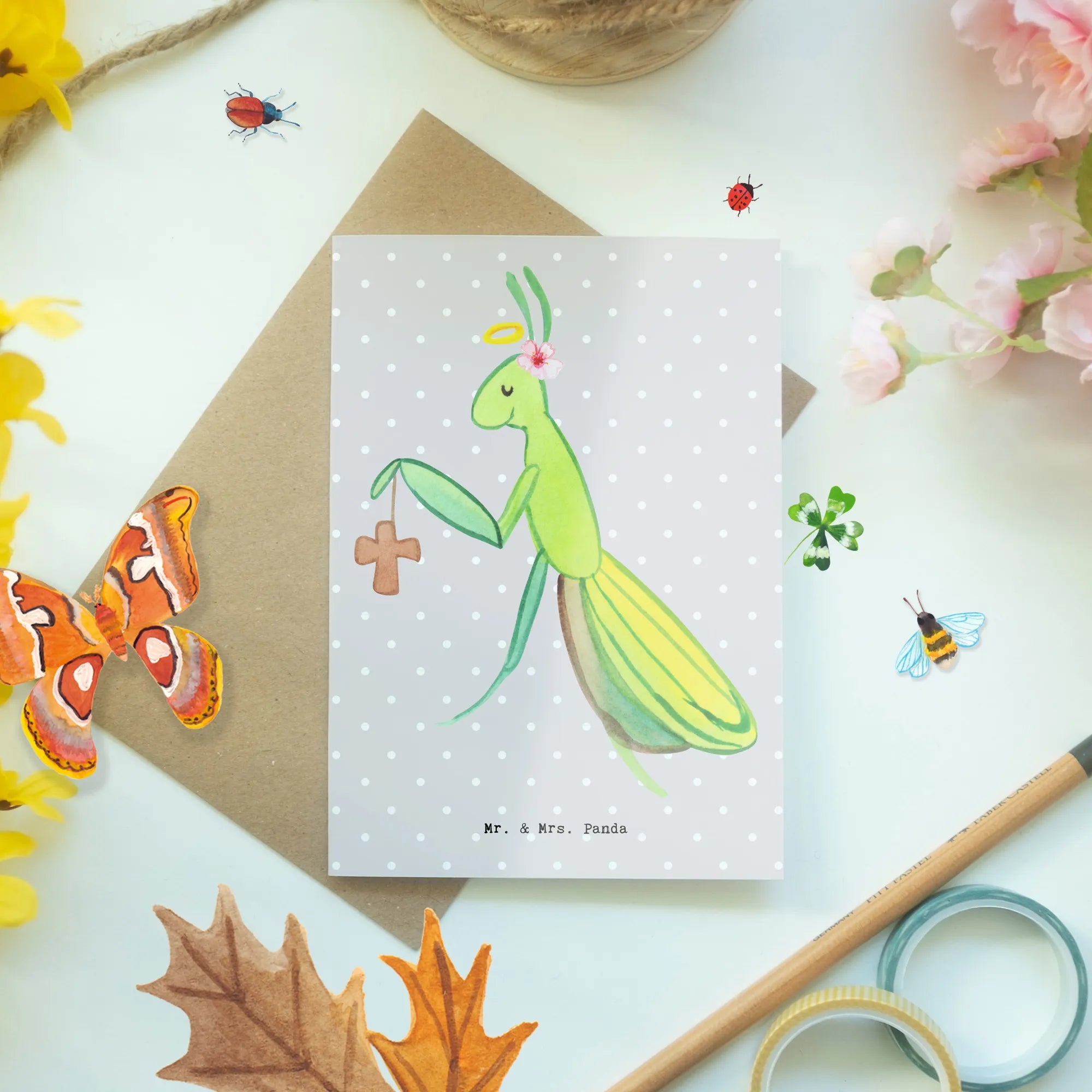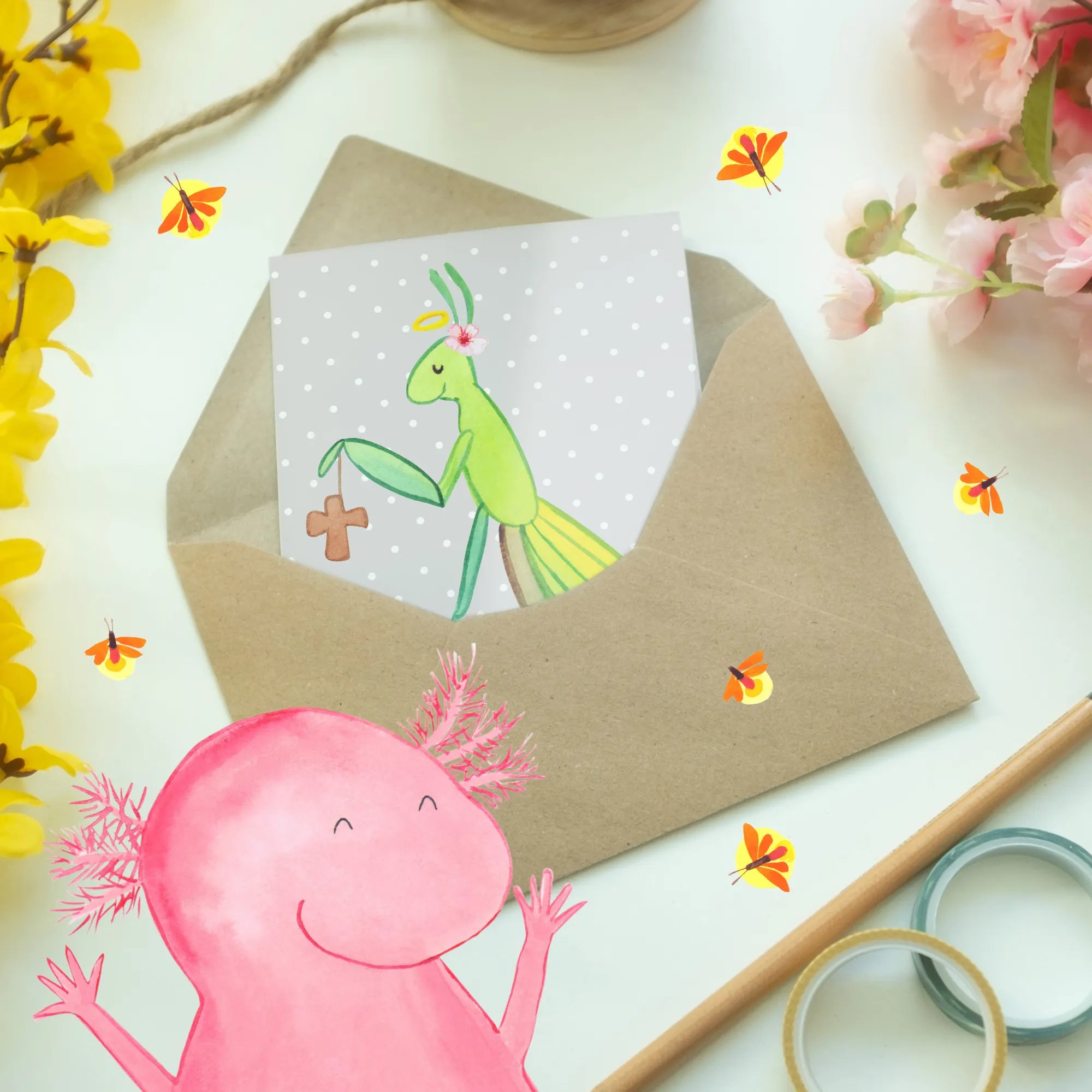 Egal ob zum Geburtstag, zum Abschied oder einfach nur so, mit dieser Karte zeigst du deine Dankbarkeit auf eine ganz besondere Weise. Die Vorderseite ist mit einem herzlichen Motiv geschmückt, das eine süße Gottesanbeterin mit einem Kreuz in der Hand und einem Heiligenschein zeigt. Die Karte ist ohne Text, sodass du deine persönlichen Glückwünsche und Gedanken ganz individuell hinzufügen kannst.