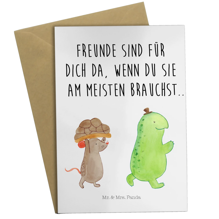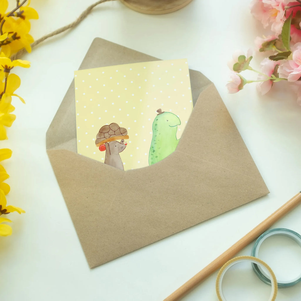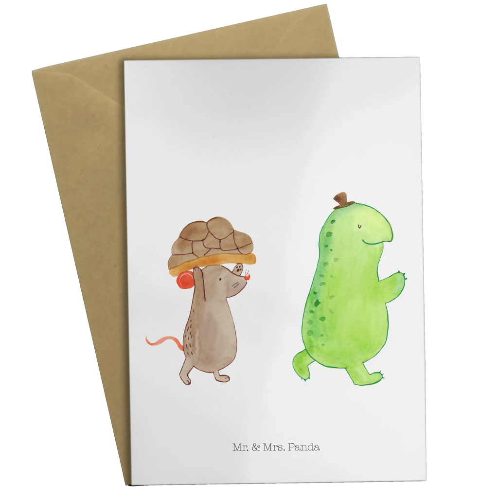 Die wundervolle Grußkarte von Mr. & Mrs. Panda mit dem süßen Motiv von Schildkröte und Maus ist das perfekte Geschenk für all deine besten Freunde und Freundinnen! Egal ob zum Geburtstag, zur Hochzeit oder einfach nur so, diese Karte zaubert jedem ein Lächeln ins Gesicht.