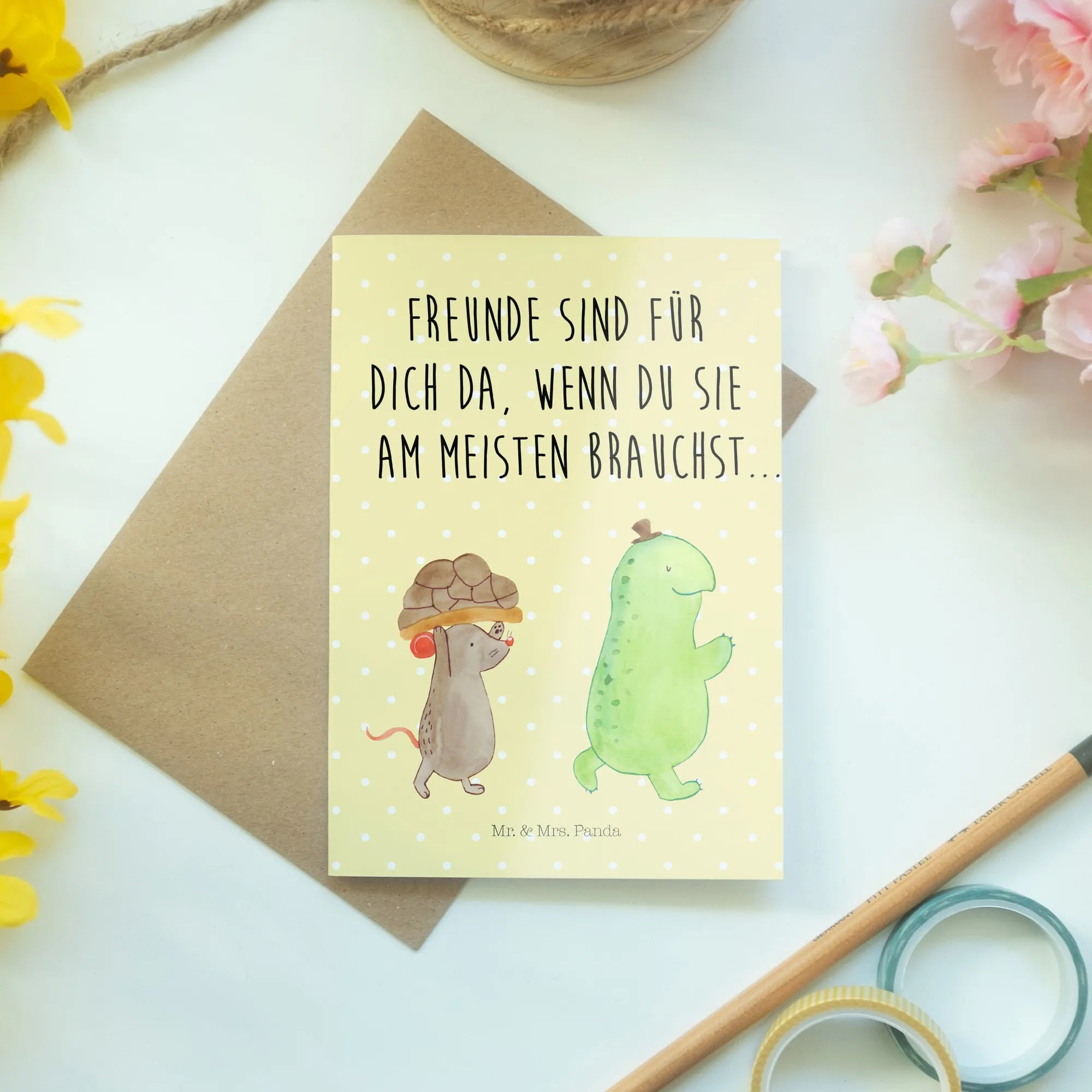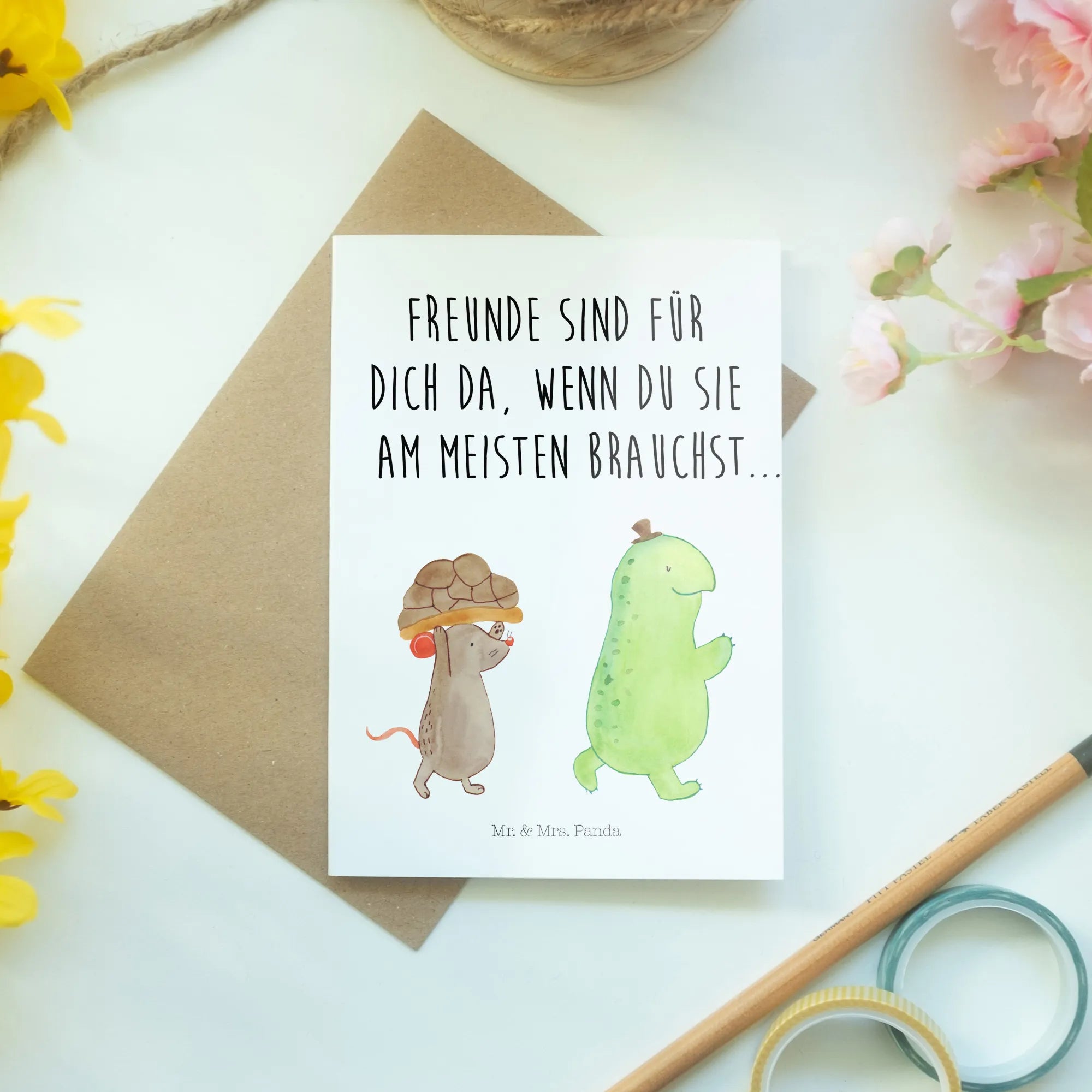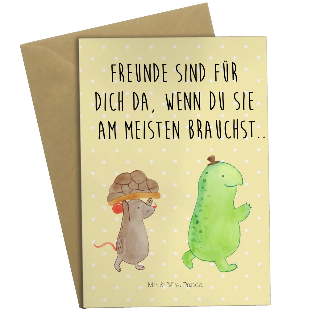Die wundervolle Grußkarte von Mr. & Mrs. Panda mit dem süßen Motiv von Schildkröte und Maus ist das perfekte Geschenk für all deine besten Freunde und Freundinnen! Egal ob zum Geburtstag, zur Hochzeit oder einfach nur so, diese Karte zaubert jedem ein Lächeln ins Gesicht.