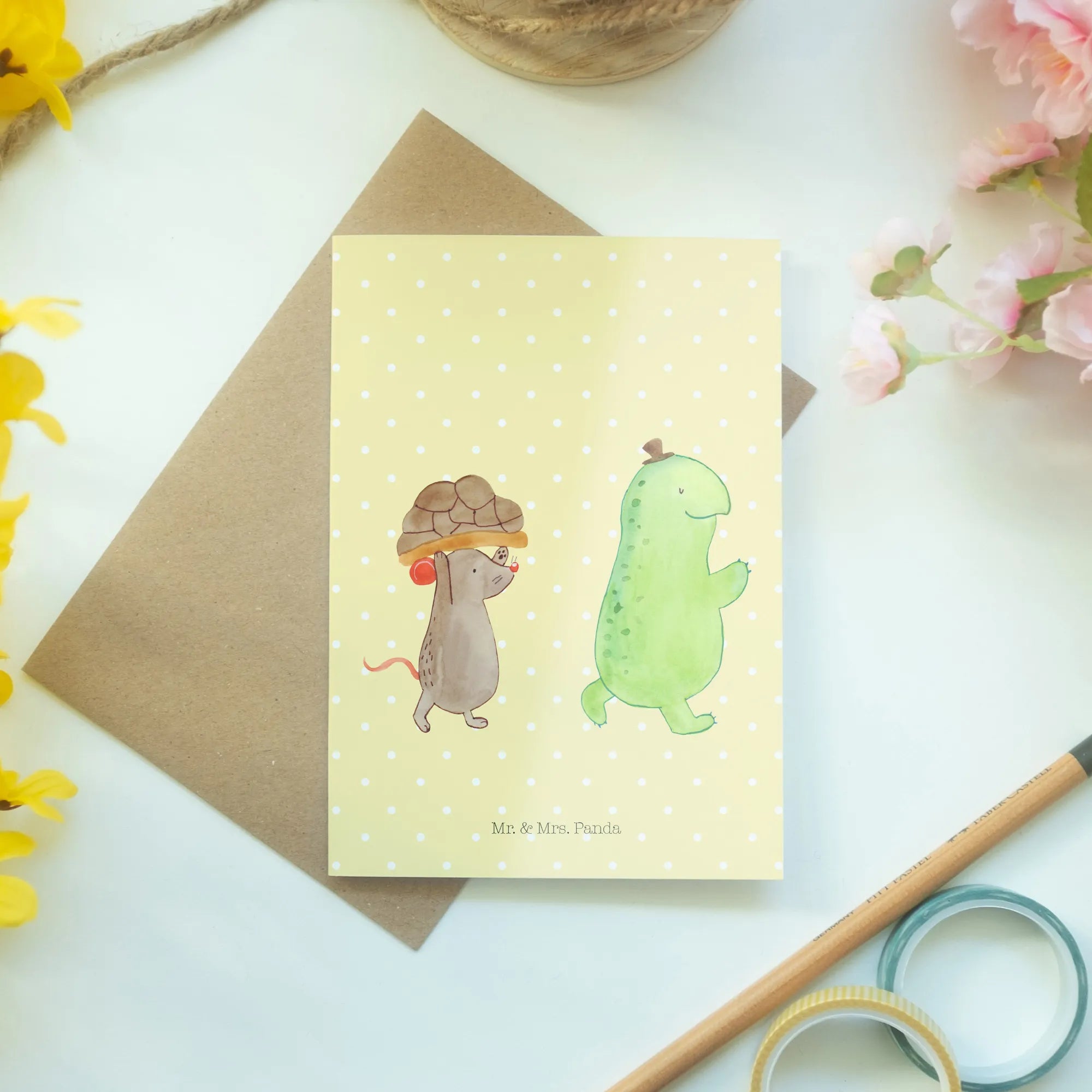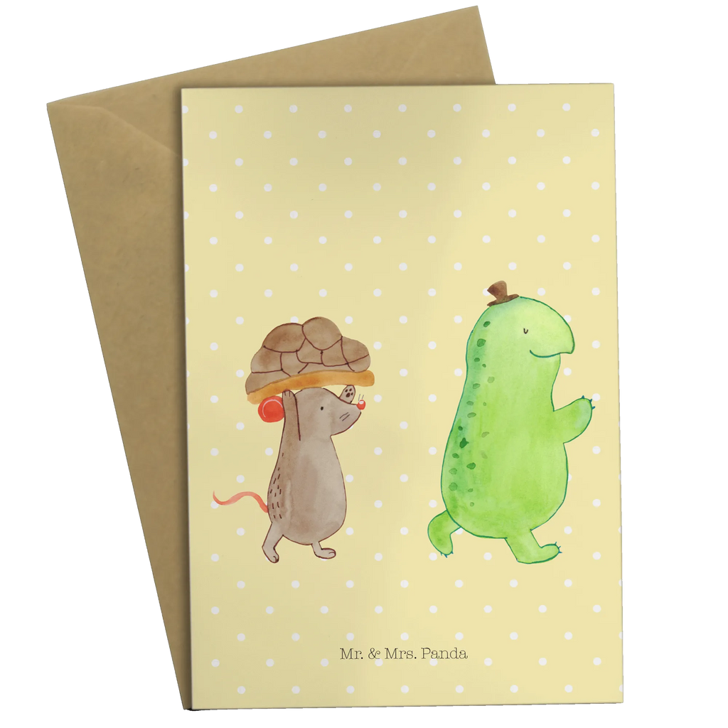 Die Mr. & Mrs. Panda Grußkarte Schildkröte & Maus ist ein einzigartiges, von Hand gezeichnetes Kunstwerk, das Herz und Seele verzaubert.