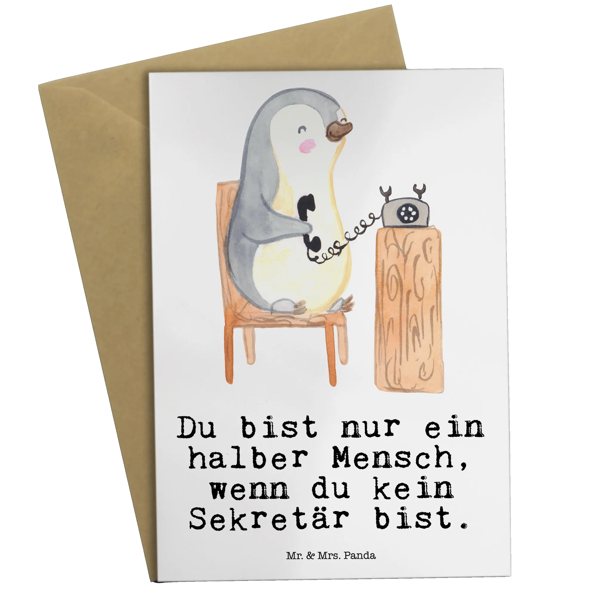 Die Grußkarte "Sekretär mit Herz" aus der Kollektion Berufe von Mr. & Mrs. Panda ist das perfekte Geschenk für alle Sekretäre und Sekretärinnen. Egal, ob zum Jobbeginn, zur Beförderung oder zum Abschied – diese Karte ist immer eine wunderbare Wahl, um Dankbarkeit und Wertschätzung auszudrücken. Sie zeigt einen süßen Pinguin, der am Telefon sitzt und Anrufe entgegen nimmt, perfekt für jeden, der in diesem Beruf arbeitet. Mit unserem Spruch "Du bist nur ein halber Mensch, wenn du kein Sekretär bist." bringt diese Karte ein Lächeln in den Büroalltag.