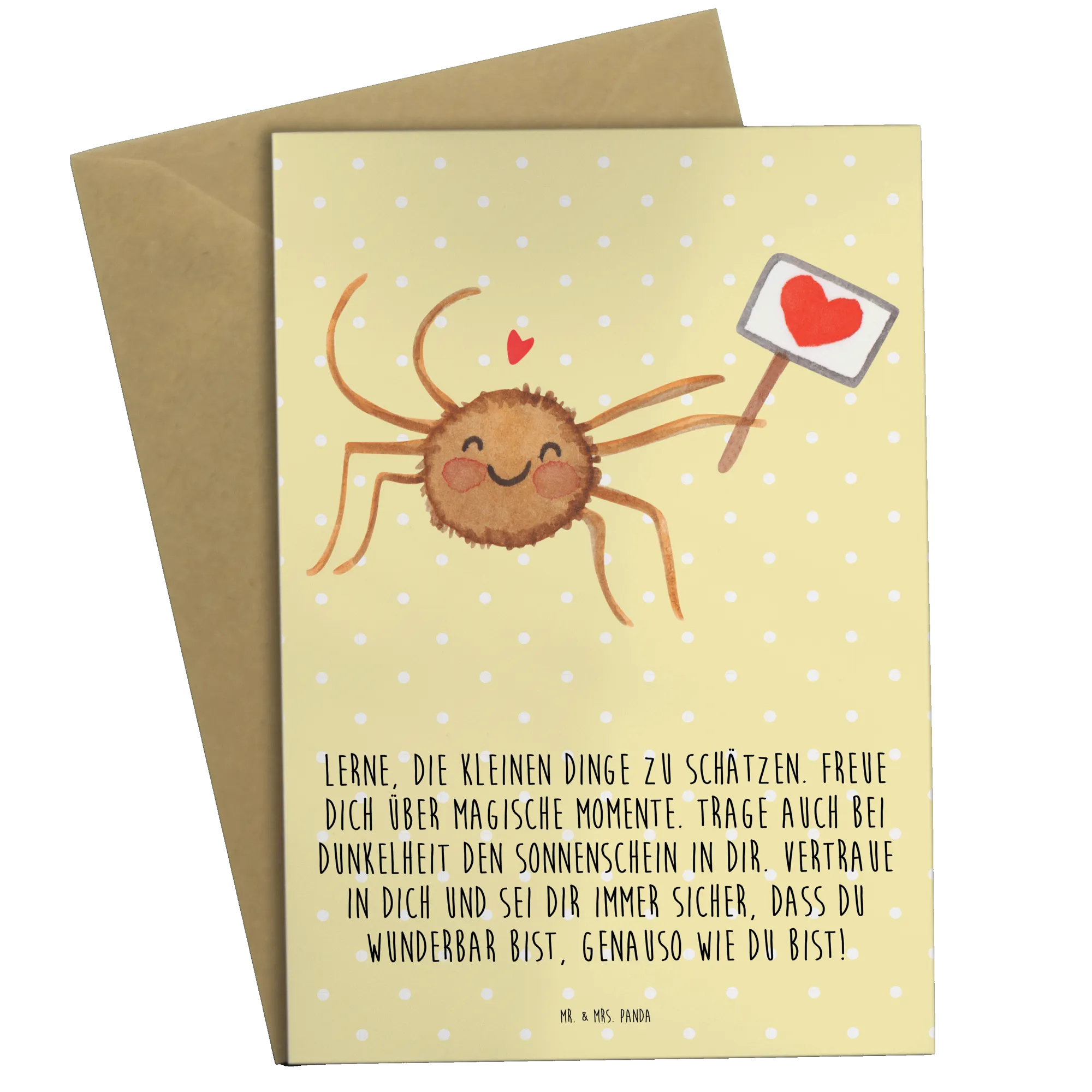 Entdecke die wunderschöne Grußkarte Spinne Agathe Motivation aus der zauberhaften Kollektion von Mr. & Mrs. Panda! Diese einzigartige Grußkarte ist die perfekte Wahl, um deine Gefühle auszudrücken und deinen Liebsten ein Lächeln ins Gesicht zu zaubern.