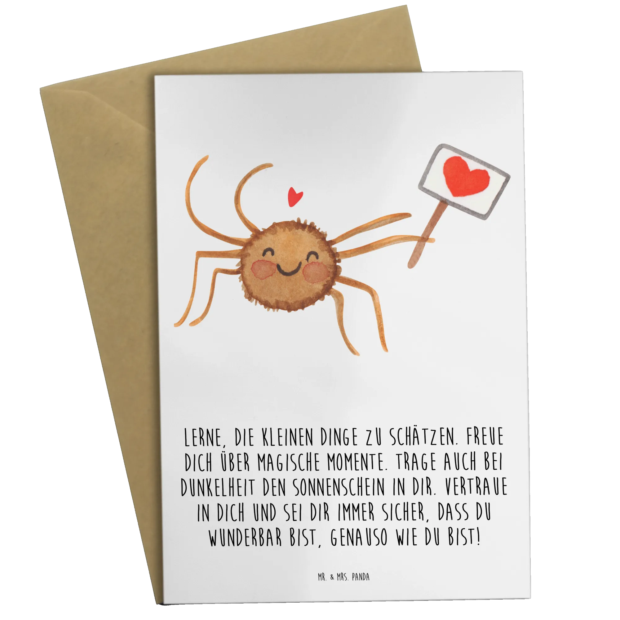Egal, ob du sie für einen besonderen Anlass suchst oder einfach einen lieben Menschen mit einer netten Botschaft überraschen möchtest, diese Grußkarte wird garantiert für ein Lächeln sorgen. Lass die kleine Spinne Agathe auch deinen Freunden und Familie Freude bringen und schenke ihnen diese wunderbare Grußkarte von Mr. & Mrs. Panda. Sie ist nicht nur ein einfaches Stück Papier, sondern ein kleines Kunstwerk, das Herzen berührt und Erinnerungen schafft.