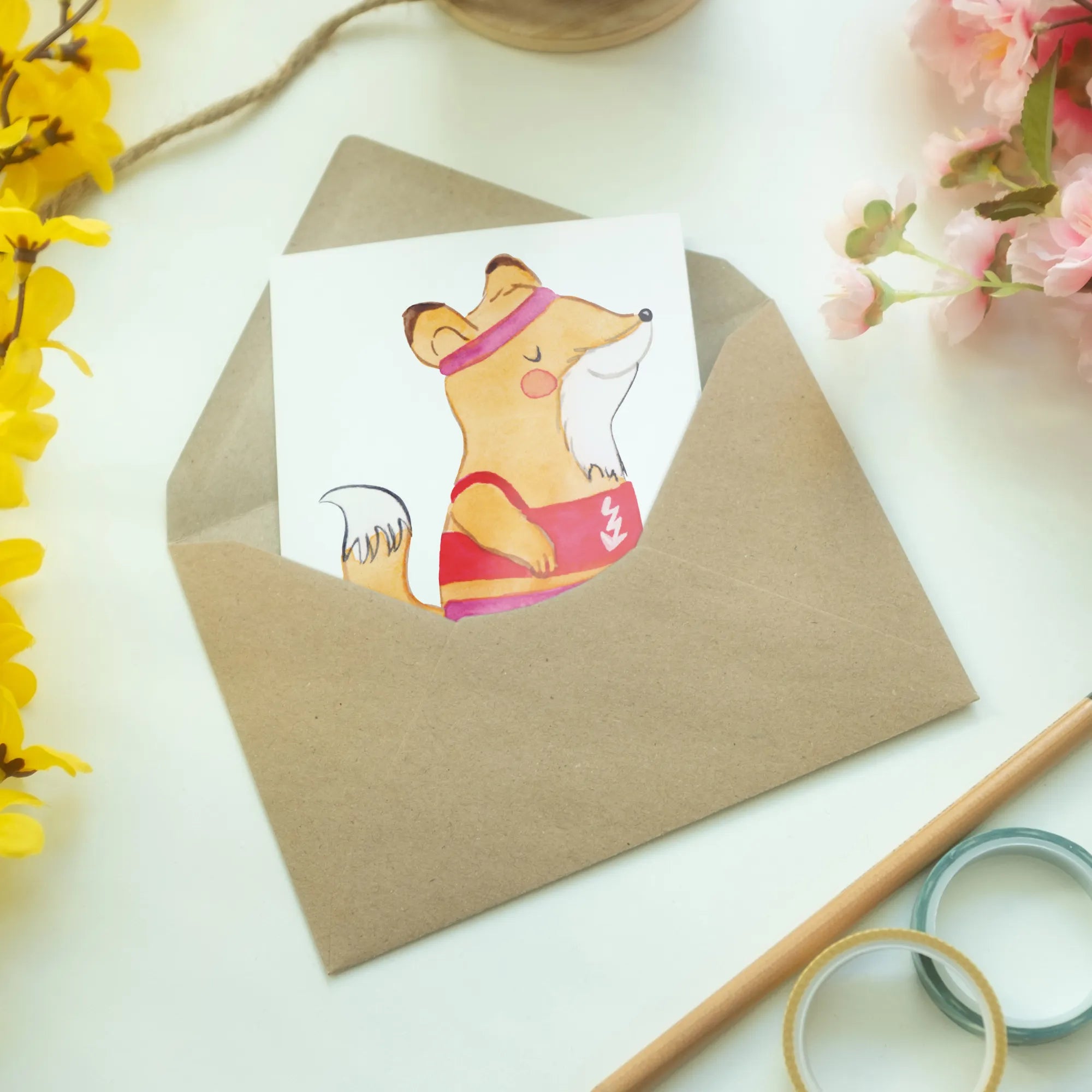 Jede Karte hat ein lieblich handgezeichnetes Motiv, das die Leidenschaft für den Sport widerspiegelt. Mit einem süßen Fuchs in einem Sport Outfit, der zeigt, dass man nur vollständig ist, wenn man auch Sportlerin ist, bringt diese Karte ein Lächeln auf das Gesicht des Empfängers.