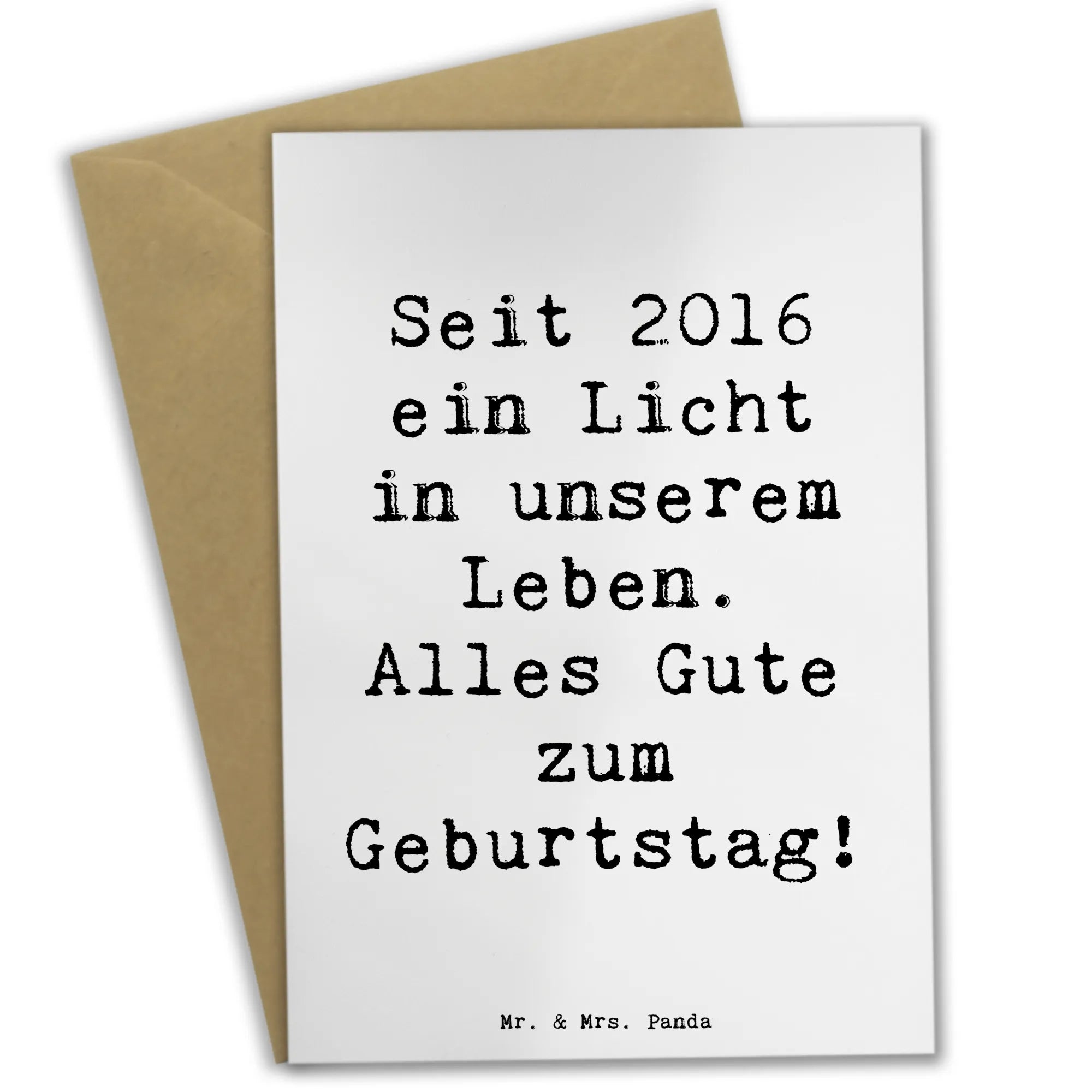 Die wunderschöne Grußkarte von Mr. & Mrs. Panda ist die perfekte Wahl, um einem besonderen Menschen zum Geburtstag zu gratulieren, insbesondere wenn er oder sie im Jahr 2016 geboren wurde. Diese Karte ist nicht nur ein Stück Papier, sondern ein Geschichtenerzähler voller Liebe und positiver Energie. Die hochglänzend veredelte Vorderseite mit dem liebevollen Spruch „Seit 2016 ein Licht in unserem Leben. Alles Gute zum Geburtstag!” strahlt Freude aus und bringt ein Lächeln auf die Lippen.