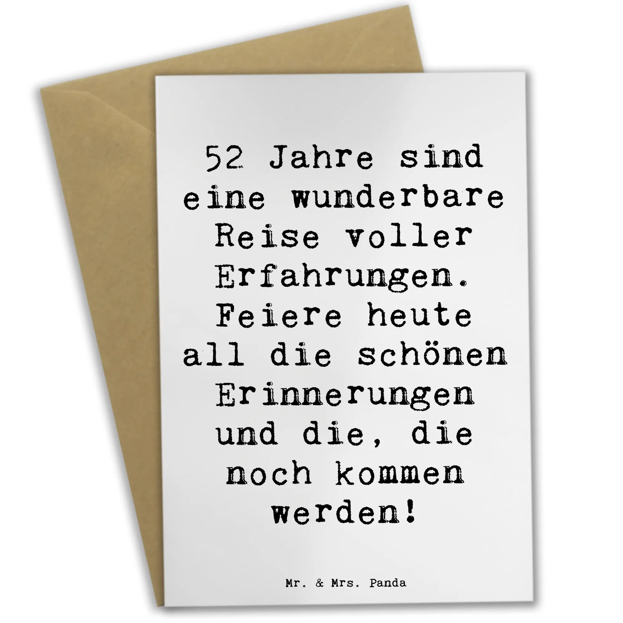 Die wunderschöne Grußkarte zum 52. Geburtstag von Mr. & Mrs. Panda ist das perfekte Geschenk für jeden, der diesen besonderen Tag feiern möchte. Mit dem liebevollen Spruch "52 Jahre sind eine wunderbare Reise voller Erfahrungen. Feiere heute all die schönen Erinnerungen und die, die noch kommen werden!" auf der Vorderseite bringt die Karte Freude und Wertschätzung mit sich.