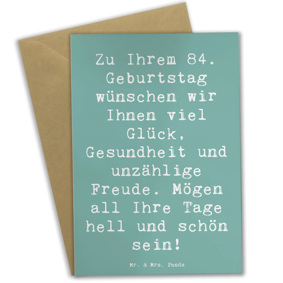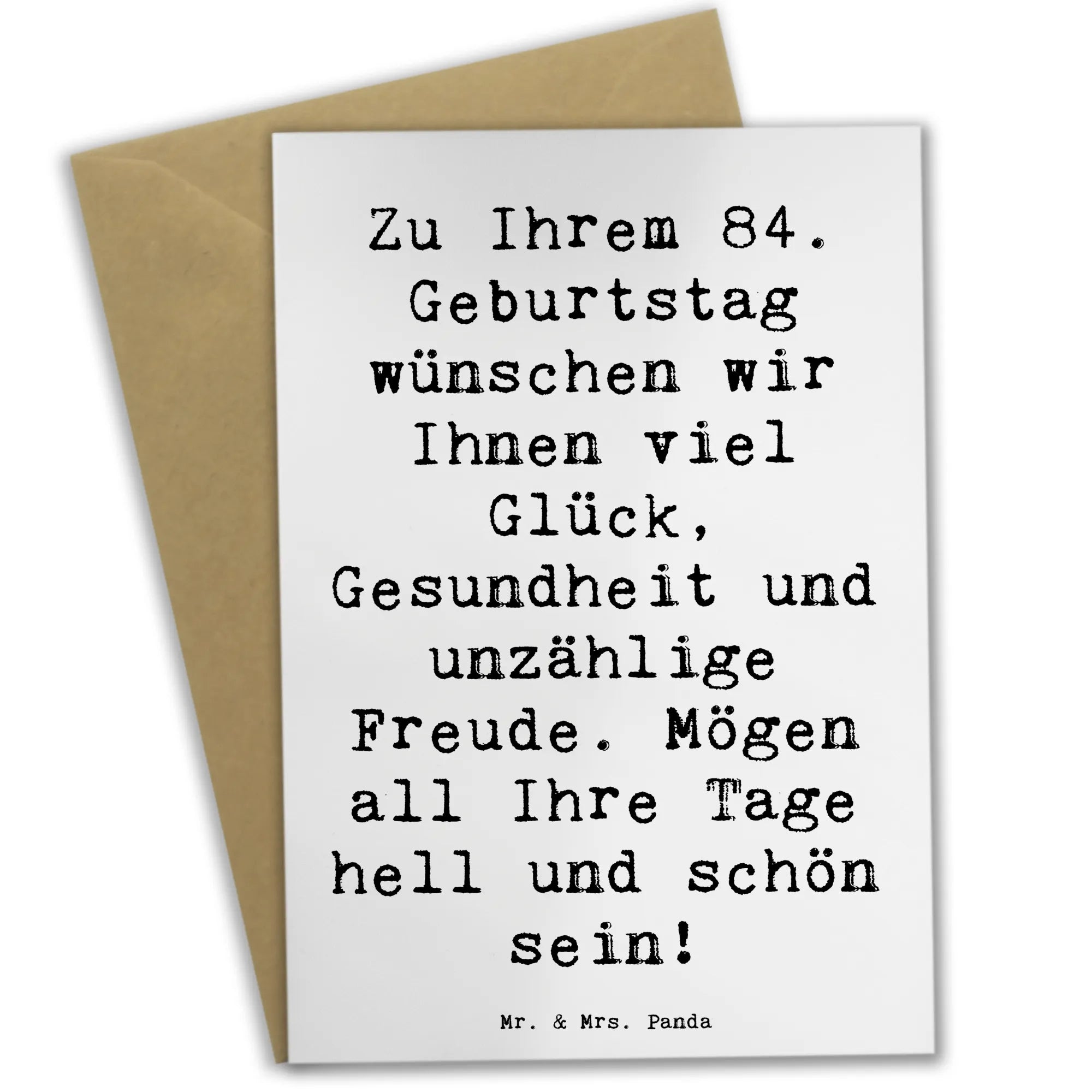Wenn Du auf der Suche nach einer ganz besonderen Grußkarte für den 84. Geburtstag bist, dann ist die Grußkarte von Mr. & Mrs. Panda genau das Richtige! Diese liebevoll gestaltete Karte kommt aus unserer exklusiven Kollektion "Geburtstag Alter" und eignet sich hervorragend, um Deine herzlichen Glückwünsche zu übermitteln. Mit dem wunderschönen Spruch "Zu Ihrem 84. Geburtstag wünschen wir Ihnen viel Glück, Gesundheit und unzählige Freude. Mögen all Ihre Tage hell und schön sein!" bringt diese Karte Freude und Wärme in den besonderen Tag des Jubilars.