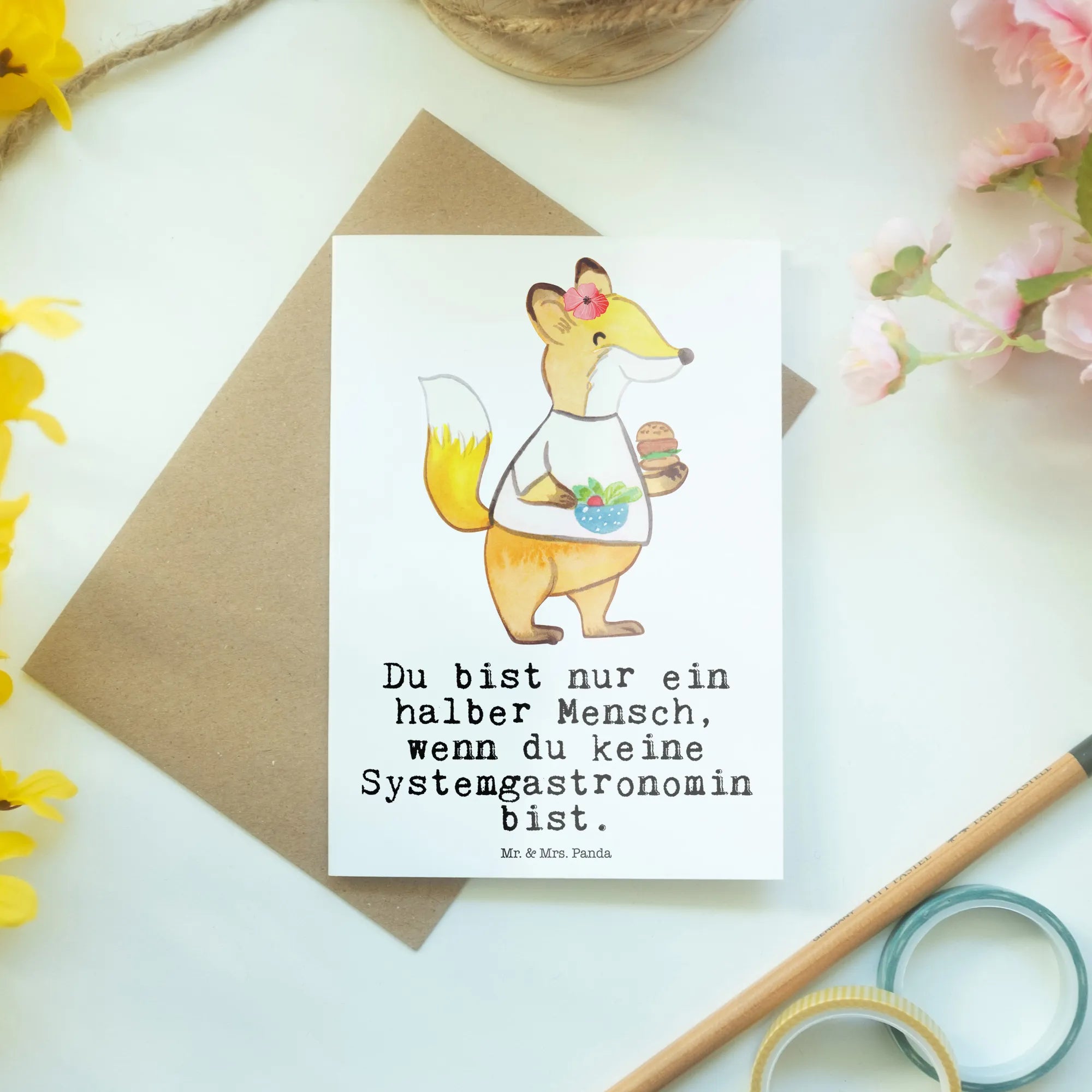 Mit dem Slogan "Du bist nur ein halber Mensch, wenn du keine Systemgastronomin bist" bietet die Grußkarte nicht nur eine liebenswerte Botschaft, sondern auch einen humorvollen Zugang, der die Beschenkten erfreuen wird.