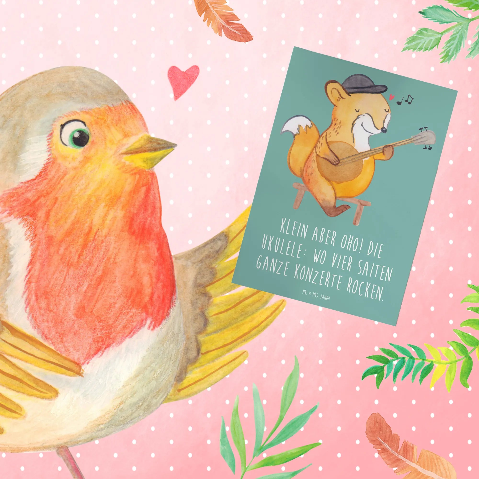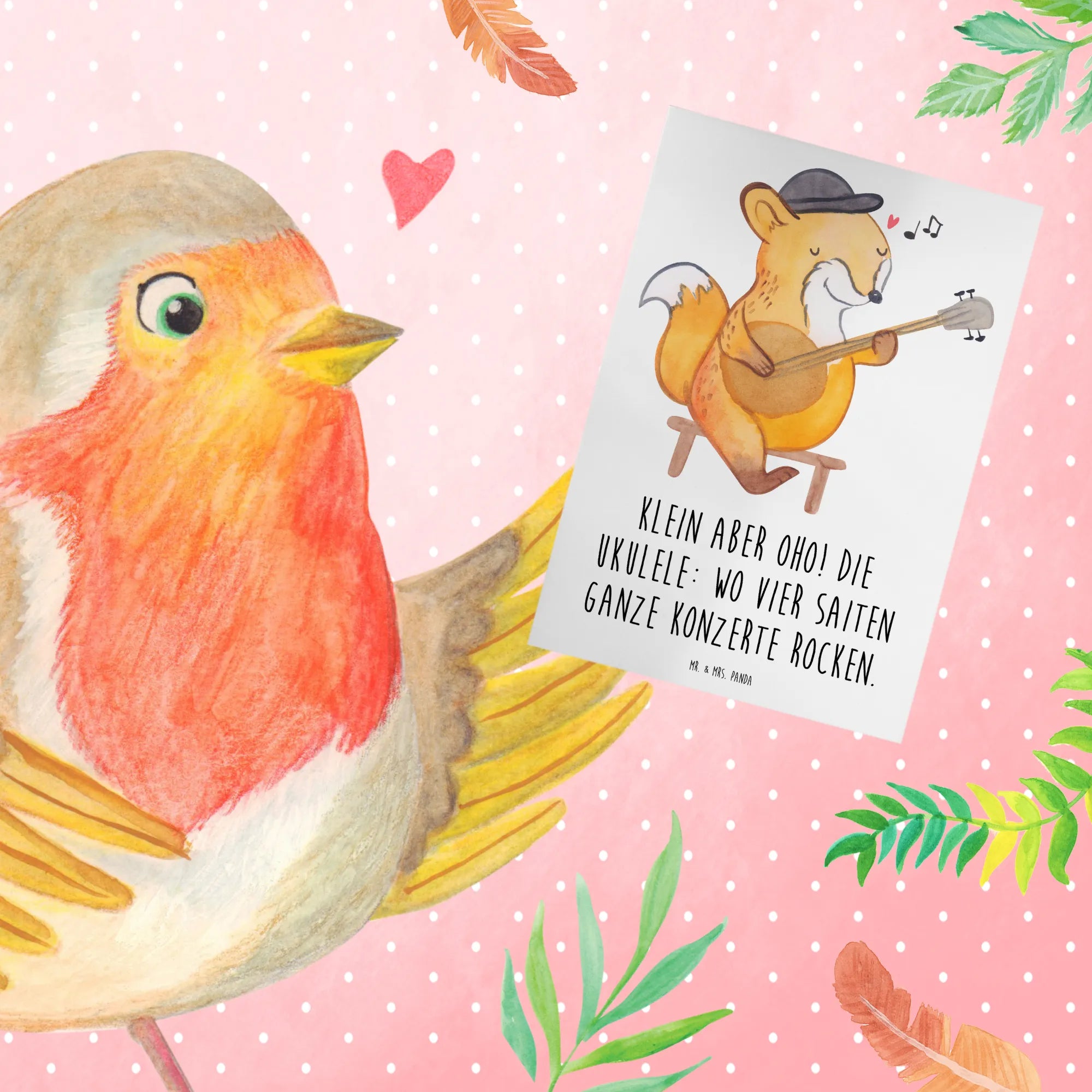 Die Grußkarte mit dem fröhlichen Ukulele-Motiv von Mr. & Mrs. Panda ist das perfekte Geschenk für alle Musikliebhaber und angehenden Musiker. Ob zu Geburtstagen, Hochzeiten oder einfach nur so, diese Karte bringt ein Lächeln in jedes Herz! Mit dem Slogan "Klein aber oho! Die Ukulele: wo vier Saiten ganze Konzerte rocken." versprüht sie einfach gute Laune.