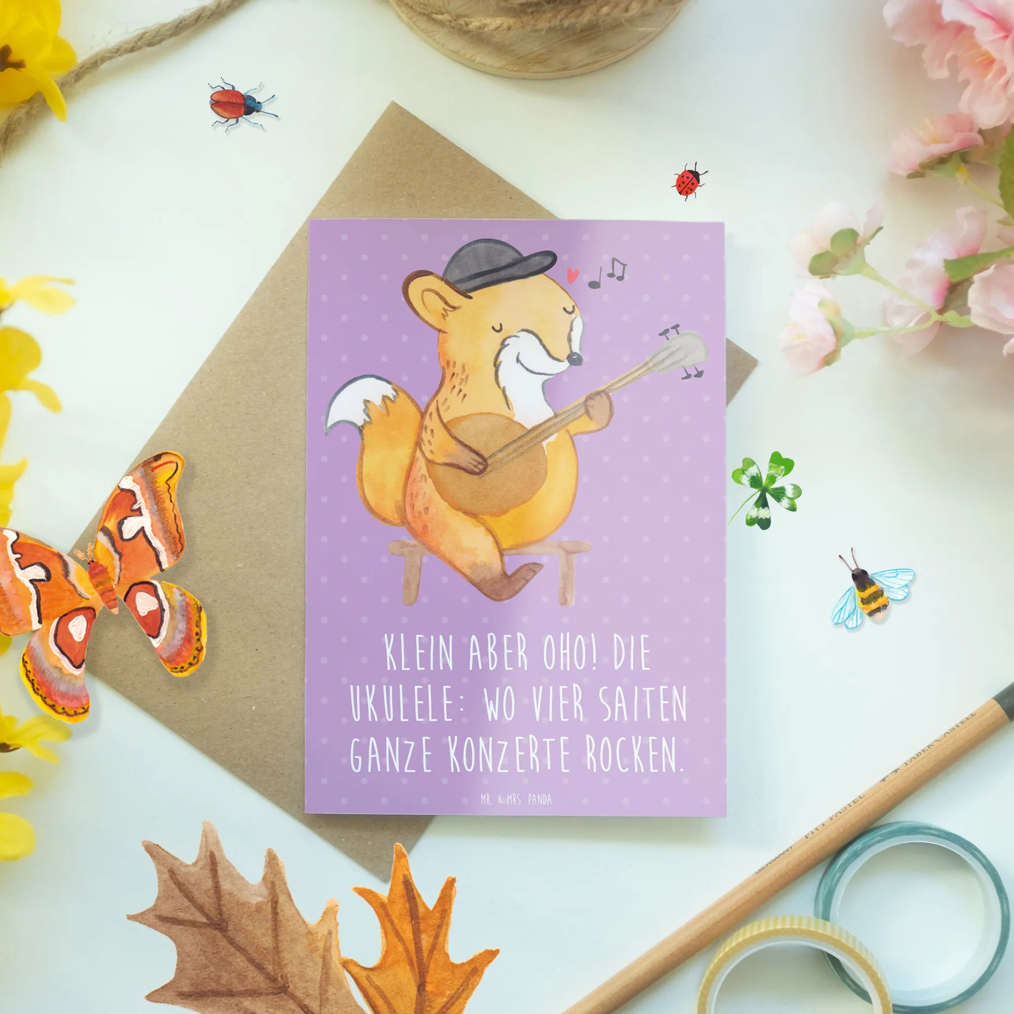 Ukulele Grußkarte von Mr. & Mrs. Panda – klein, fröhlich und voller Musik! Unsere Klappkarte zeigt eine bezaubernde Ukulele vor einem zarten Lavendeltraum-Hintergrund und trägt den charmanten Slogan: „Klein aber oho! Die Ukulele: wo vier Saiten ganze Konzerte rocken.“ Perfekt für alle, die Musik lieben und gern kleine, liebevolle Botschaften verschenken. 🎶