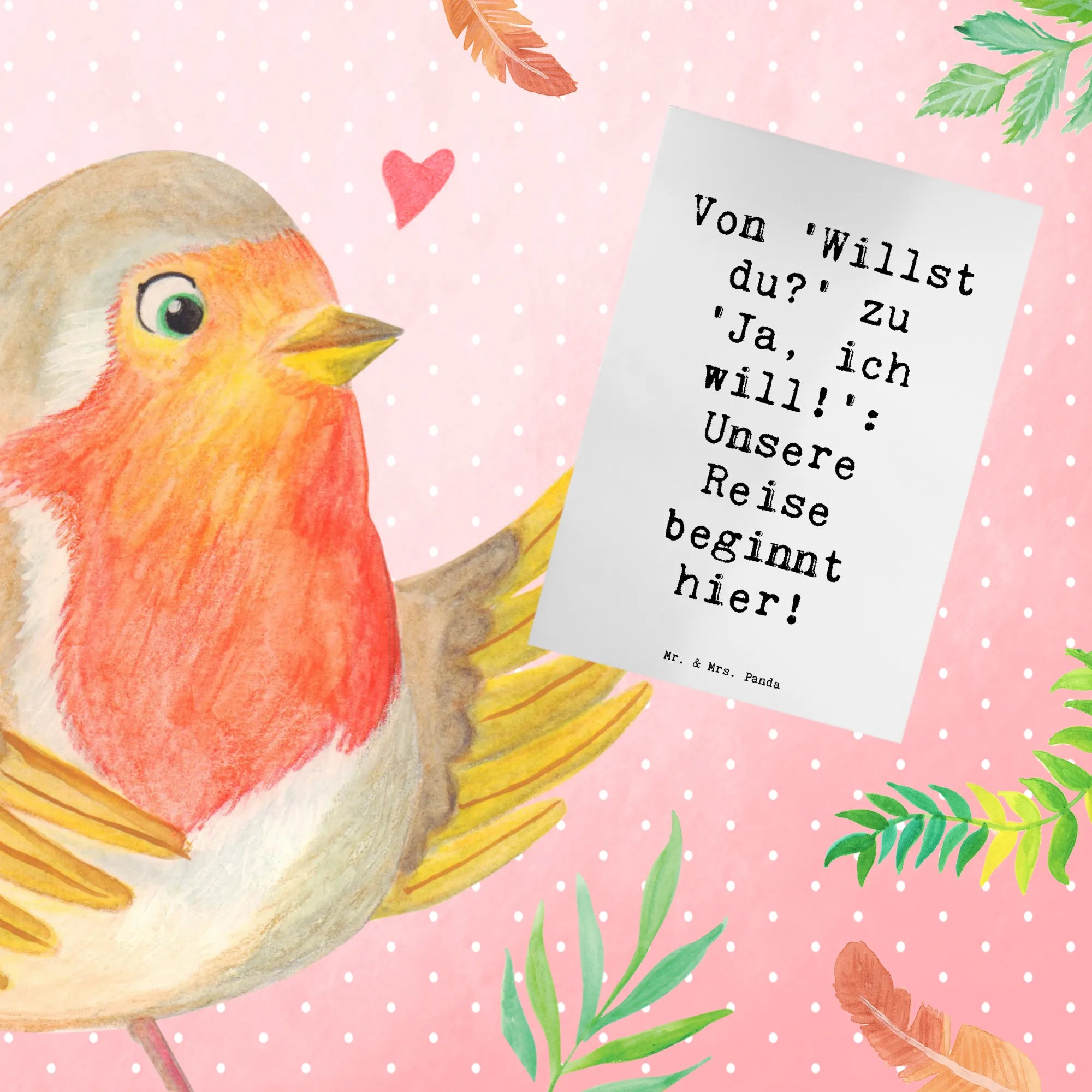 Die perfekte Grußkarte zur Verlobung aus unserer zauberhaften Hochzeit-Kollektion von Mr. & Mrs. Panda! Diese wunderschöne und einzigartige Grußkarte ist mehr als nur ein Stück Papier; sie ist ein Ausdruck von Liebe und Freude an einem der bedeutendsten Momente im Leben eines Paares. Egal, ob du die Karte für deinen eigenen Heiratsantrag oder als liebevolles Geschenk für eine verlobte Freundin wählst, sie wird das Herz berühren. Mit dem berührenden Spruch 'Von 'Willst du?' zu 'Ja, ich will!': Unsere Reise beginnt hier!' fängt die Karte den Zauber des Moments ein.