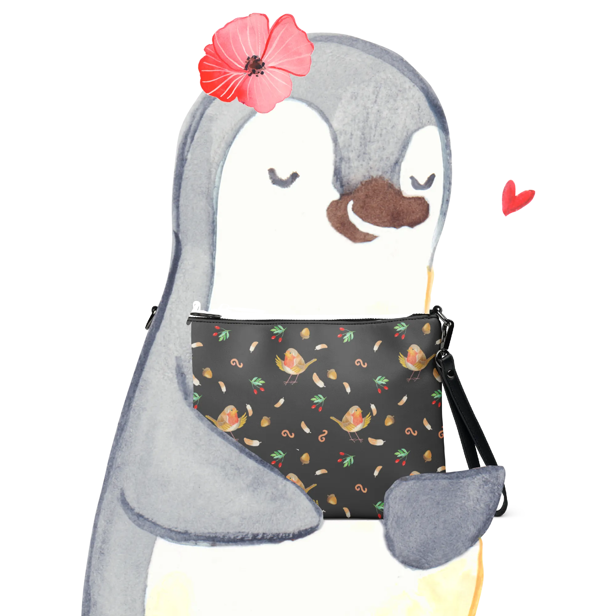 Unsere liebevoll gestaltete Mr. & Mrs. Panda Handtasche „Rotkehlchen mit Federn“ vereint zartes Aquarelldesign mit praktischem Alltagstalent. Das kleine Rotkehlchen ist umgeben von bunten Federn und trägt den ermutigenden Spruch: „What if I fall? / Oh, but my darling, / what if you fly?“ – eine schöne Erinnerung daran, mutig zu sein.