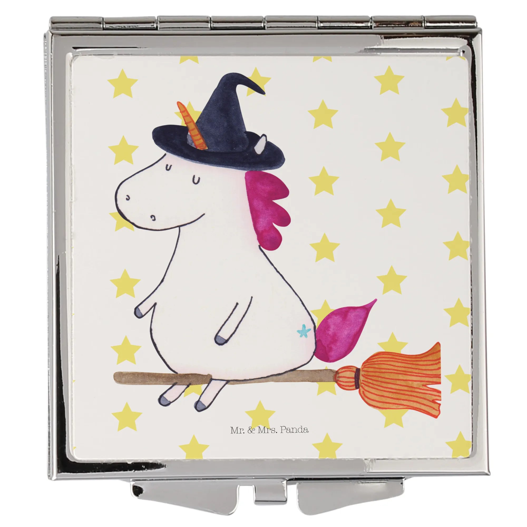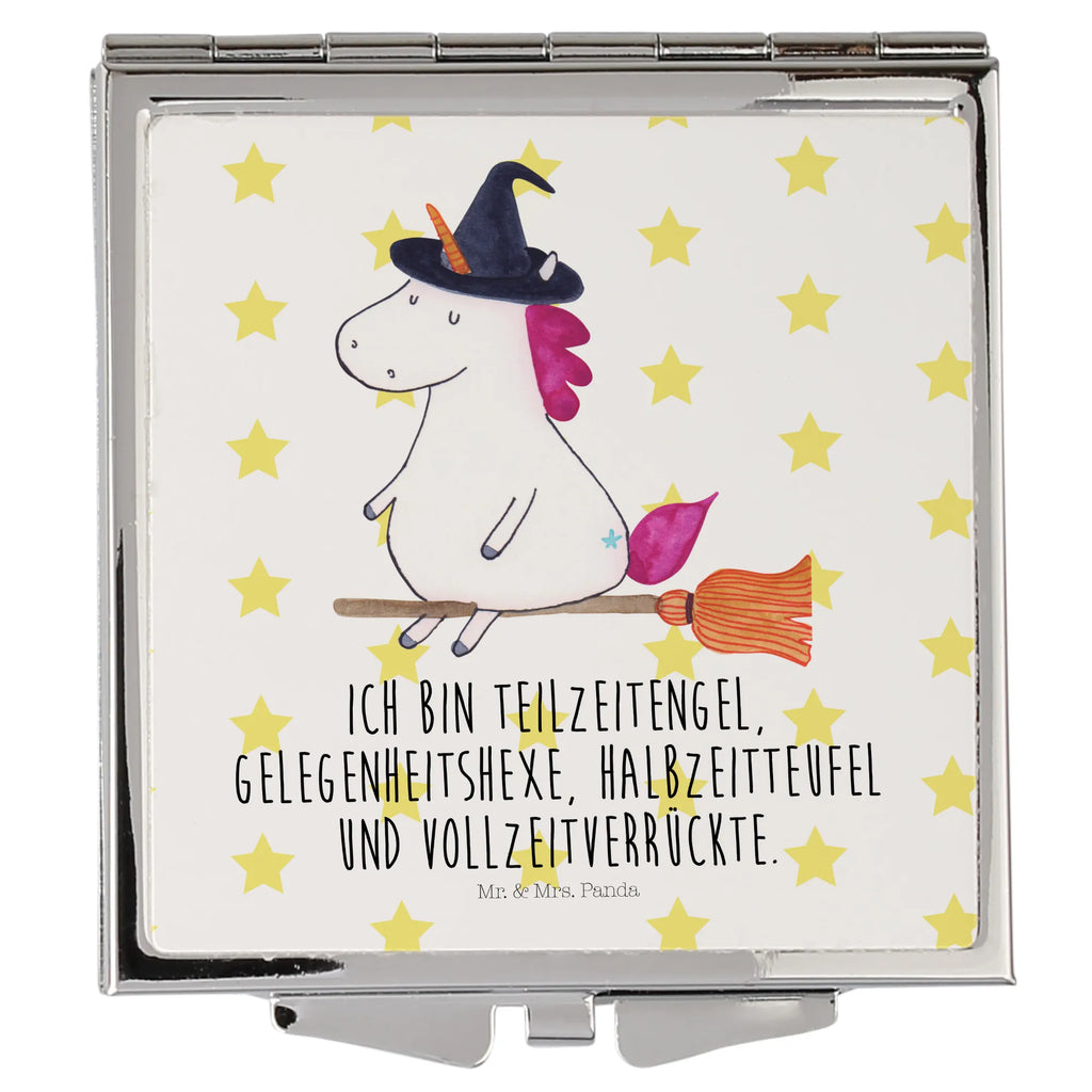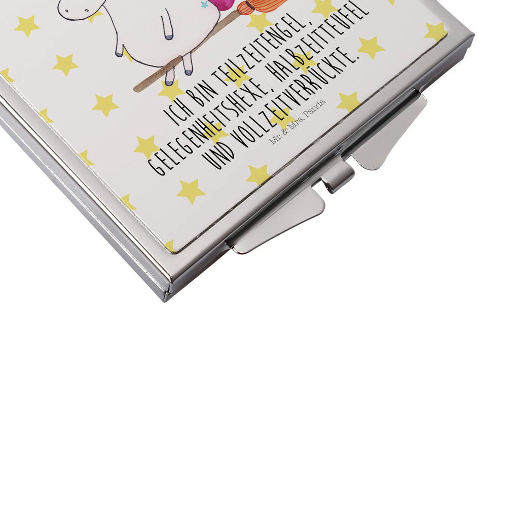 Ein funkelnder Begleiter für Einhorn-Fans: Der quadratische Handtaschenspiegel von Mr. & Mrs. Panda mit dem süßen Einhorn-Hexen-Motiv ist das perfekte Accessoire für alle, die Humor, Magie und Einhörner lieben. Das Motiv zeigt ein niedliches Einhorn mit Hexenhut auf einem Besen und den frechen Spruch: „Ich bin Teilzeitengel, Gelegenheitshexe, Halbzeitteufel und Vollzeitverrückte.“