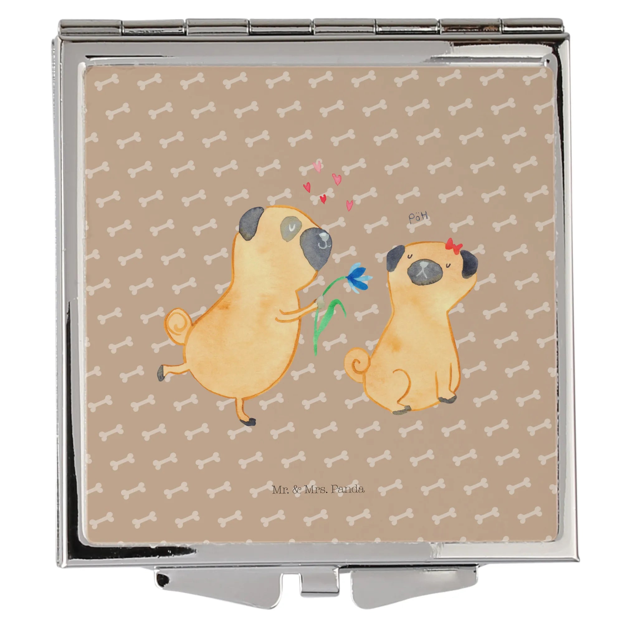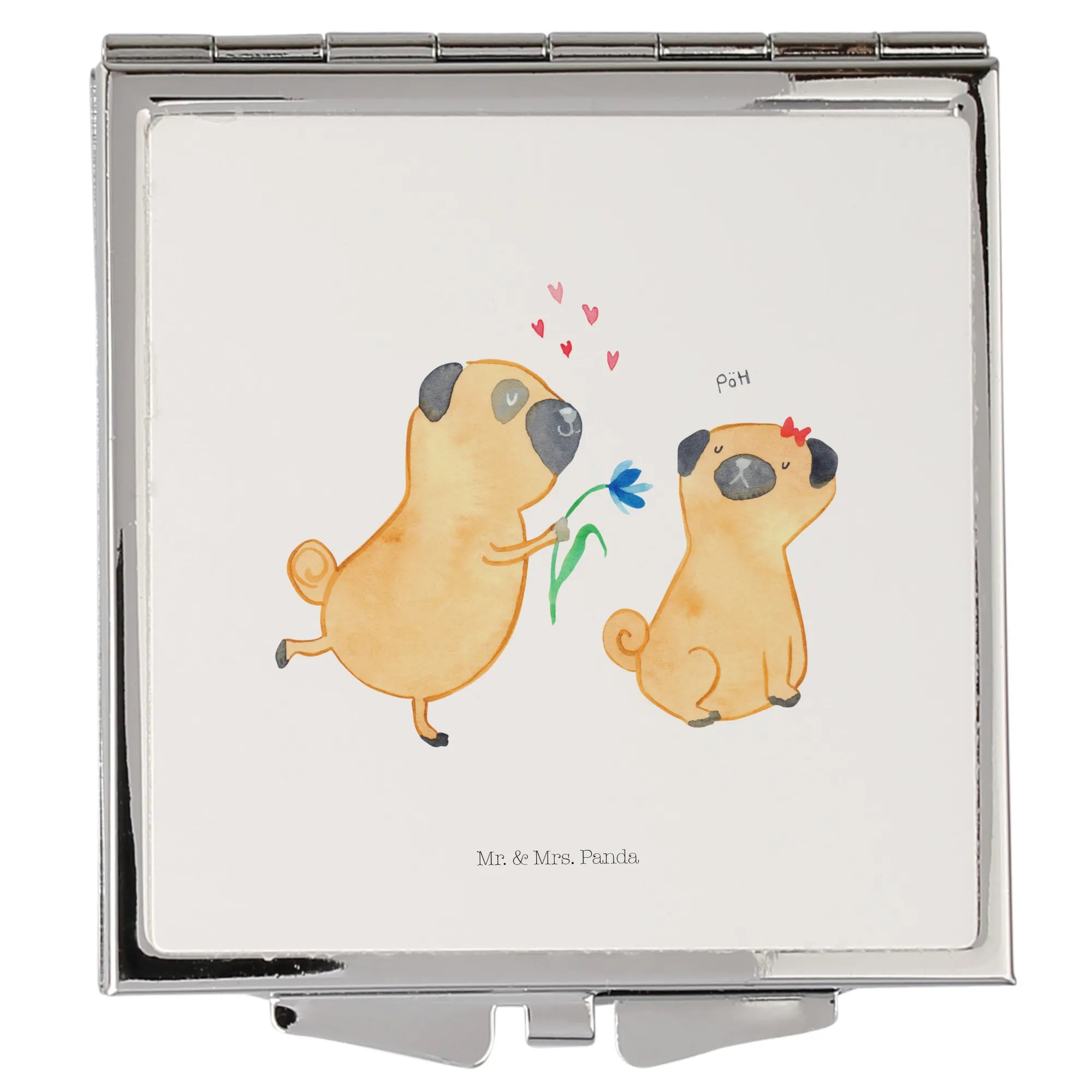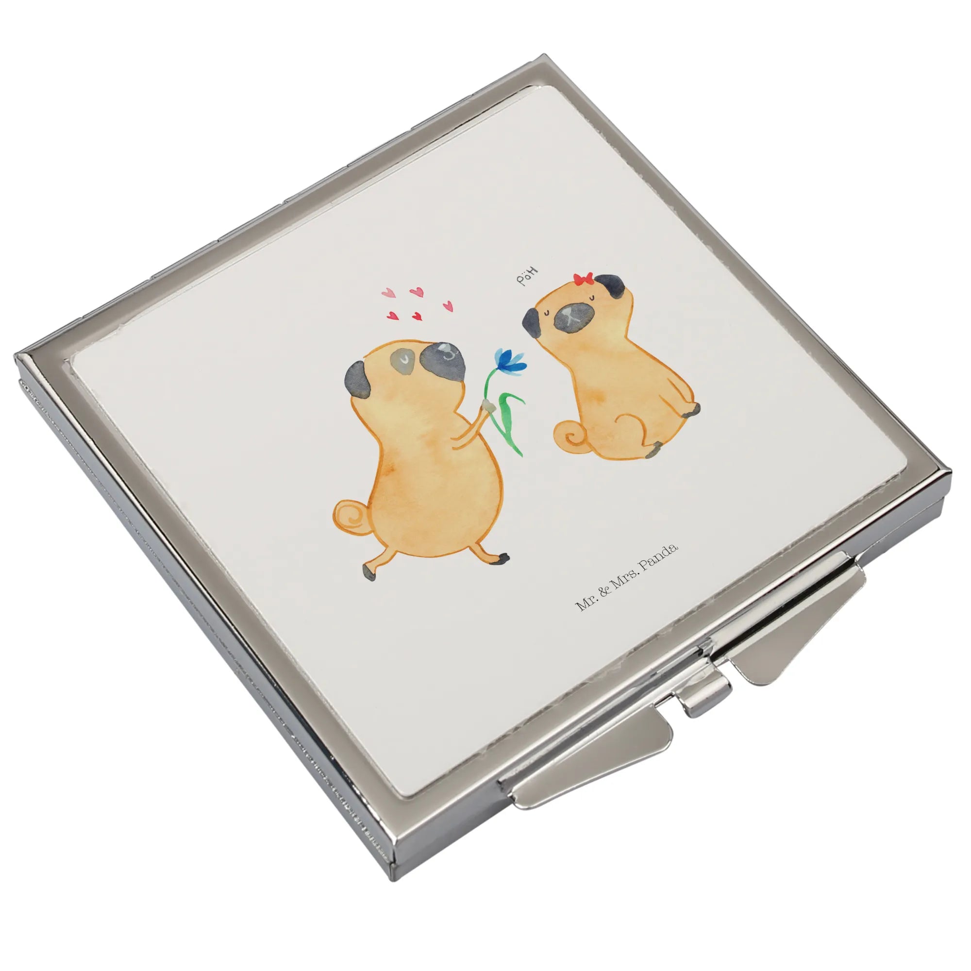 Quadratischer Handtaschenspiegel „Mops verliebt" – süßes Geschenk aus der Hunde Kollektion