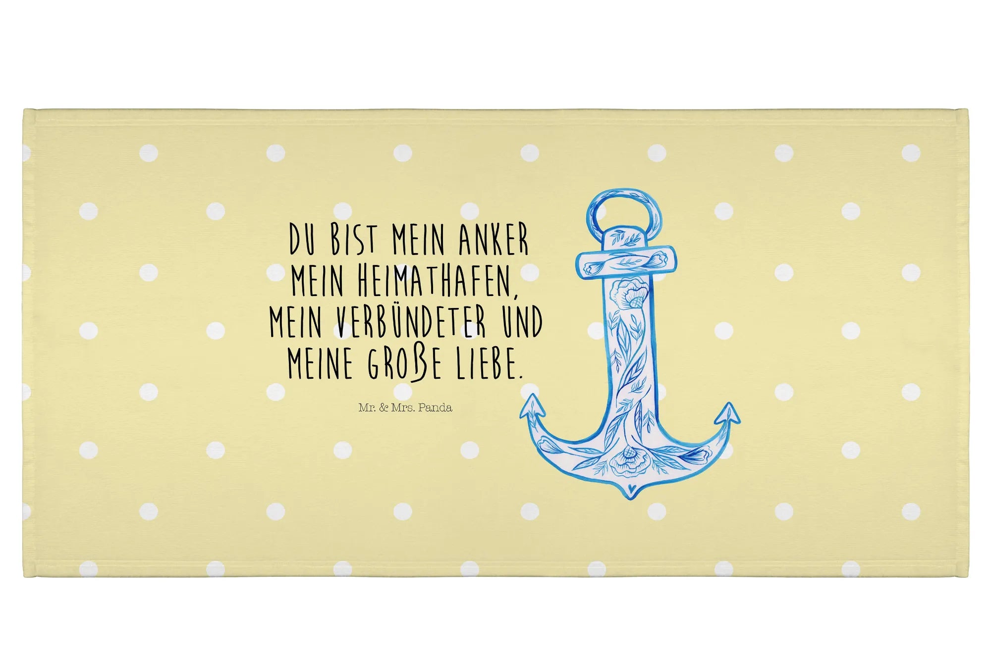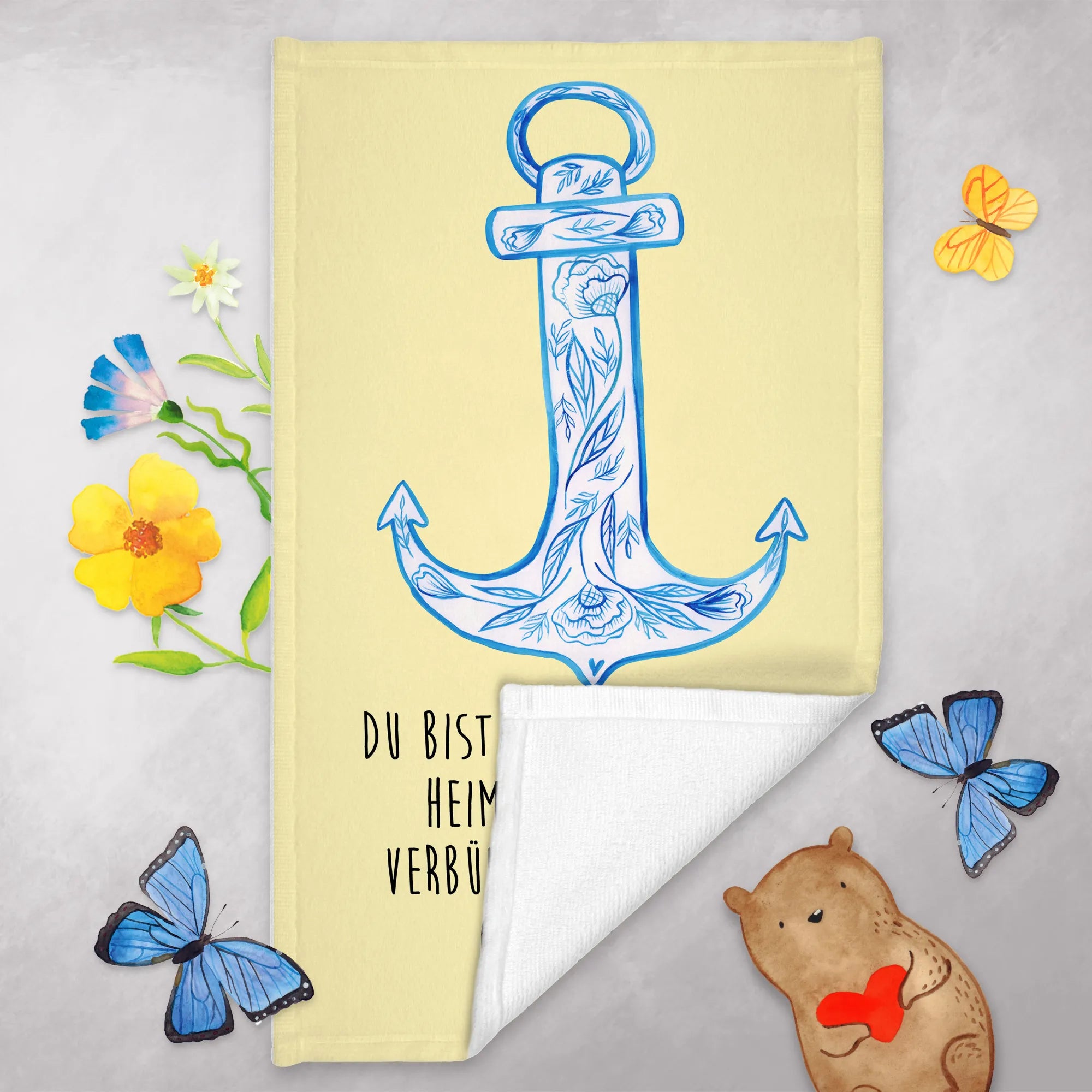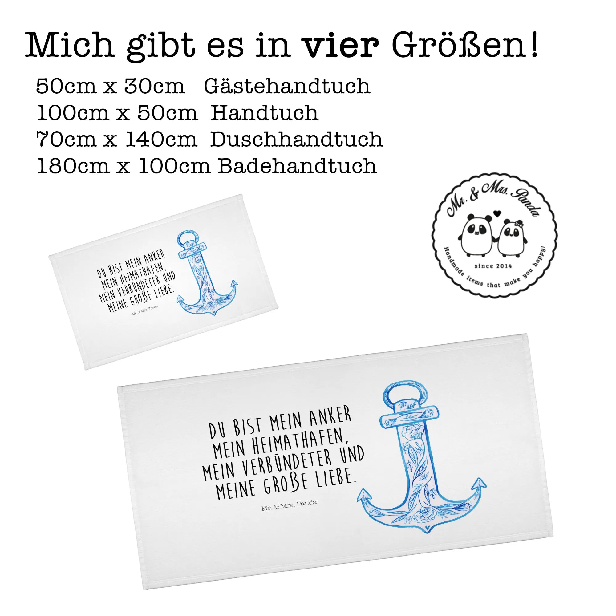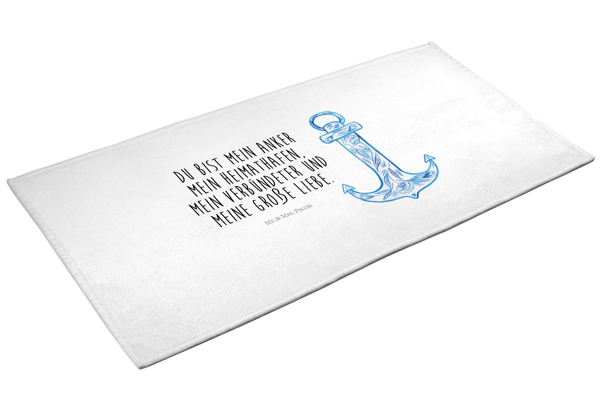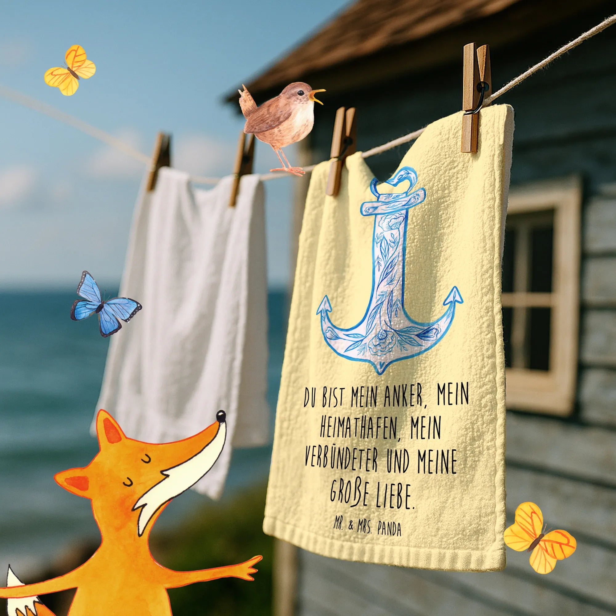 Das liebevoll gestaltete Gästehandtuch Anker Blau von Mr. & Mrs. Panda bringt nicht nur Farbe, sondern auch eine Portion Lebensfreude in jedes Badezimmer! Mit seinem maritimen Motiv und dem inspirierenden Slogan "Du bist mein Anker, mein Heimathafen, mein Verbündeter und meine große Liebe" verwandelt dieses Handtuch dein Gäste- oder Badezimmer in eine Wohlfühloase.