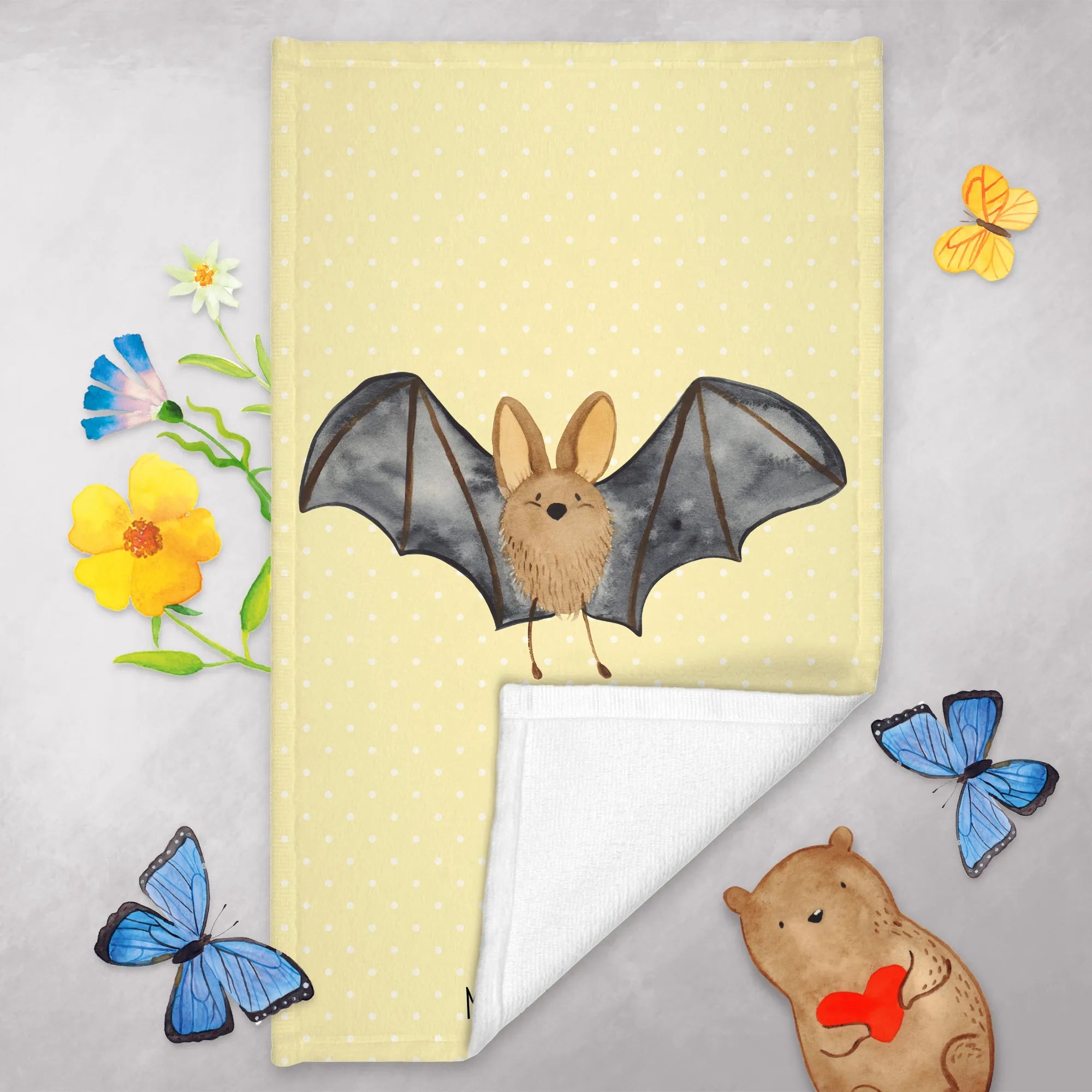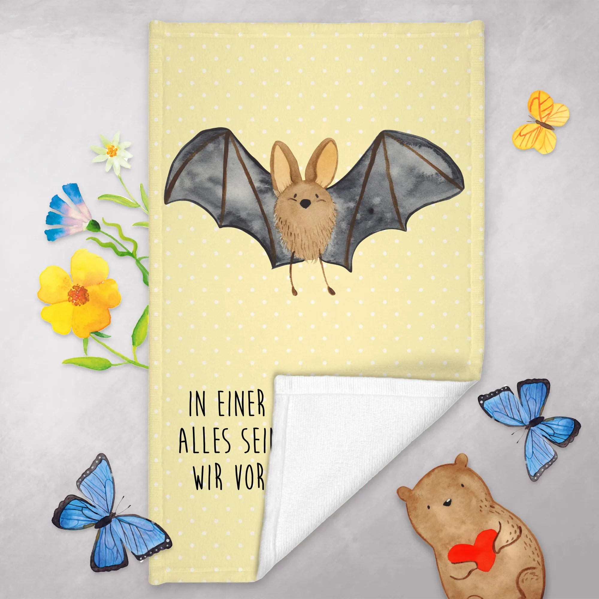 Die kleine Fledermaus, die über das Handtuch fliegt, erinnert jeden daran, dass wir in einer Welt leben, in der wir alles sein können. Und das Wichtigste ist, glücklich zu sein! Dieses Handtuch ist ideal für fröhliche Anlässe und Gespräche. Schenke es Freunden zur Einweihung, für den Geburtstag oder einfach als kleine Aufmerksamkeit – es wird mit Sicherheit ein Lächeln hervorrufen!
