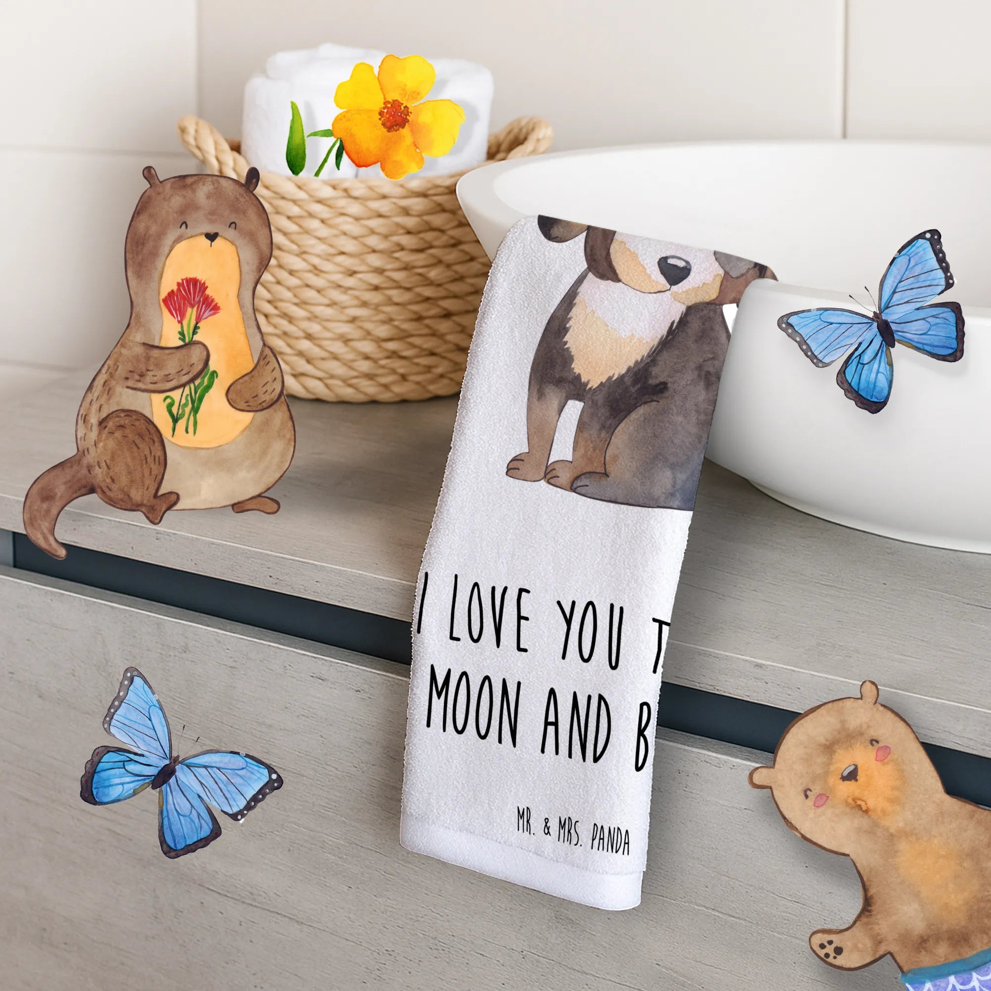 Das Gästehandtuch 'Hund entspannt' von Mr. & Mrs. Panda ist das perfekte Geschenk für jeden Hundeliebhaber! Mit einem süßen schwarz-weißen Hund, der entspannt dasteht, und dem liebevollen Spruch 'I love you to the moon and back.' bringt dieses Handtuch sofort gute Laune in dein Gästebad oder Badezimmer. Die bunten Farben beleben jeden Raum und das extra weiche Material aus flauschiger Baumwollmischung ist nicht nur ein Genuss für die Haut, sondern auch besonders langlebig.