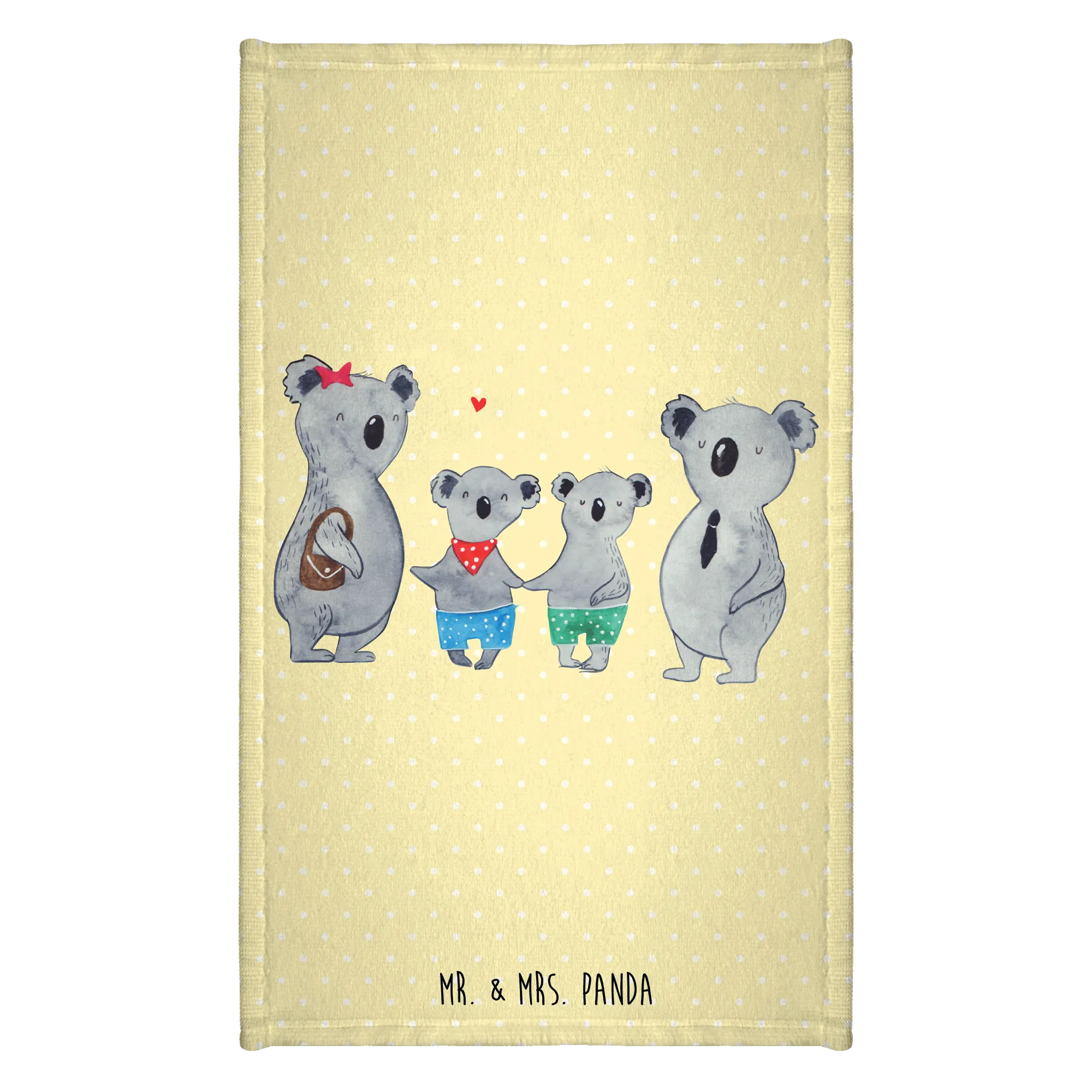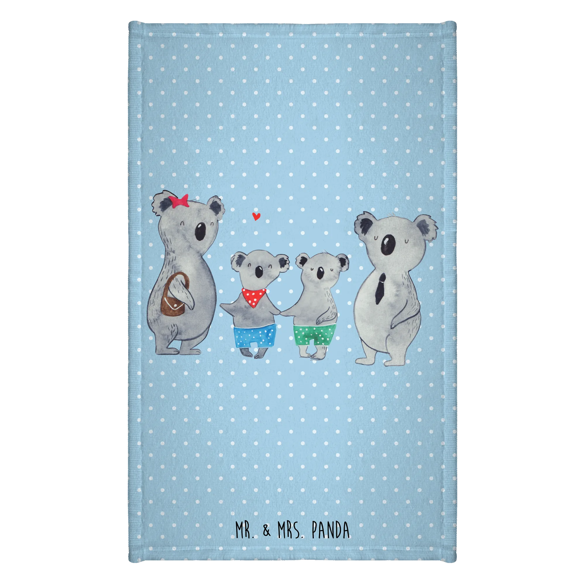 Eine Mutterkoala mit einem niedlichen roten Sternchen im Haar und ein fröhlicher Vaterkoala in Anzug und Krawatte, umgeben von zwei kleinen Koalas in bunter Kleidung, machen dieses Handtuch zu einem ganz besonderen Hingucker.