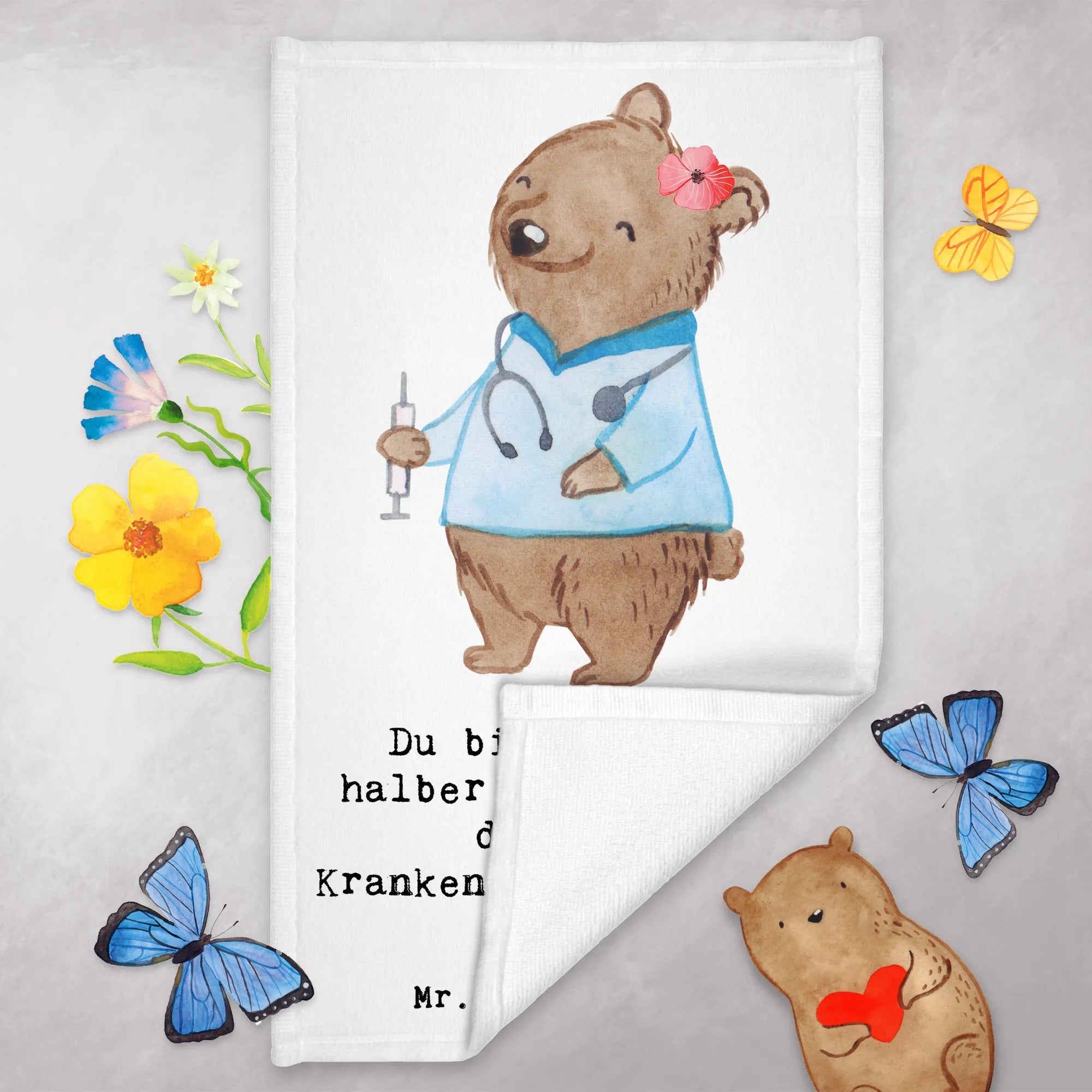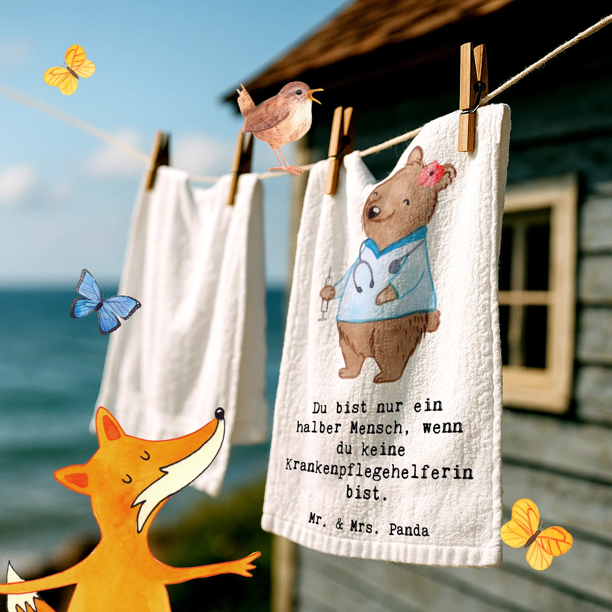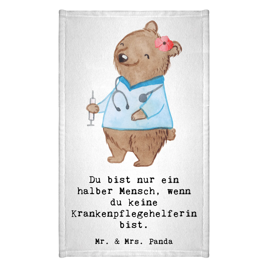 Das wunderschöne Gästehandtuch von Mr. & Mrs. Panda mit dem Motiv "Krankenpflegehelferin mit Herz" ist das perfekte Geschenk für all jene, die sich in der Pflege engagieren oder eine Ausbildung in diesem wichtigen Beruf anstreben. Dieses flauschige Handtuch, hergestellt aus einer hochwertigen Baumwollmischung, sorgt für ein Wohlgefühl in jedem Badezimmer. Es ist nicht nur praktisch, sondern zeigt auch Wertschätzung für das unermüdliche Engagement der Pflegekräfte.