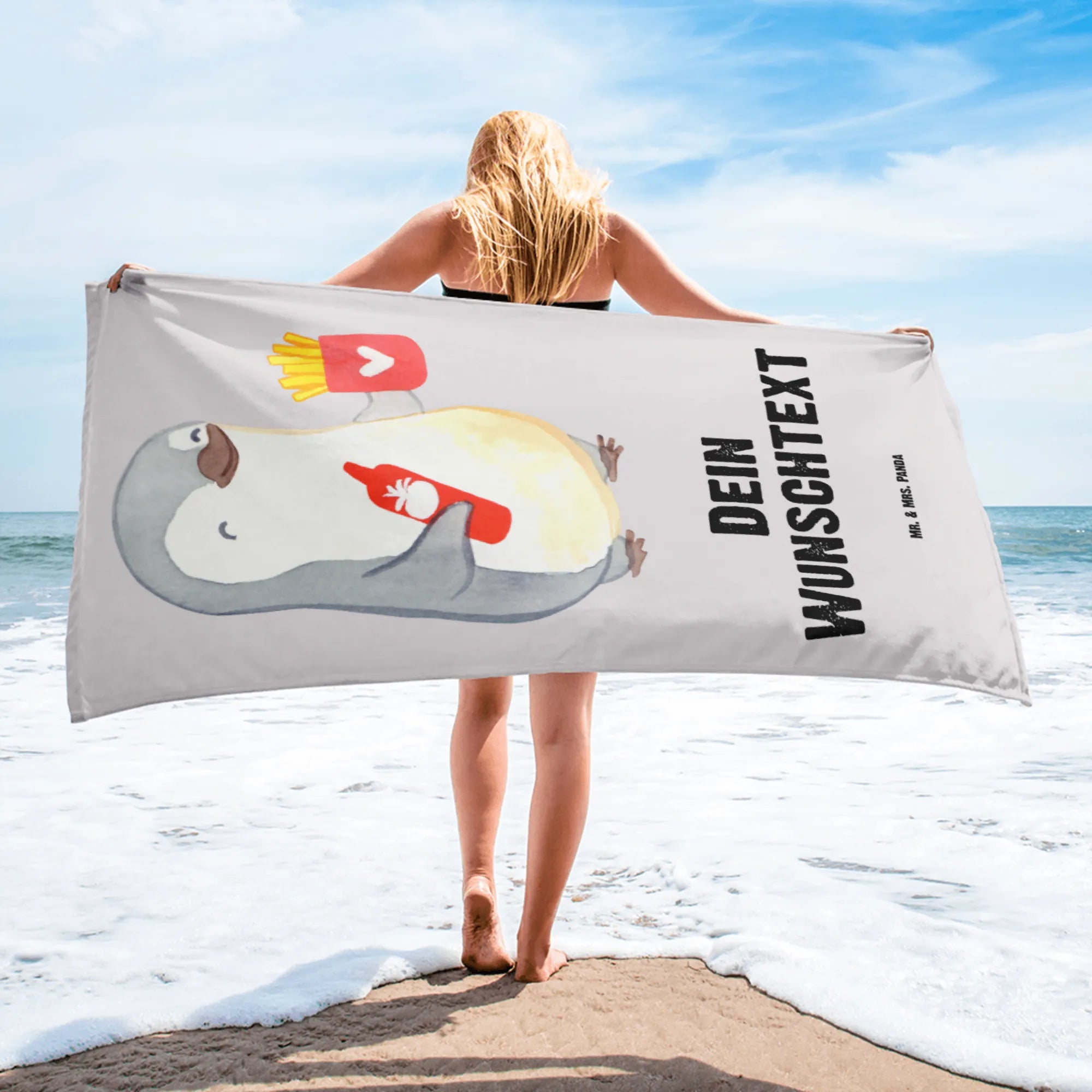 XXL Badehandtuch mit Namen „Pinguin Pommes“ – Ein liebevoller, witziger Liebesbeweis aus der Mr. & Mrs. Panda Liebe-Kollektion. Der niedliche Pinguin hält Pommes und Ketchup und sagt: „Mit dir würde ich sogar meine Pommes teilen.“ – perfekt für Paare, Verliebte und alle, die gern persönlich schenken. ❤️