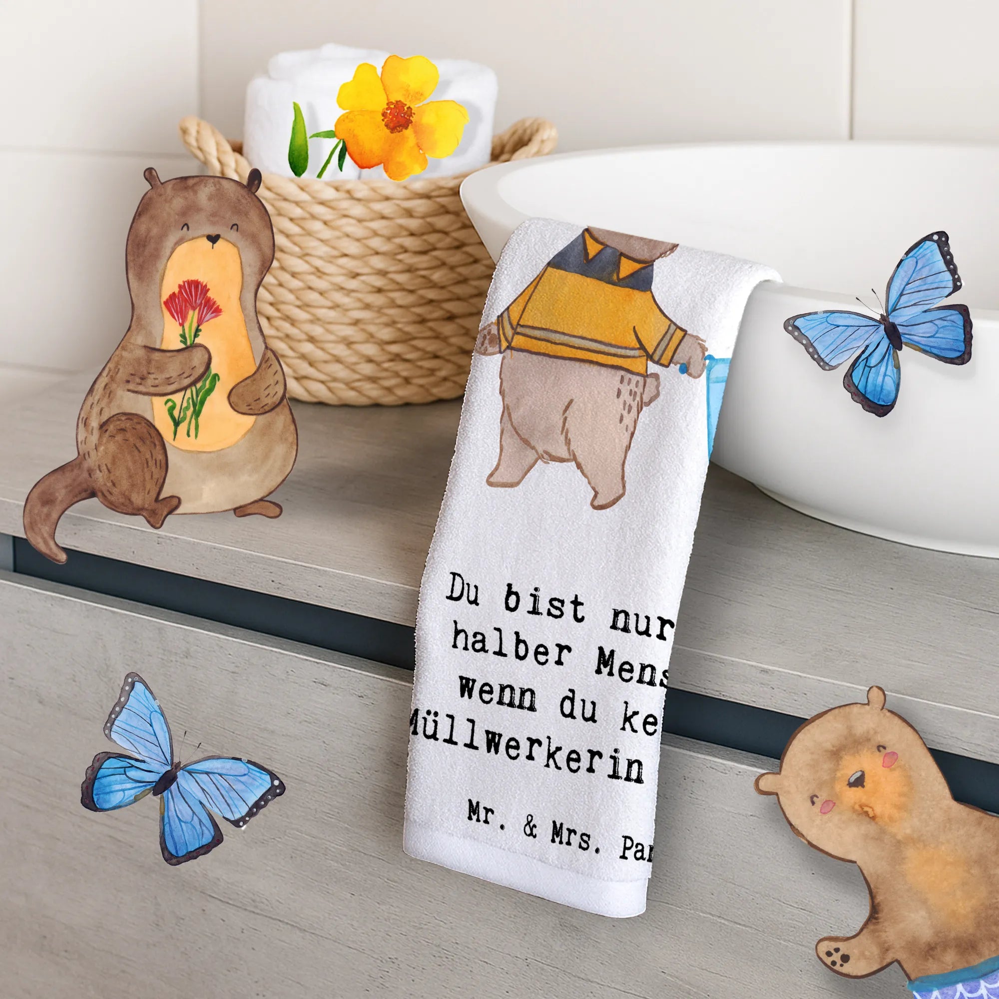 Das Gästehandtuch 'Müllwerkerin mit Herz' von Mr. & Mrs. Panda ist das perfekte Geschenk für alle begeisterten Müllwerkerinnen und Müllwerker. Mit seiner fröhlichen Gestaltung zeigt es, wie wichtig und wertvoll dieser Beruf ist. Ob zum Jubiläum, Abschied oder einfach nur um Danke zu sagen – dieses Handtuch bringt ein Lächeln in jedes Badezimmer.