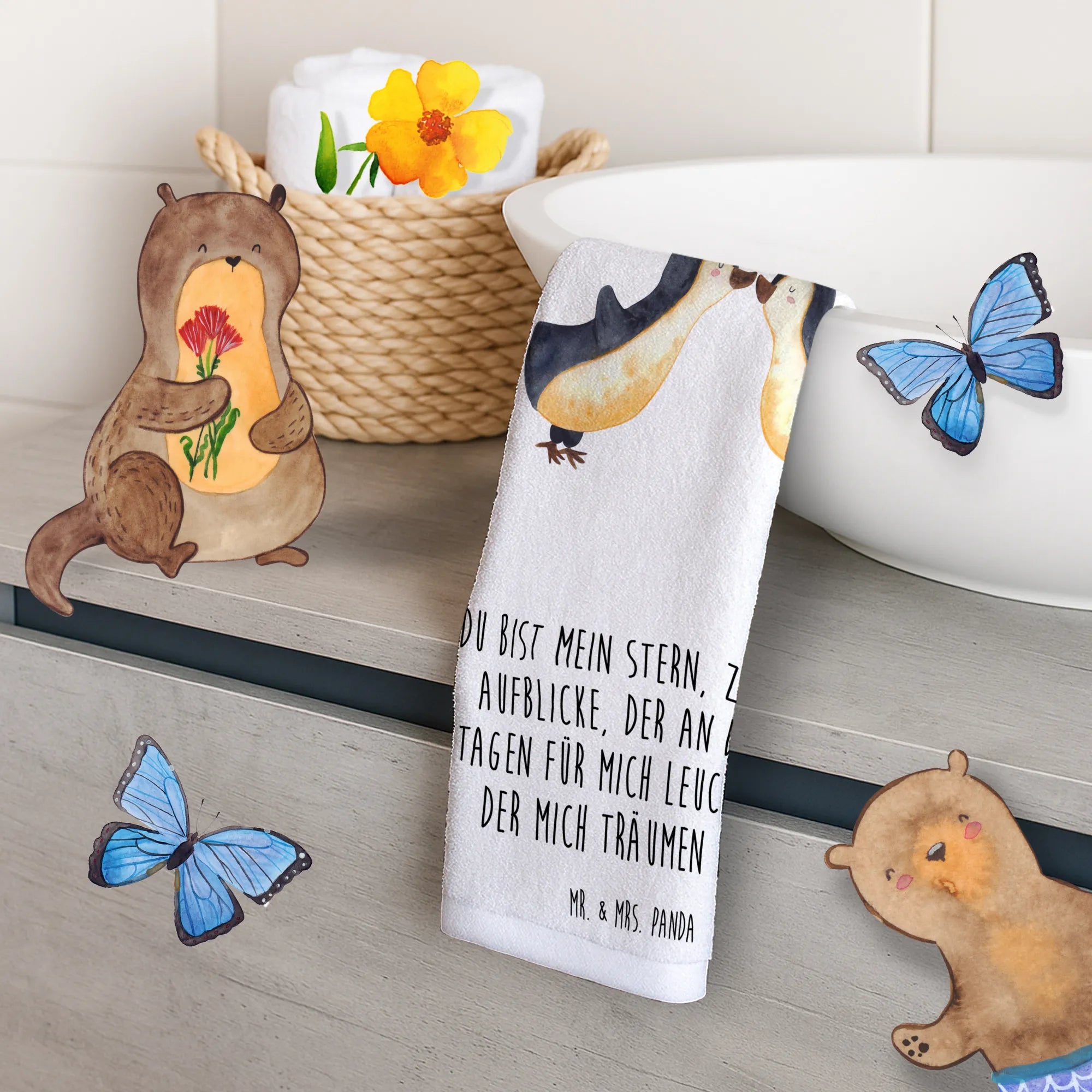 Das Gästetuch "Pinguin Liebe" von Mr. & Mrs. Panda ist das perfekte Geschenk für alle, die tief in der Liebe verwurzelt sind! Mit einem liebevollen Motiv, das zwei süße Pinguine zeigt, die sich aneinander kuscheln und sich mit geschlossenen Augen sanft an den Schnäbeln berühren, bringt dieses Handtuch eine wundervolle Botschaft der Zuneigung in jedes Zuhause. Über den Pinguinen schwebt ein kleines Herz, das für die innige Verbundenheit steht, die wir so sehr schätzen. Die Farben sind beruhigend und warm, in sanften Gelbtönen und sanften Blautönen gehalten, die Kinder und Erwachsene gleichermaßen ansprechen. Es ist nicht nur ein hübsches Deko-Element für das Gästebad, sondern auch ein praktisches Accessoire, das jeder gerne nutzt.