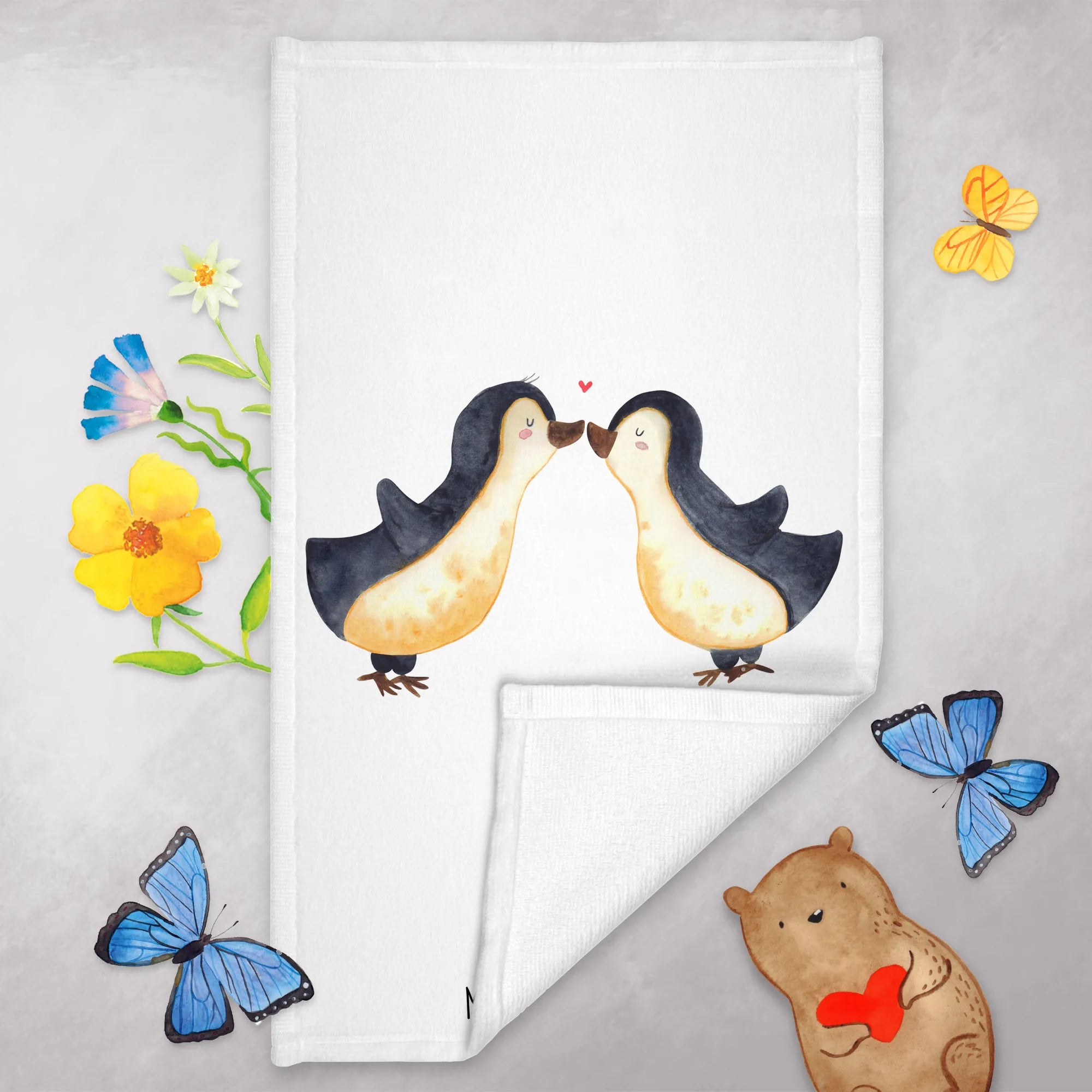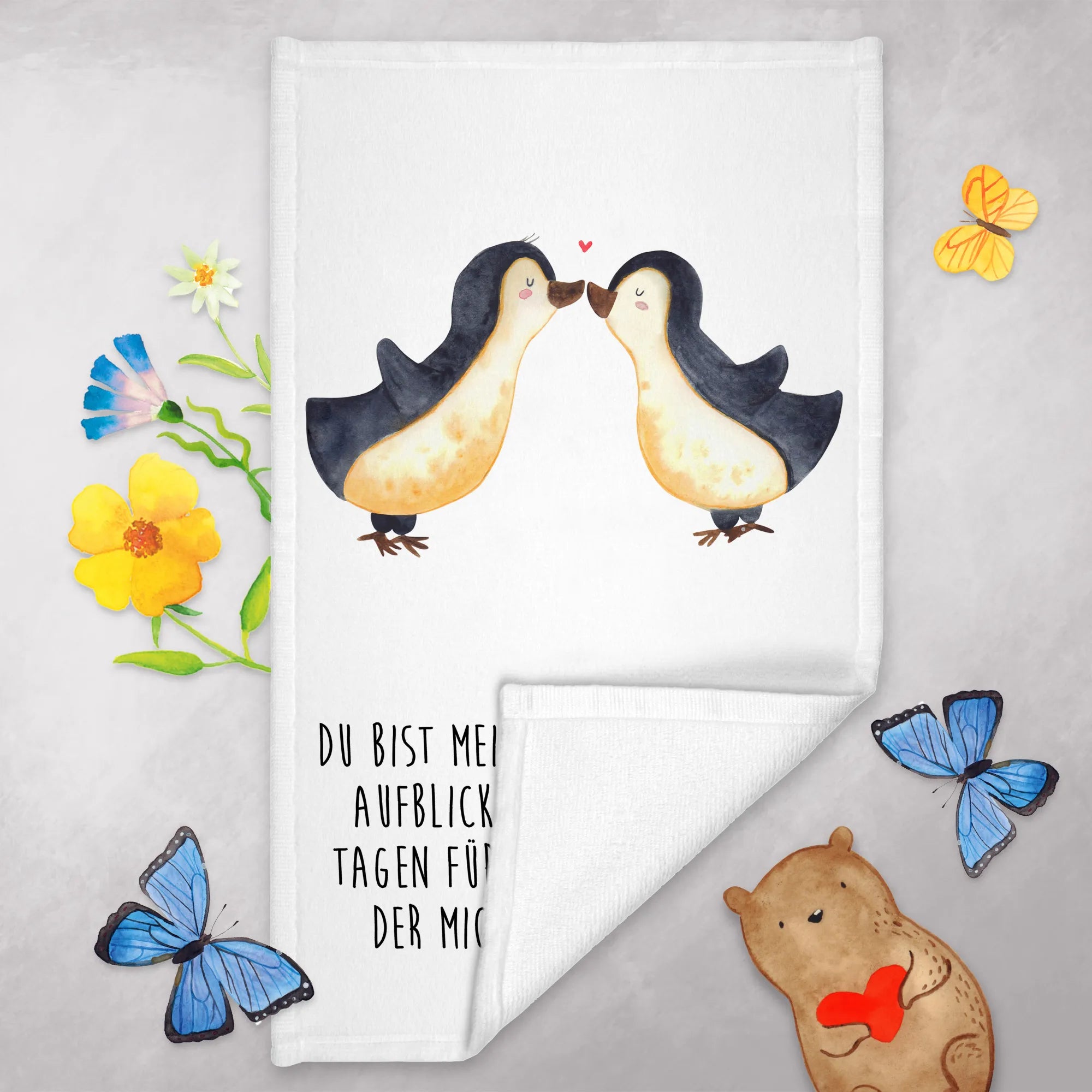 Die kleinen Pinguine auf dem Handtuch umarmen sich sanft, während über ihnen ein süßes Herz schwebt, das für die Liebe steht, die du für deinen Partner empfindest. Dieses Gästehandtuch ist nicht nur praktisch, sondern auch ein bezauberndes Liebesgeschenk, das Herzen höherschlagen lässt.