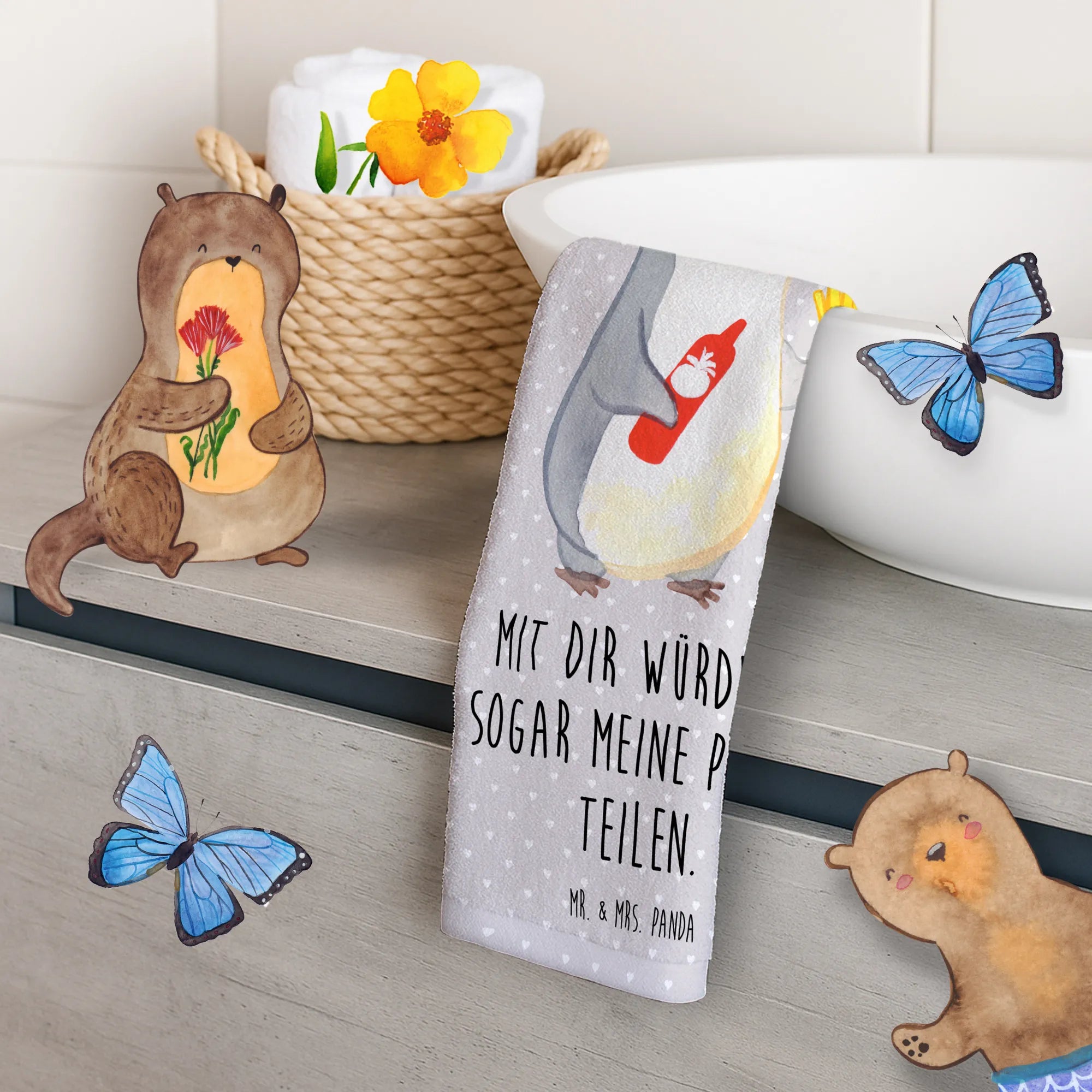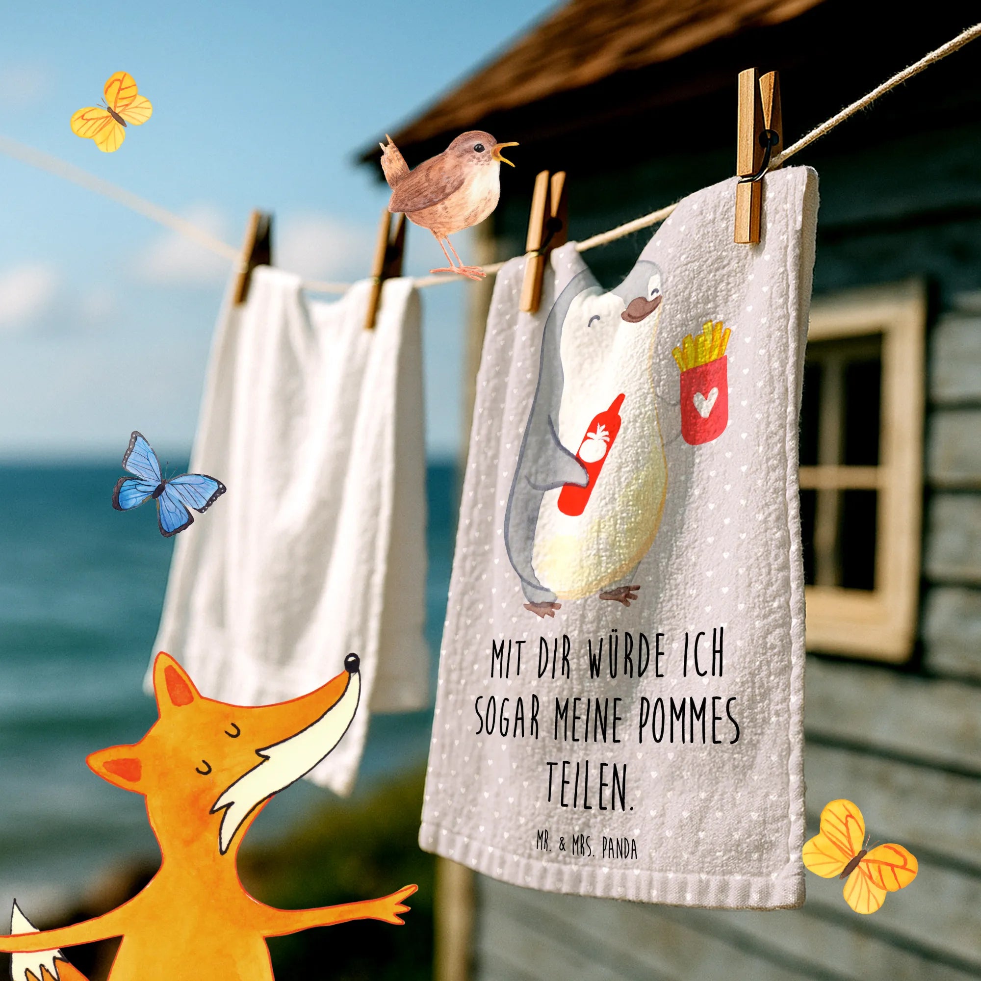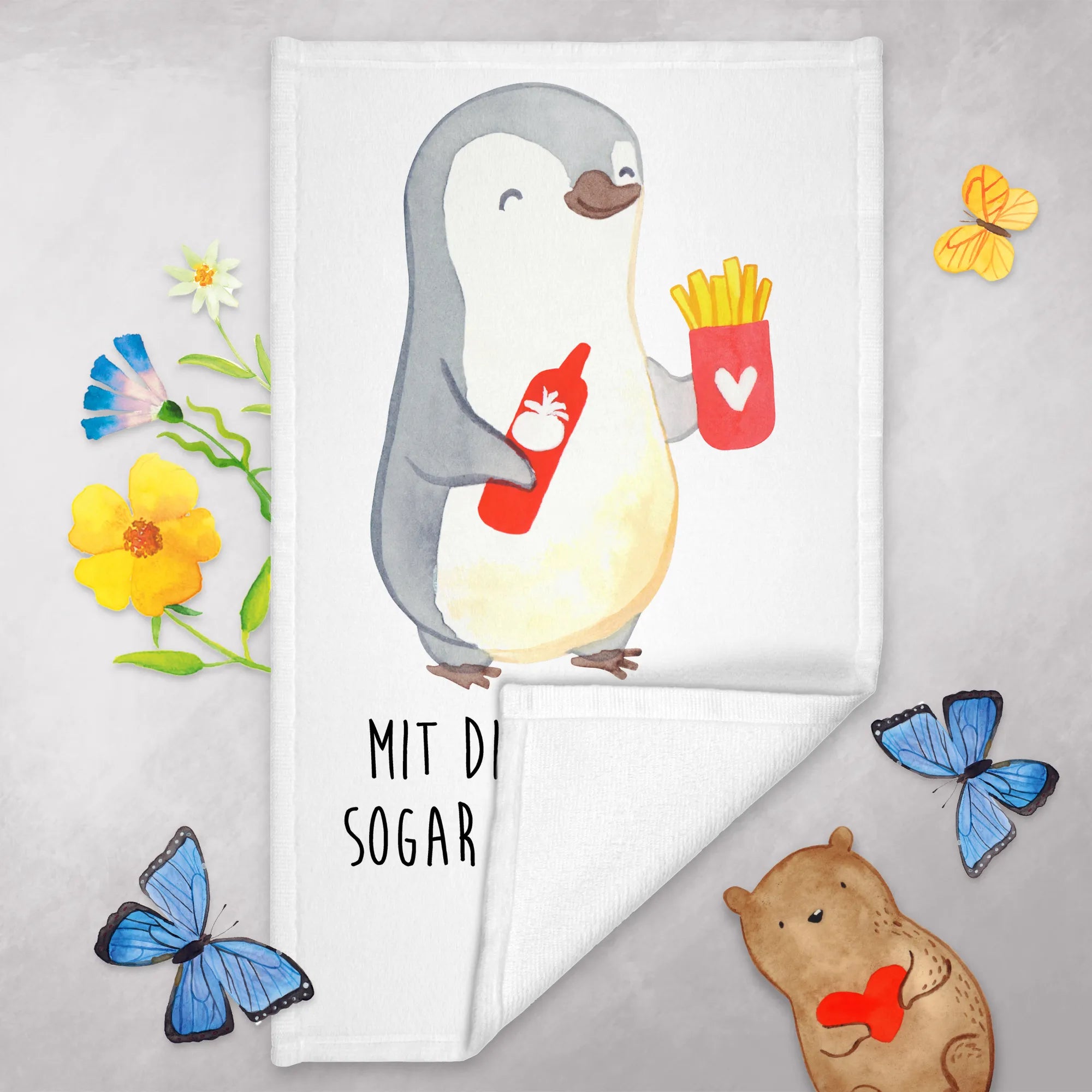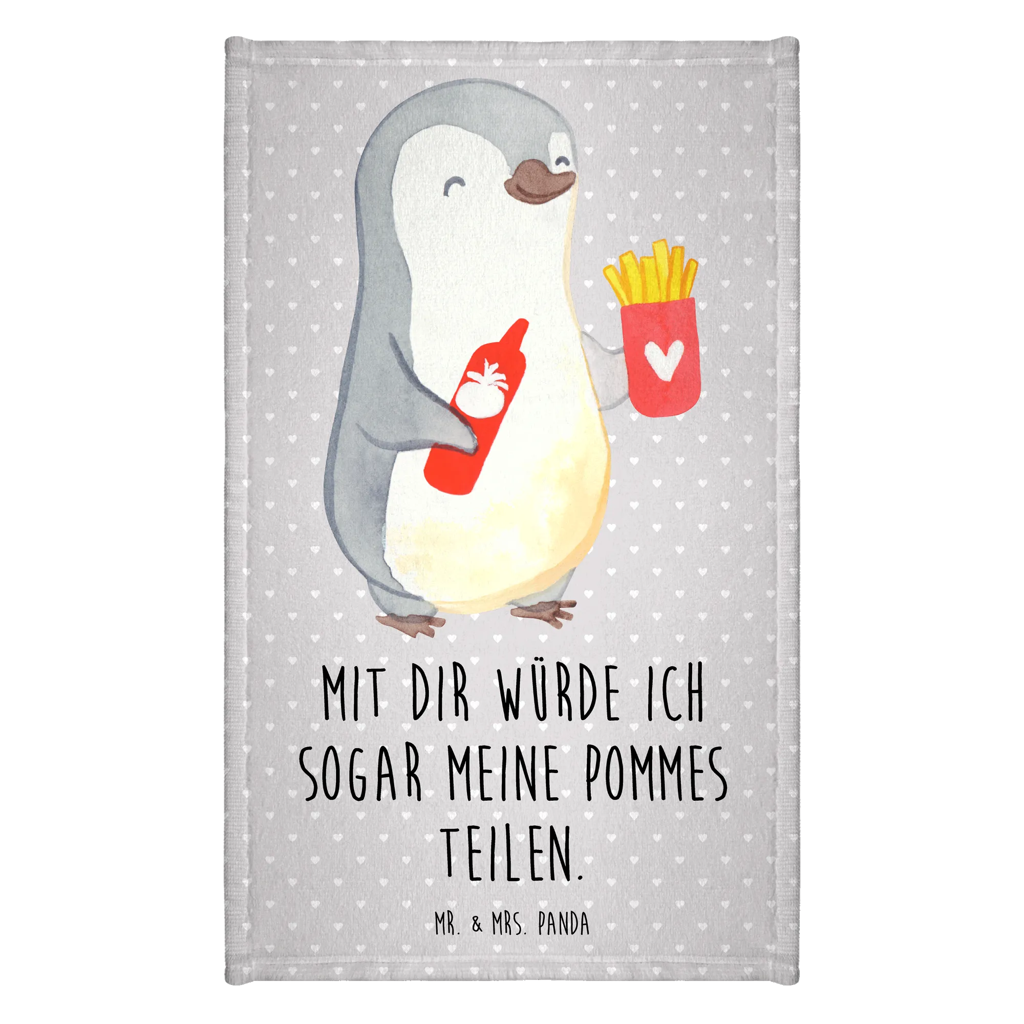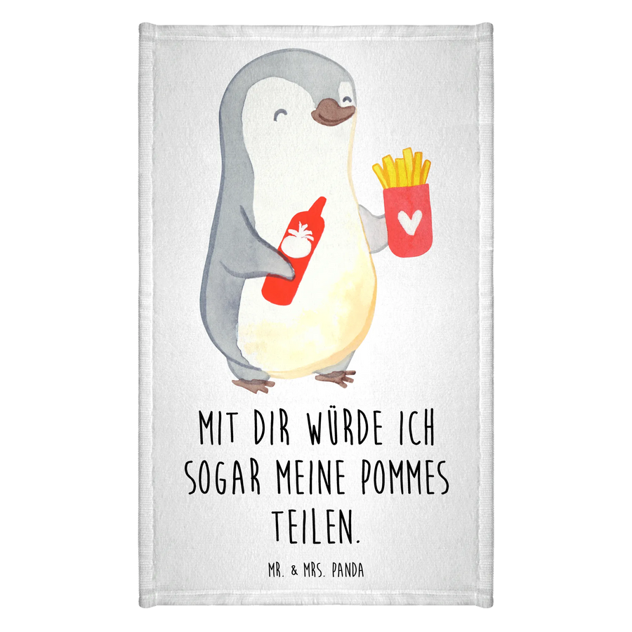 Das Gästehandtuch mit dem fröhlichen Pinguin-Motiv und dem Spruch "Mit dir würde ich sogar meine Pommes teilen" ist das perfekte Geschenk für alle, die die Liebe feiern möchten! In der exquisiten Kollektion von Mr. & Mrs. Panda findest du etwas ganz Besonderes für deinen Partner, deine Partnerin, deinen Ehemann oder deine Ehefrau. Egal ob zum Valentinstag, Jahrestag oder einfach nur so, dieses Handtuch bringt ein Lächeln in jede Dusche und jeden Waschraum.