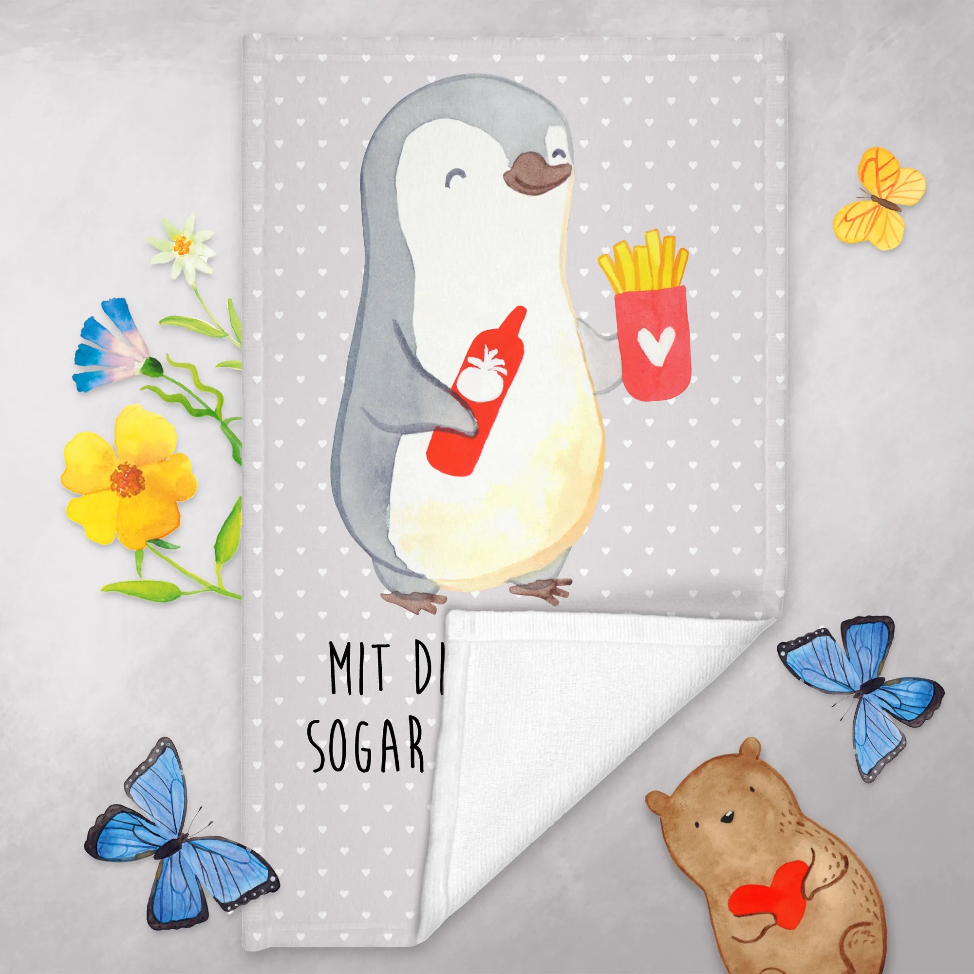 Der Pinguin, der mit einer Flasche Ketchup und einer herzlichen Portion Pommes dargestellt ist, verleiht dem Handtuch einen spielerischen Charakter, der Herzen höher schlagen lässt. Dieses Handtuch ist perfekt als Mitbringsel oder als persönliche Geschenkidee für den Hochzeitstag oder die Verlobung.