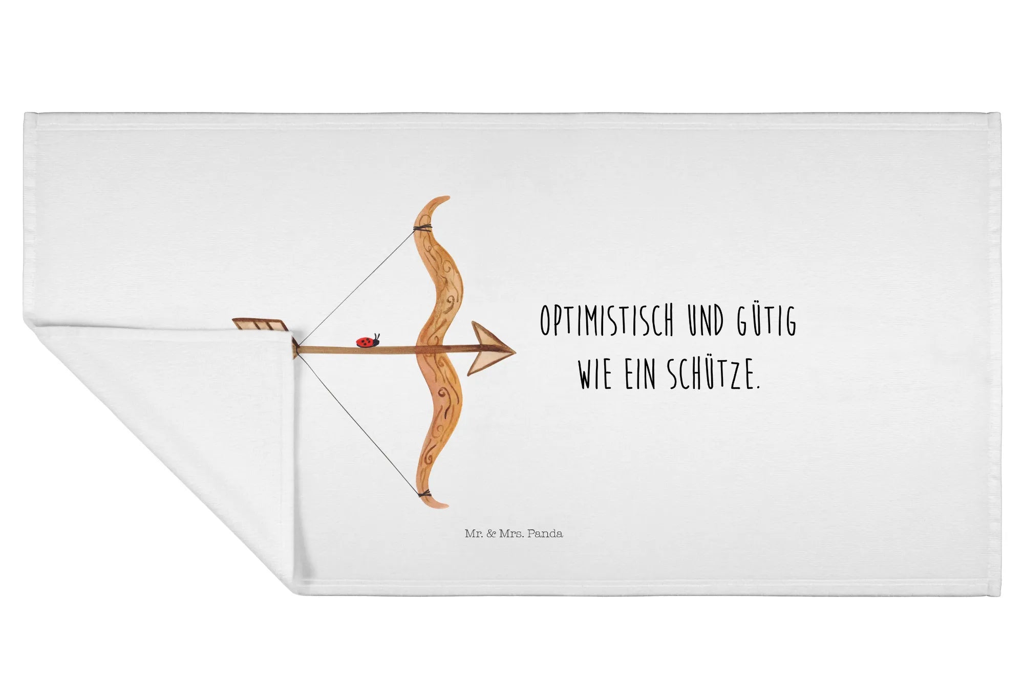 Das Motiv zeigt den Schützen in seiner charmantesten Form: Mit Pfeil und Bogen bewaffnet, aber immer mit einem gütigen Lächeln auf den Lippen. Begleitet wird das handgezeichnete Aquarell-Motiv von dem inspirierenden Spruch: 'Optimistisch und gütig wie ein Schütze.'. Das macht dieses kleine Handtuch zu einer täglichen Erinnerung an die eigenen Stärken.