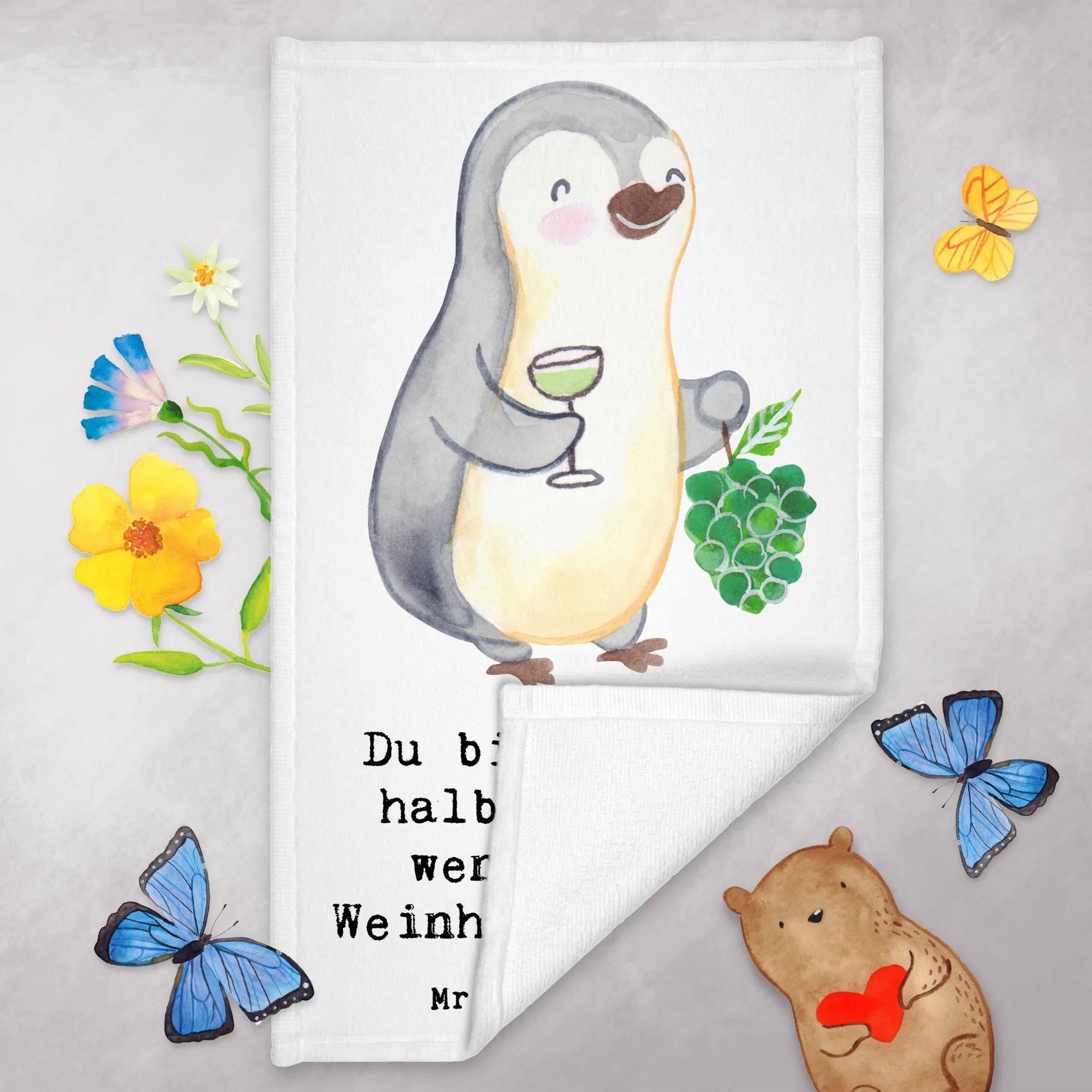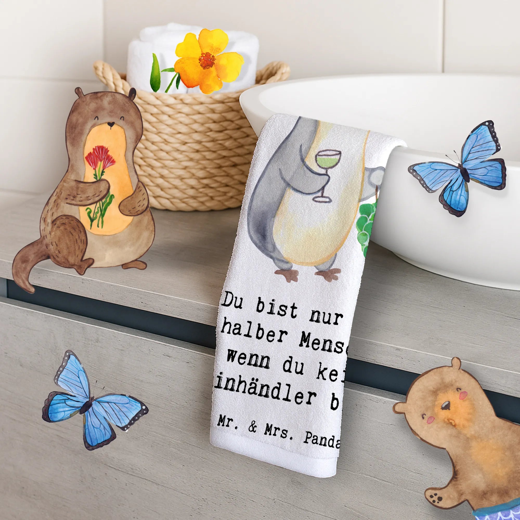 Das Gästetuch 'Weinhändler mit Herz' aus der kreativen Berufe Kollektion von Mr. & Mrs. Panda ist das perfekte Geschenk für alle Weinliebhaber und Weinhändler! Mit einem fröhlichen Pinguin, der Weintrauben in einer Hand und ein gefülltes Glas Wein in der anderen hält, strahlt dieses Handtuch Freude und Herzlichkeit aus.