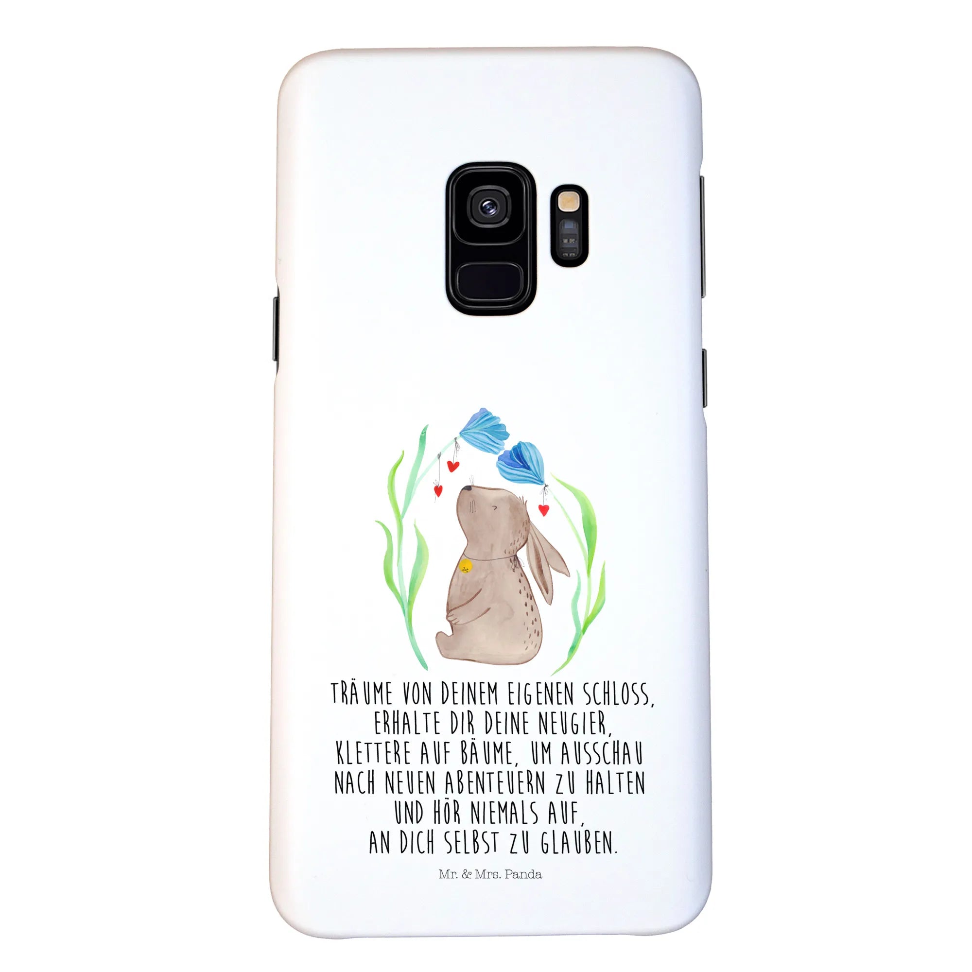 Die Samsung Galaxy S9 Handyhülle mit dem bezaubernden Motiv 'Hase Blume' aus der Ostern-Kollektion von Mr. & Mrs. Panda ist das perfekte Geschenk für alle, die den Frühling lieben! Stell dir vor, wie dieser süße Hase, der zwischen bunten Blumen sitzt und ein Glöckchen um den Hals trägt, fröhliche Laune in dein Leben bringt.