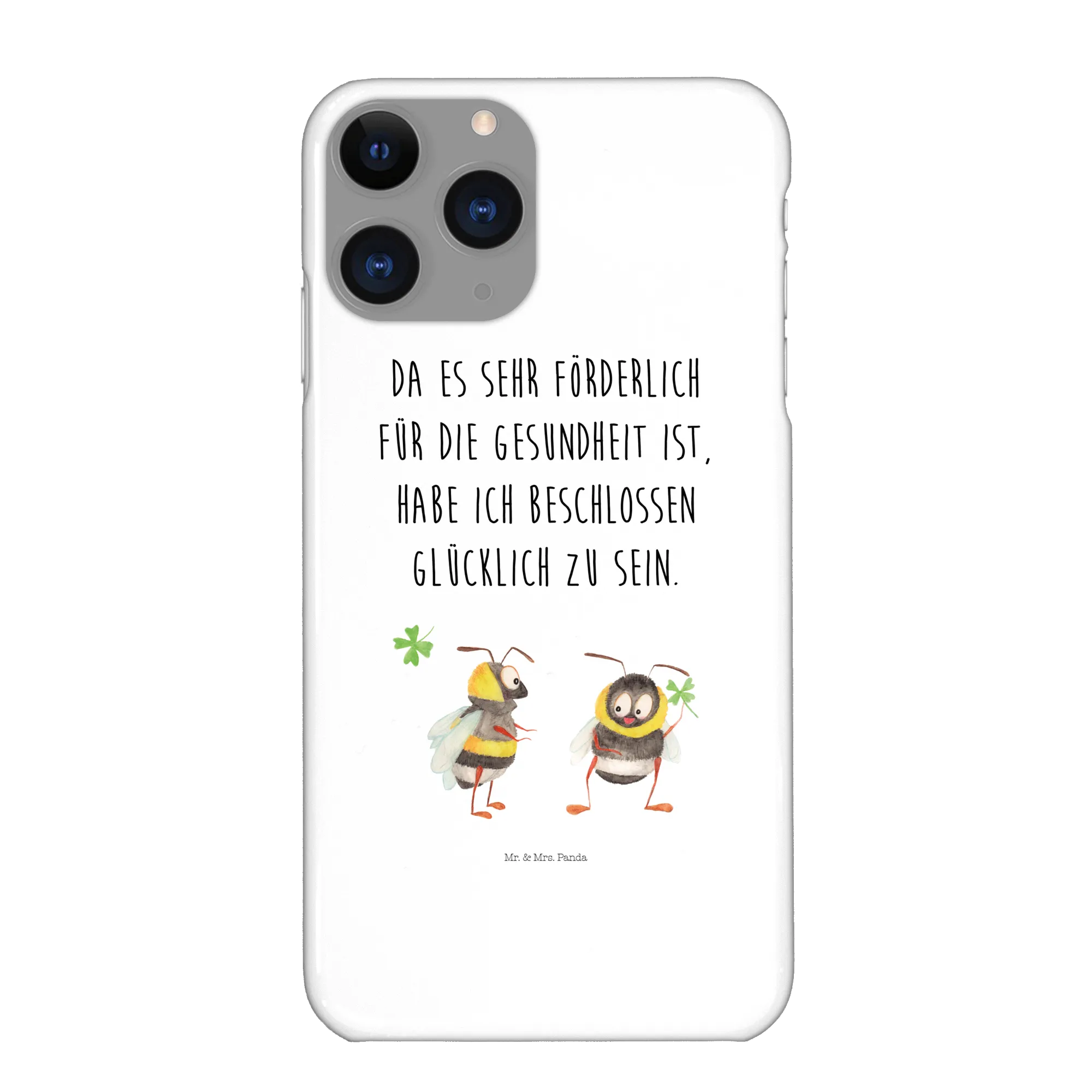 Diese Schutzhülle aus hochwertigem 3D Premium Kunststoff schützt dein iPhone 11 Pro vor Stößen, Kratzern und anderen Beschädigungen. Die niedlichen Hummeln, die sich freudig gegenüberstehen und ein Kleeblatt halten, symbolisieren Glück und Verbundenheit.