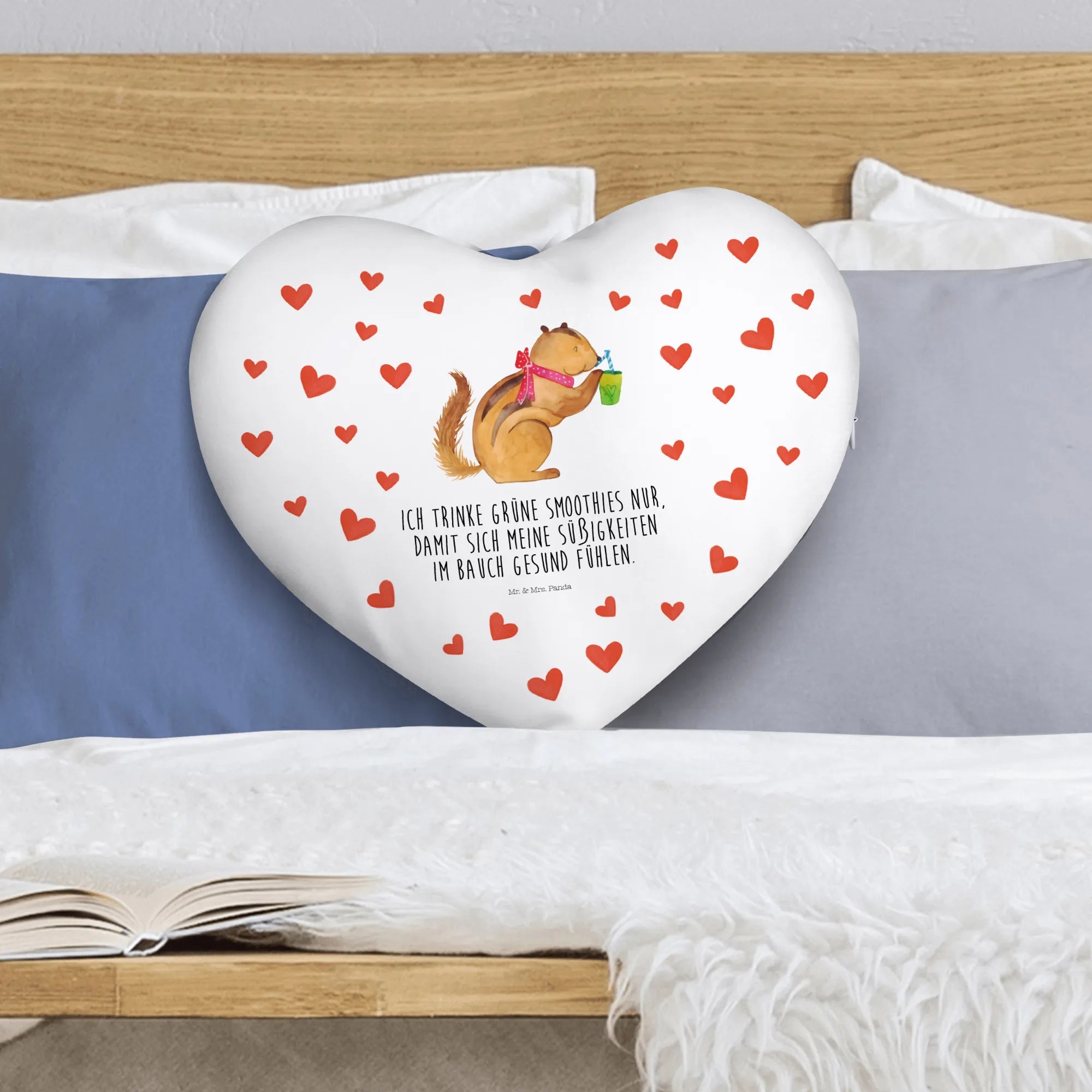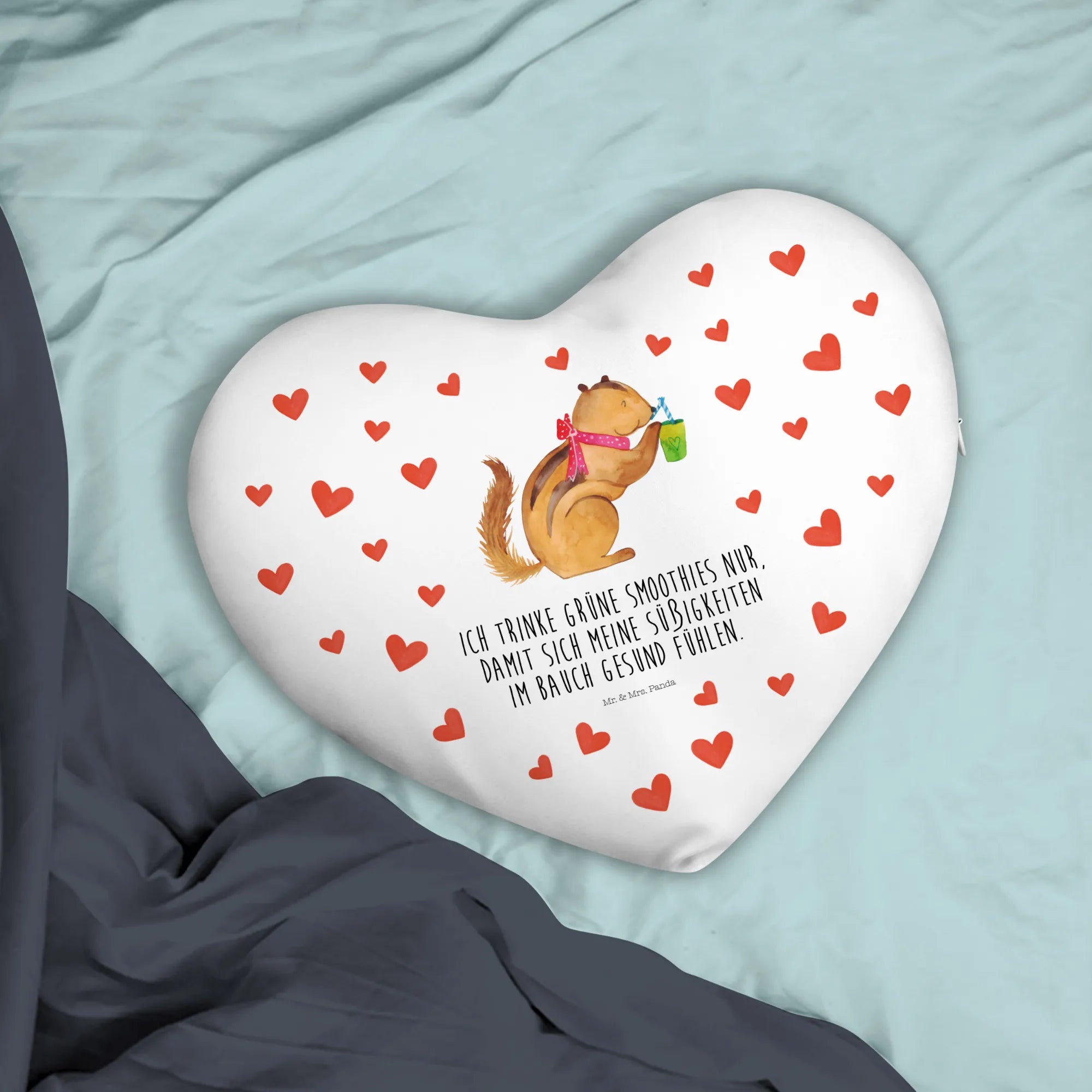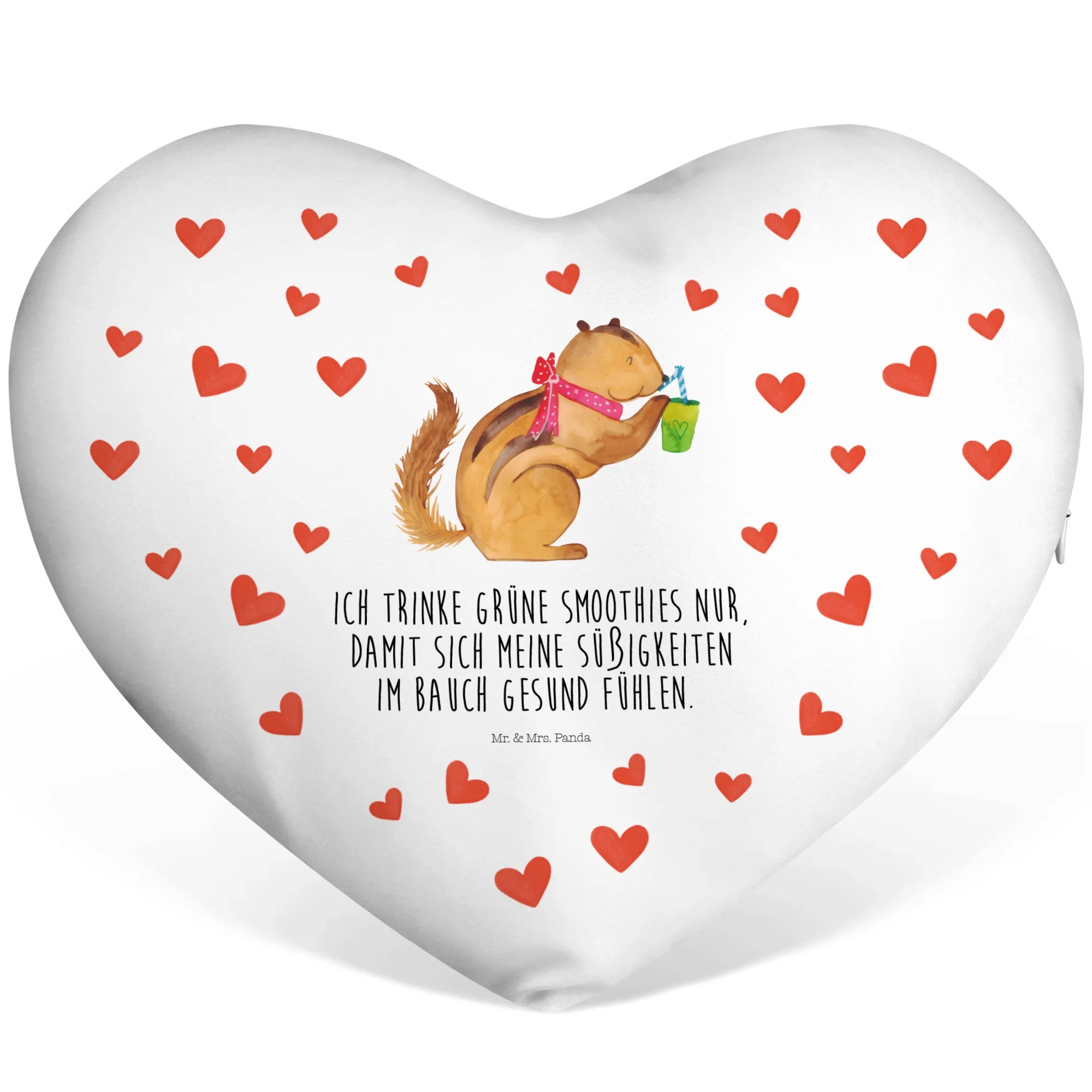 Das Herzkissen Eichhörnchen Smoothie von Mr. & Mrs. Panda ist der perfekte Weg, um deinem Zuhause eine Extraportion gute Laune zu verleihen. Mit seinem entzückenden Design zeigt es ein süßes Streifenhörnchen, das gerade genüsslich an einem gesunden Smoothie schlürft. Dieses Kissen ist nicht nur ein echter Blickfang, sondern auch ein wunderbarer Begleiter für alle, die die Liebe zu Tieren und gesunder Ernährung vereinen.