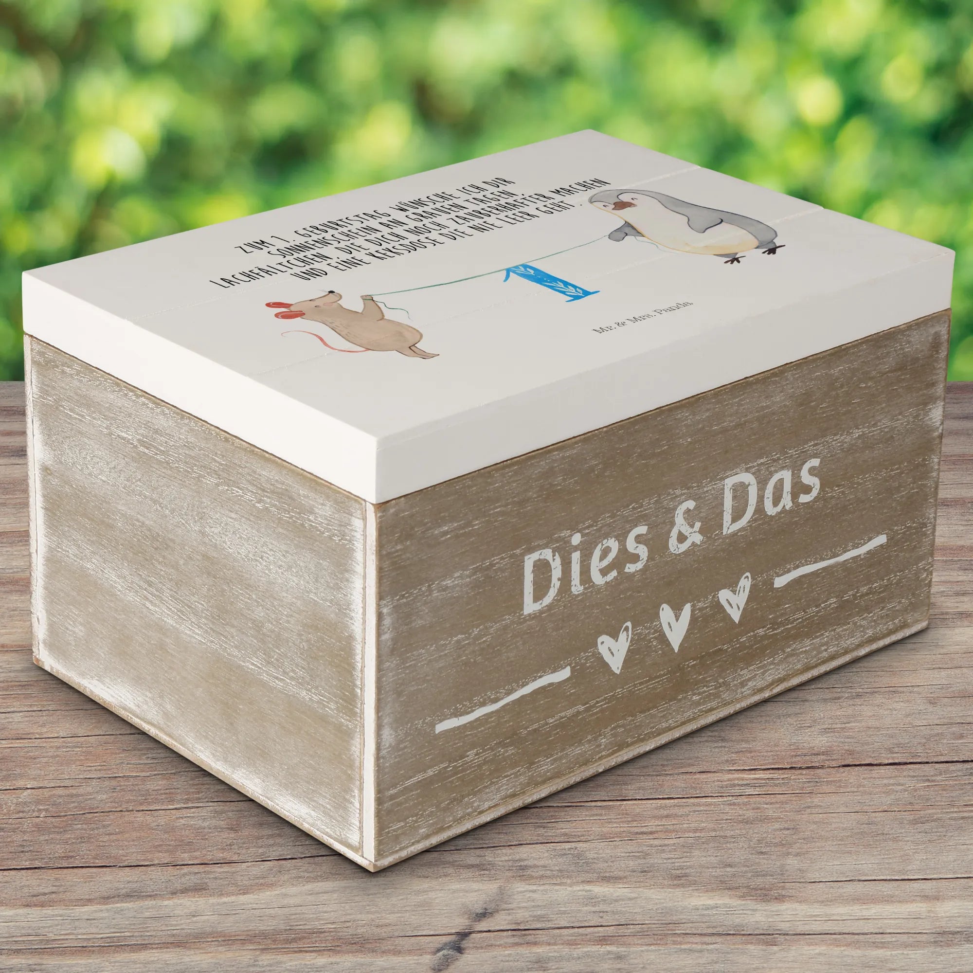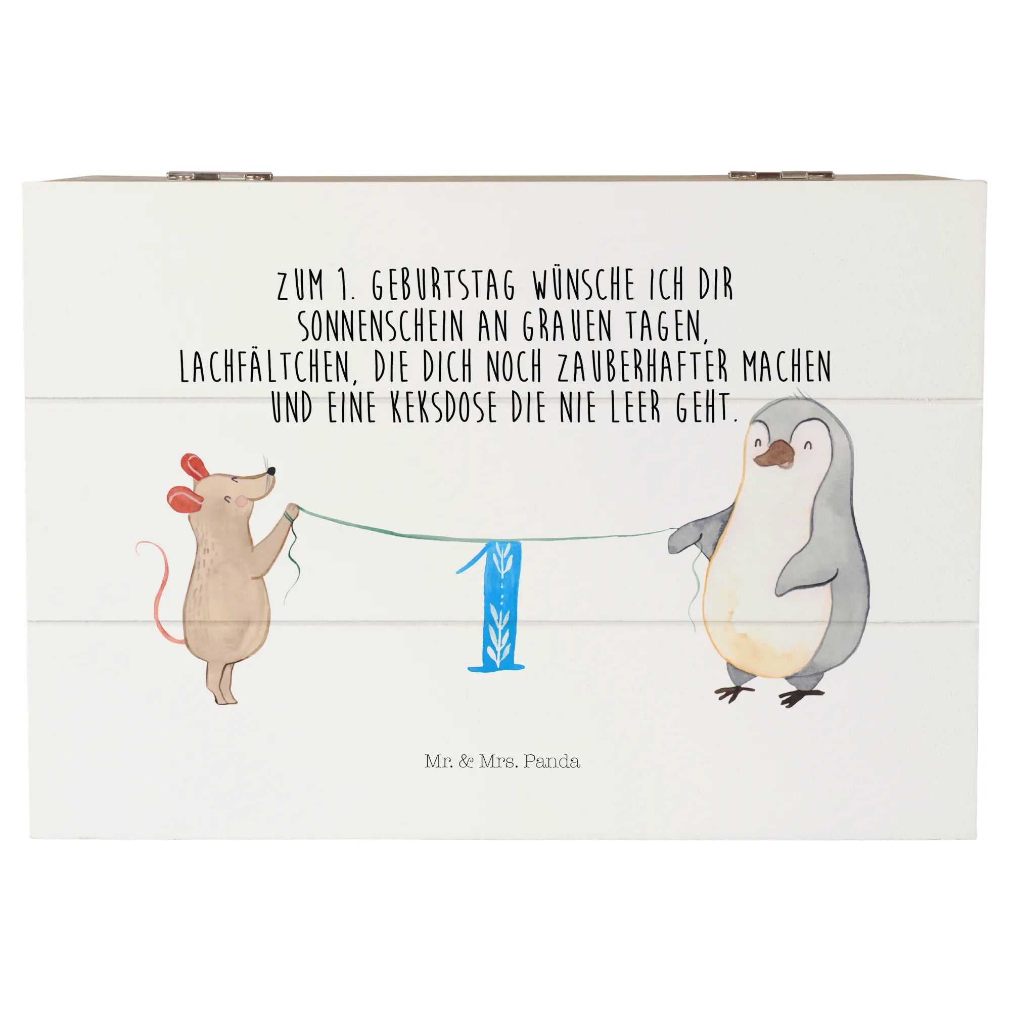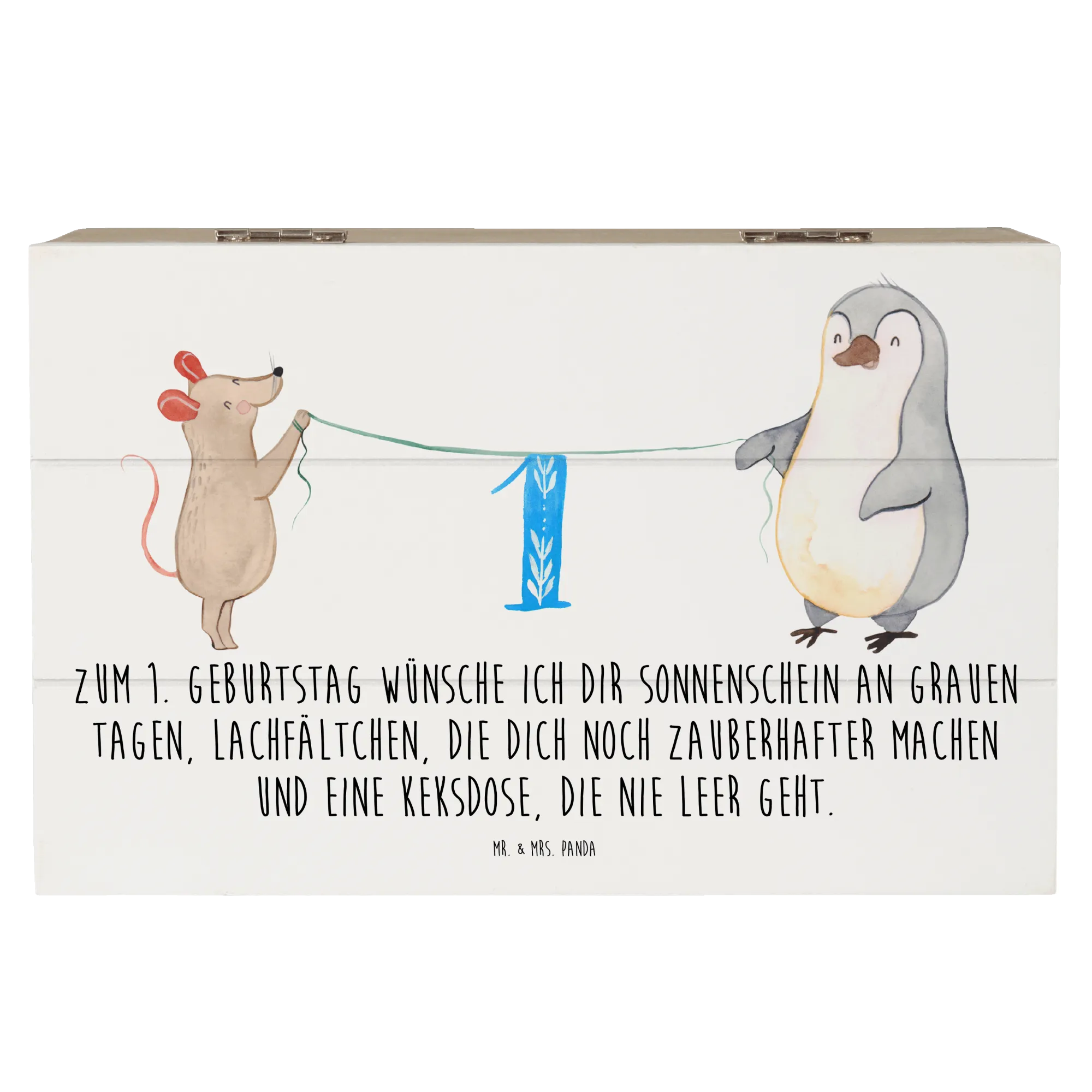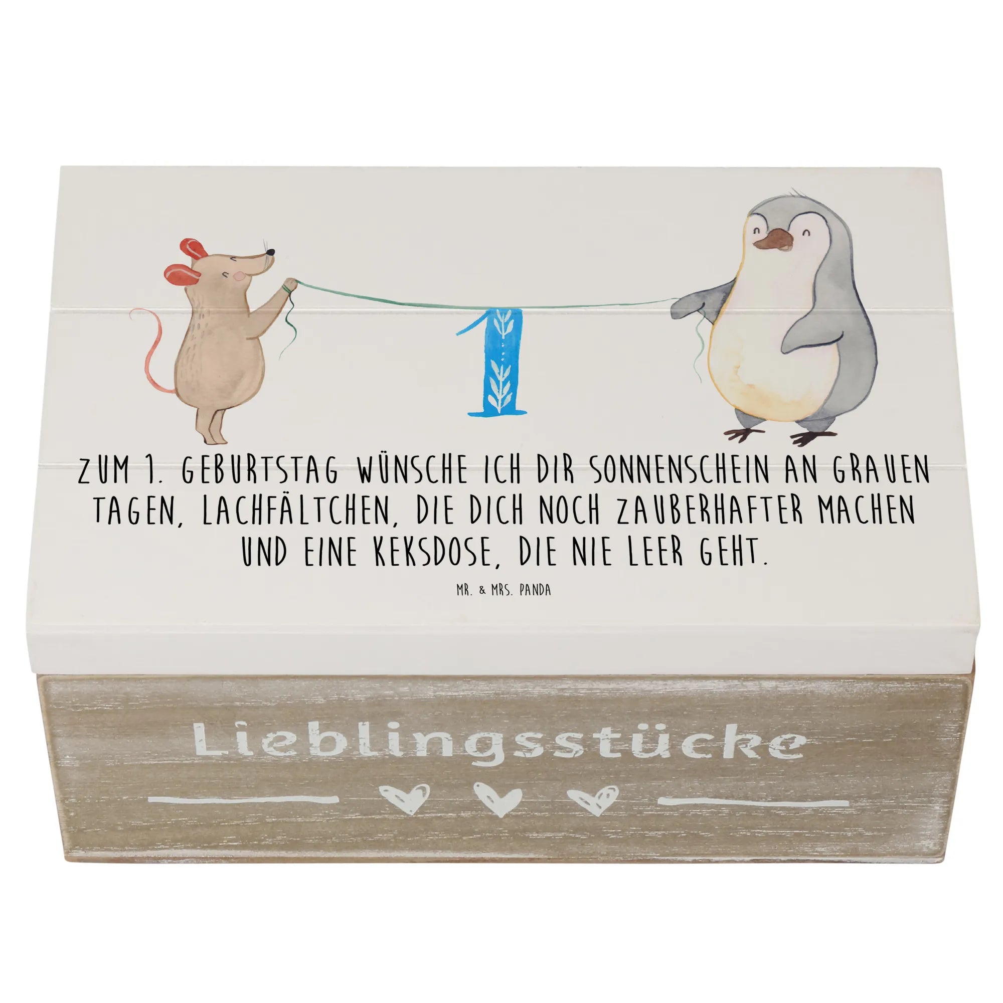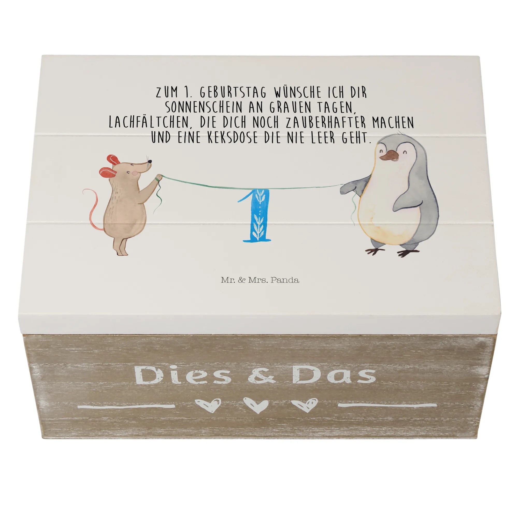Die wunderschöne Holzkiste von Mr. & Mrs. Panda ist das perfekte Geschenk zum 1. Geburtstag! Diese zauberhafte Kiste mit dem Motiv '1. Geburtstag Maus Pinguin' feiert diesen ganz besonderen Tag, an dem kleine Herzen höher schlagen.