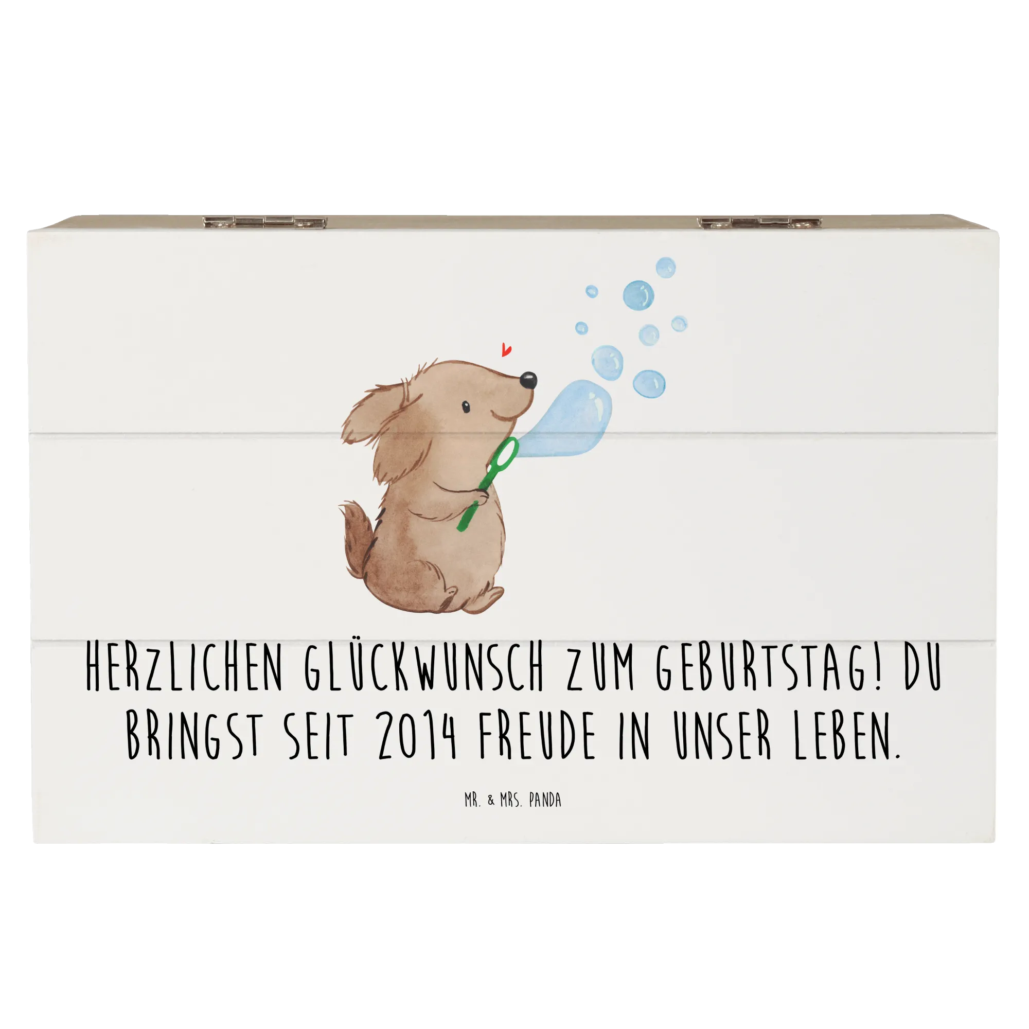 Entdecke die bezaubernde Holzkiste 2014 von Mr. & Mrs. Panda, die das perfekte Geschenk zu jedem Geburtstag darstellt. Mit dem liebevollen Slogan 'Herzlichen Glückwunsch zum Geburtstag! Du bringst seit 2014 Freude in unser Leben.' ist diese Kiste nicht nur ein wunderschönes Deko-Element, sondern auch ein wichtiger Aufbewahrungsort für all die kostbaren Erinnerungen des Lebens.