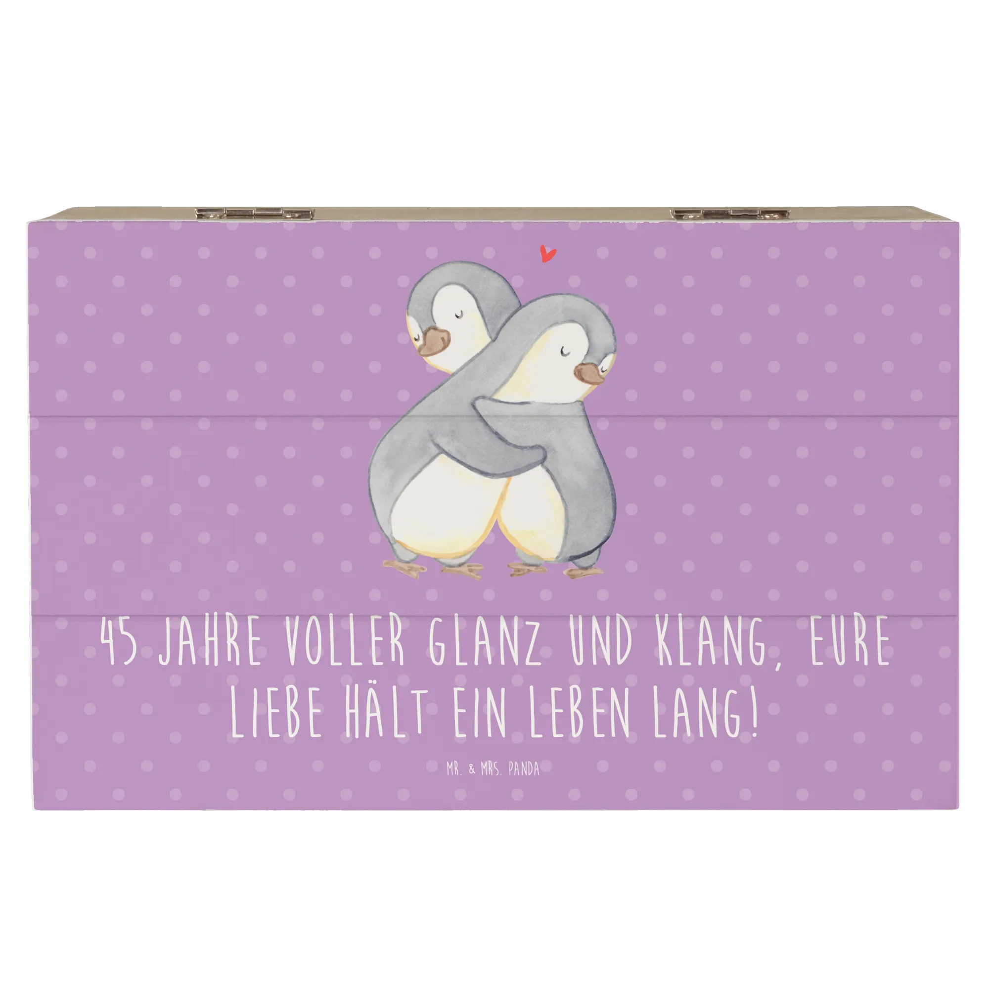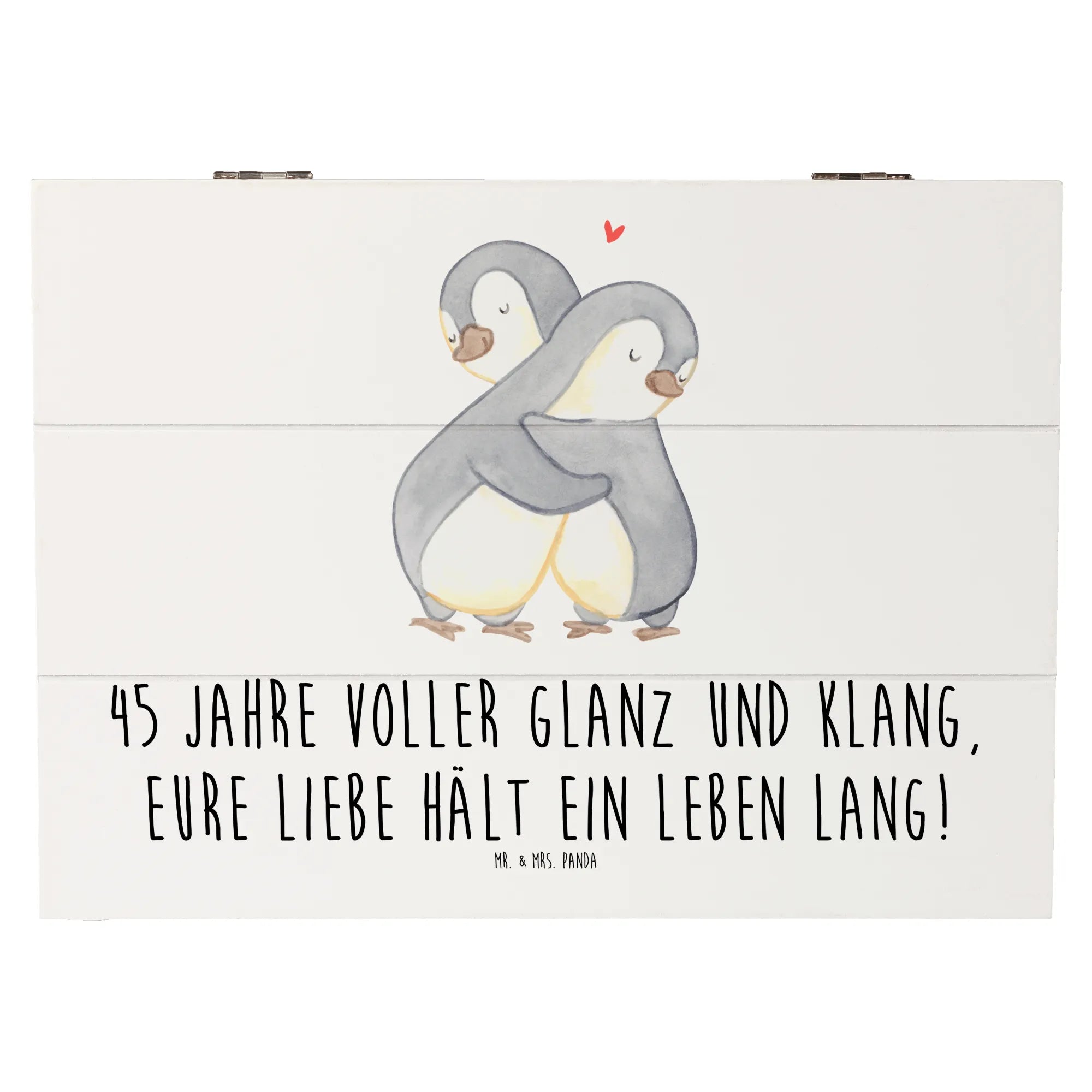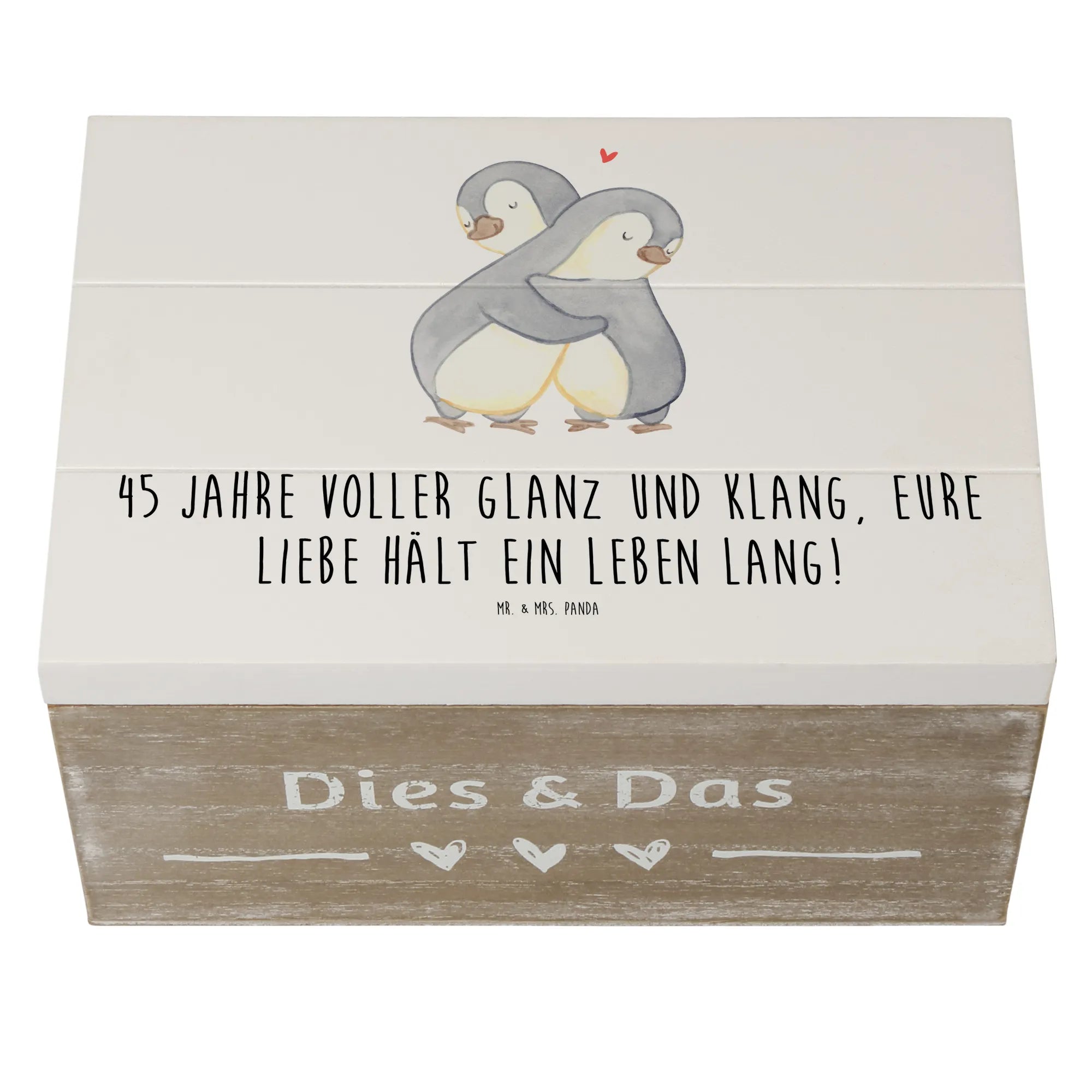 Unsere Holzkiste „45. Hochzeitstag – Messinghochzeit“ von Mr. & Mrs. Panda ist die perfekte Geschenkidee zur Feier dieses großen Jubiläums. Bedruckt mit dem liebevollen Spruch „45 Jahre voller Glanz und Klang, eure Liebe hält ein Leben lang!“ und einer zauberhaften Illustration ist diese Schatzkiste ideal als Erinnerungskiste, Fotobox oder Geschenkbox.