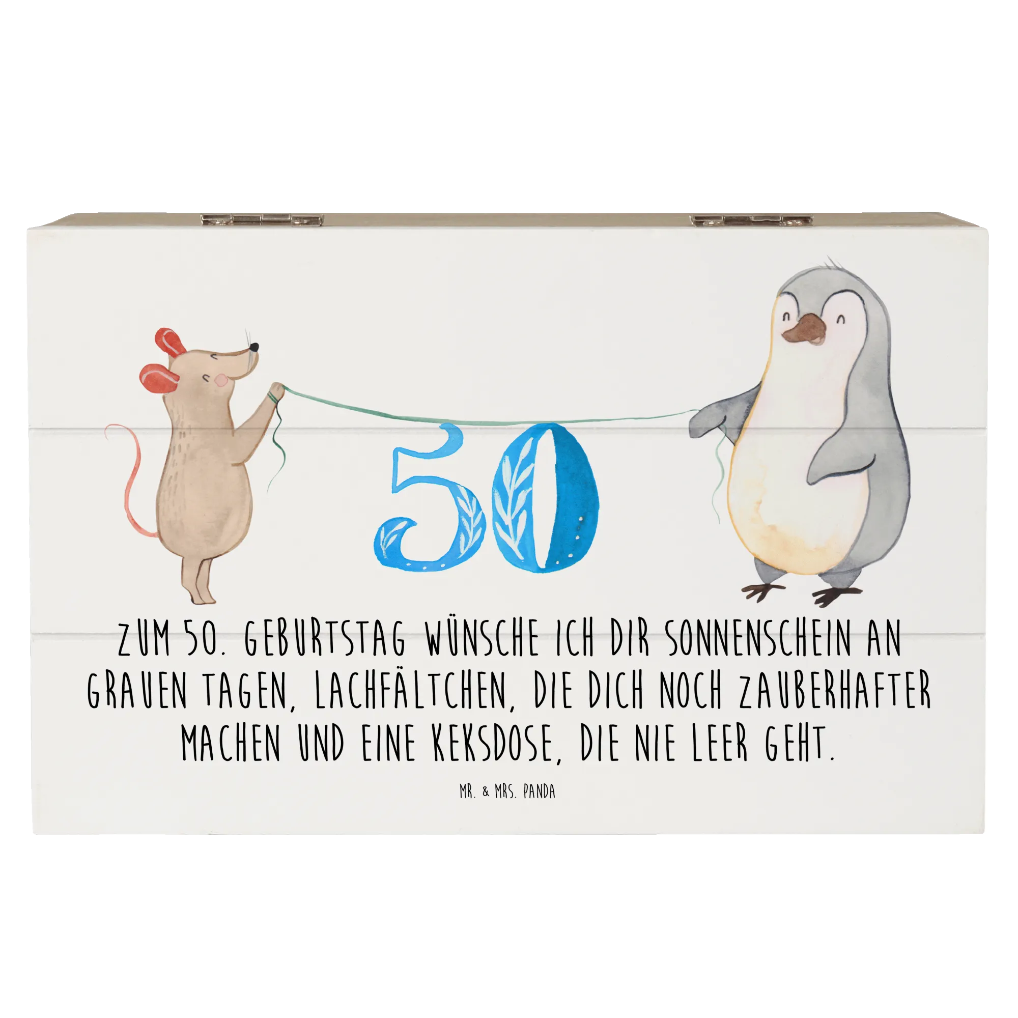 Entdecke die perfekte Holzkiste von Mr. & Mrs. Panda, die mit viel Liebe für das feierliche Ereignis zu einem ganz besonderen Geburtstag entworfen wurde! Diese wunderschöne Holzkiste ist dekoriert mit dem bezaubernden Motiv '50. Geburtstag Maus Pinguin'. Ein süßer Pinguin und eine putzige Maus halten eine Girlande und feiern diesen bedeutenden Tag.