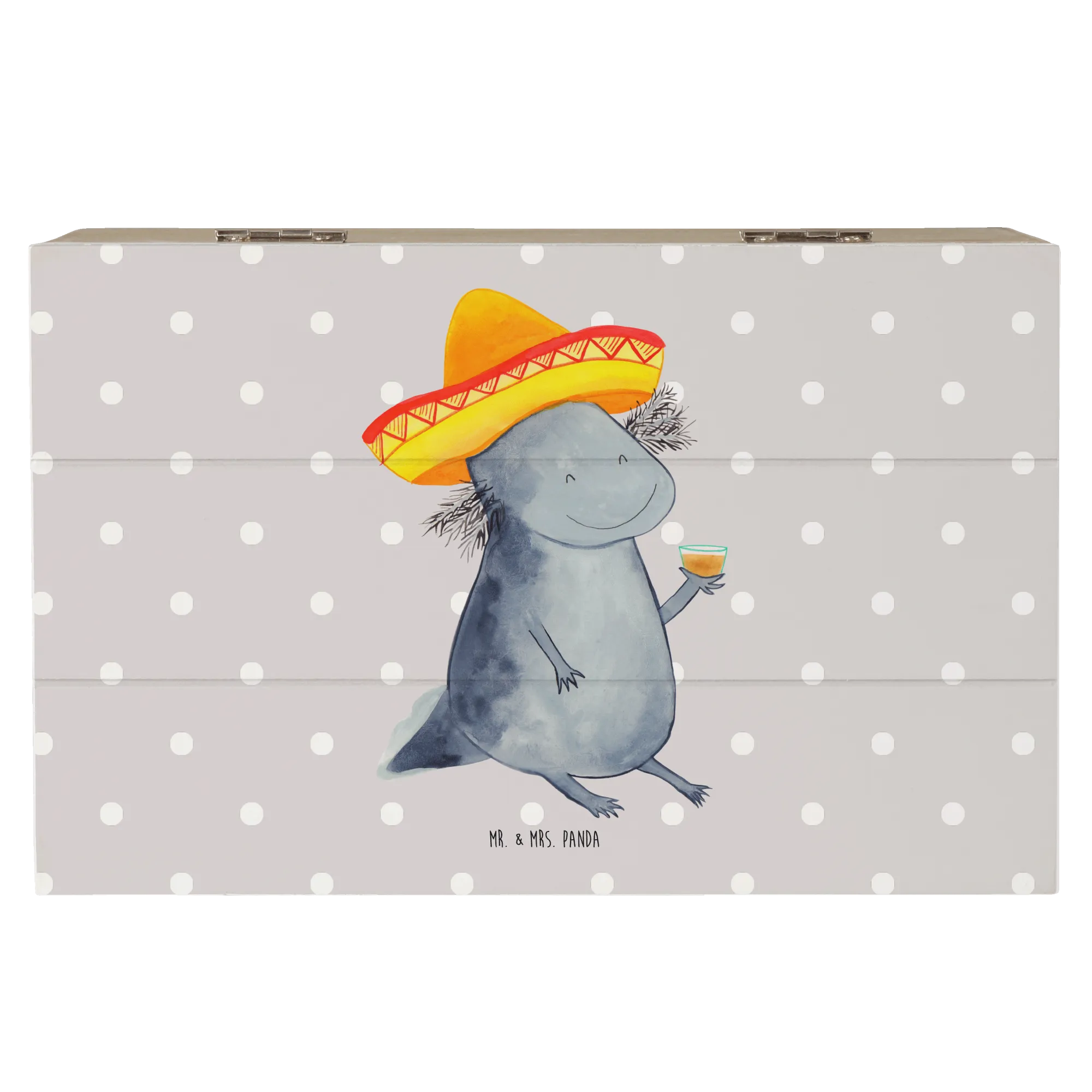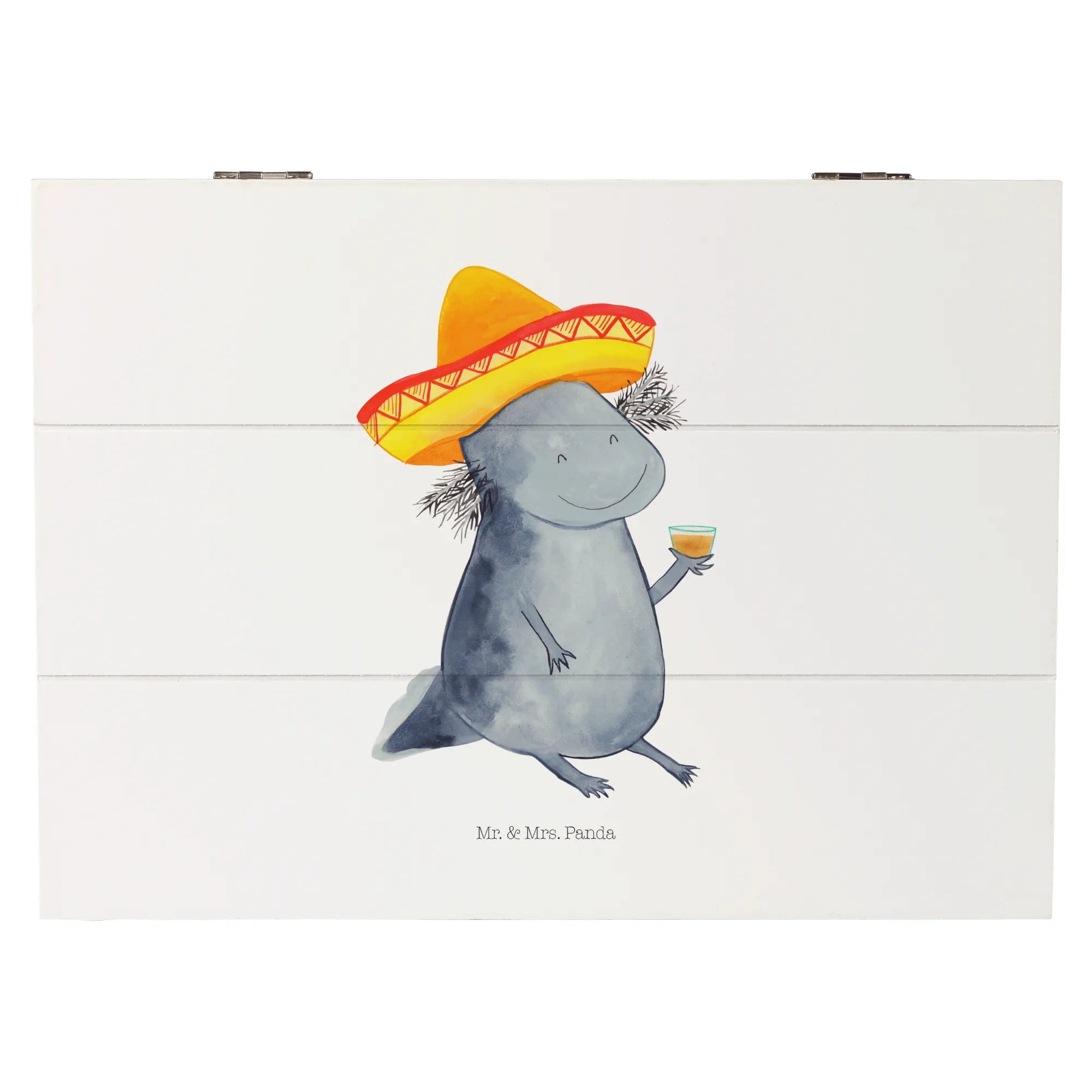 Entdecke die einzigartige Holzkiste von Mr. & Mrs. Panda, die perfekt für alle Liebhaber von Axolotl und einem Hauch mexikanischer Lebensfreude ist! Diese schöne Holzkiste mit einem niedlichen Axolotl, der mit einem Sombrero und einem Tequila Glas in der Hand posiert, ist mehr als nur ein Aufbewahrungsort für deine Schätze. Sie bringt Farbe und Fröhlichkeit in jedes Zuhause und erinnert dich daran, das Leben zu genießen!