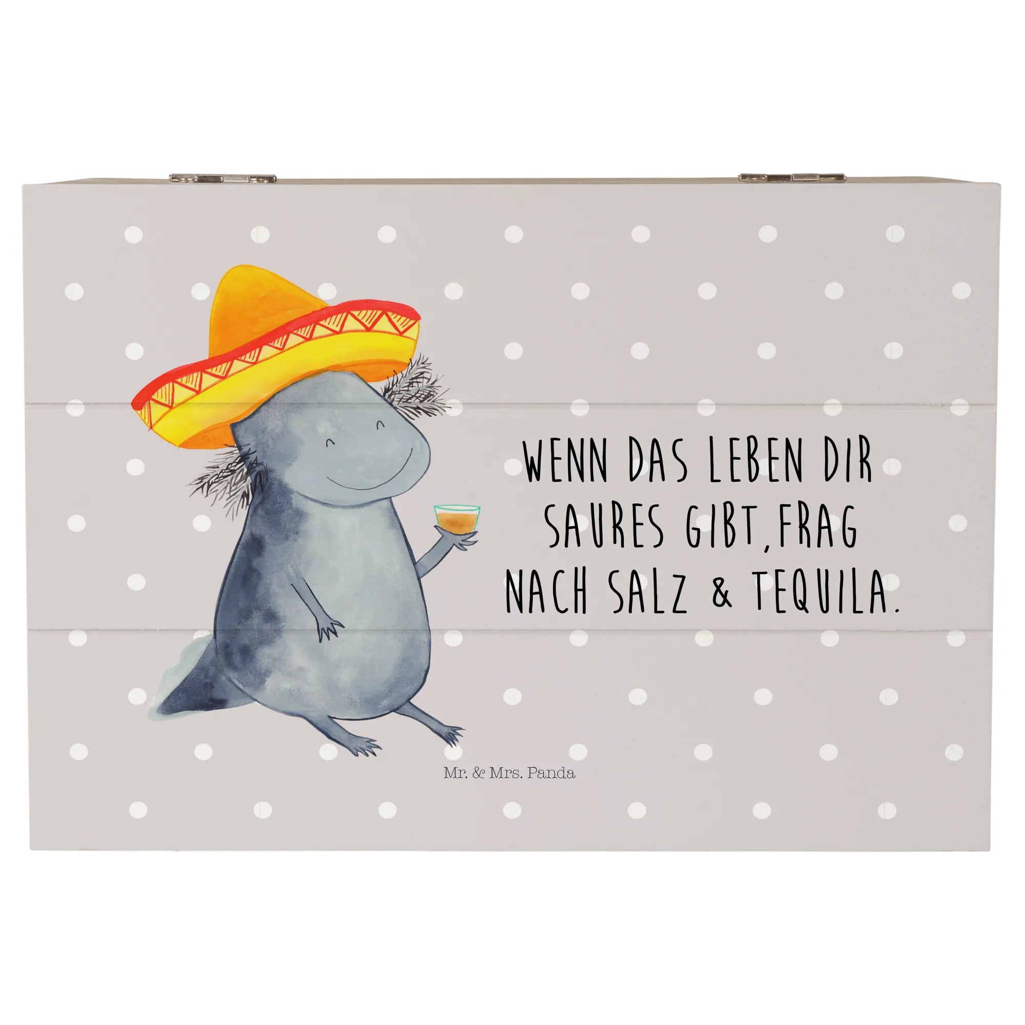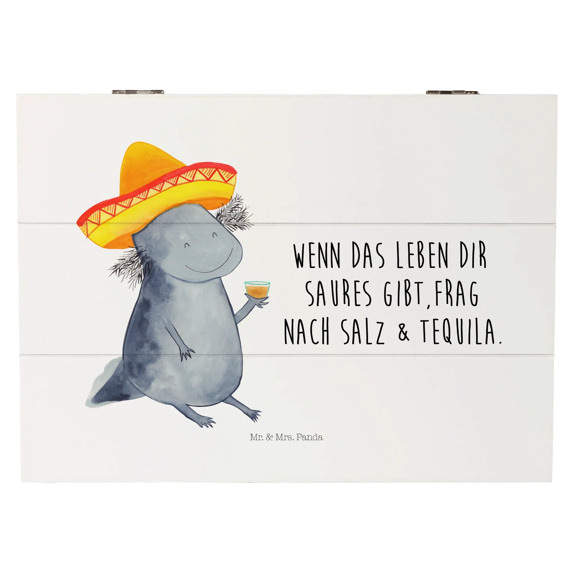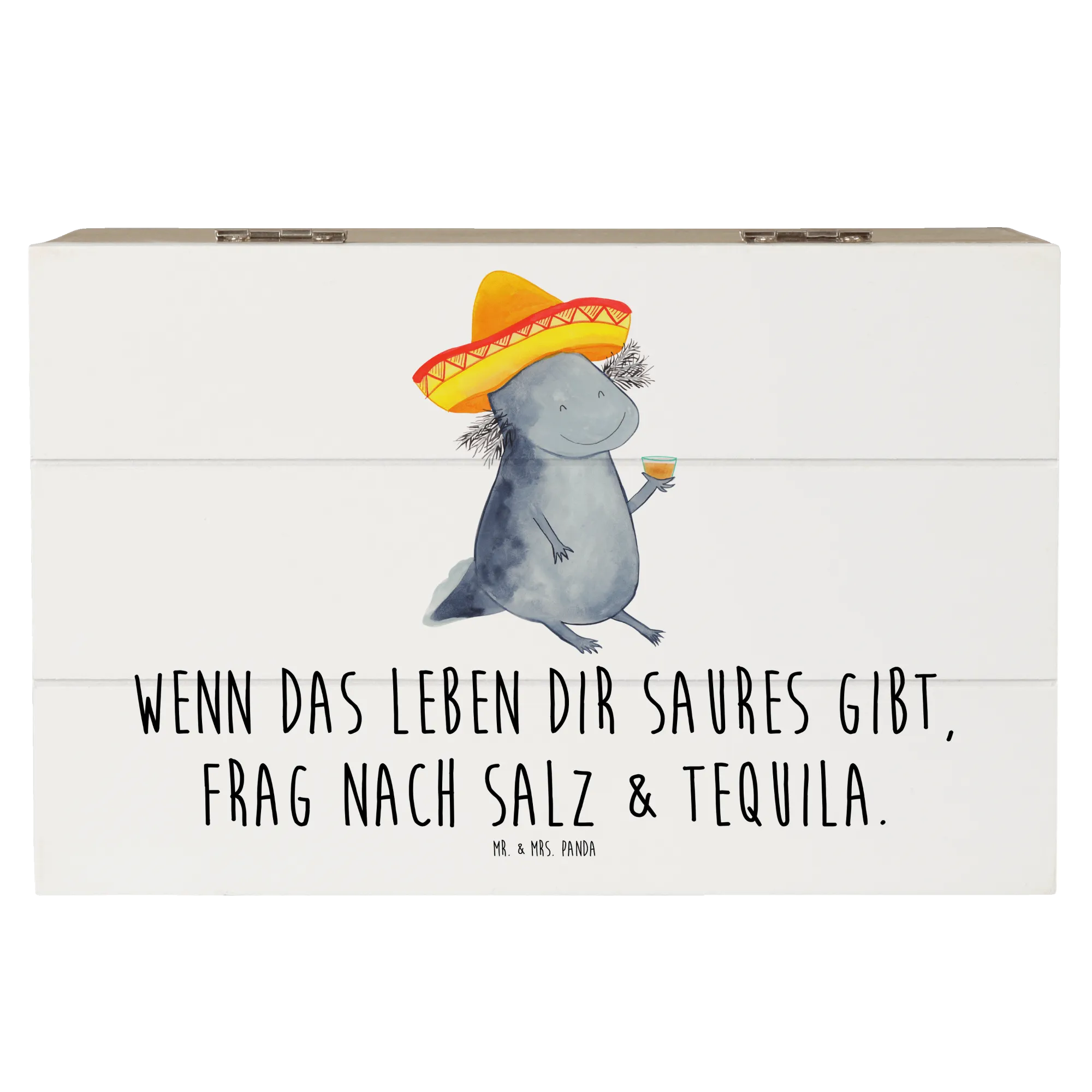 Entdecke die wunderschöne Holzkiste mit dem niedlichen Axolotl Tequila Motiv von Mr. & Mrs. Panda!