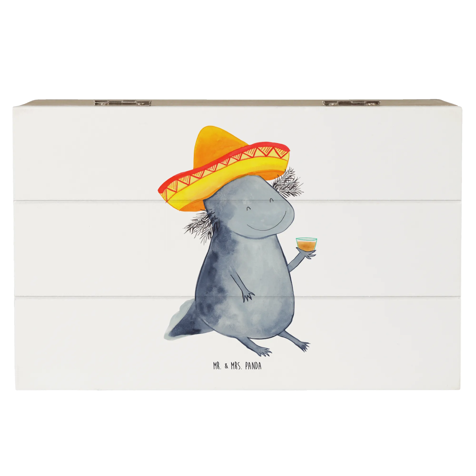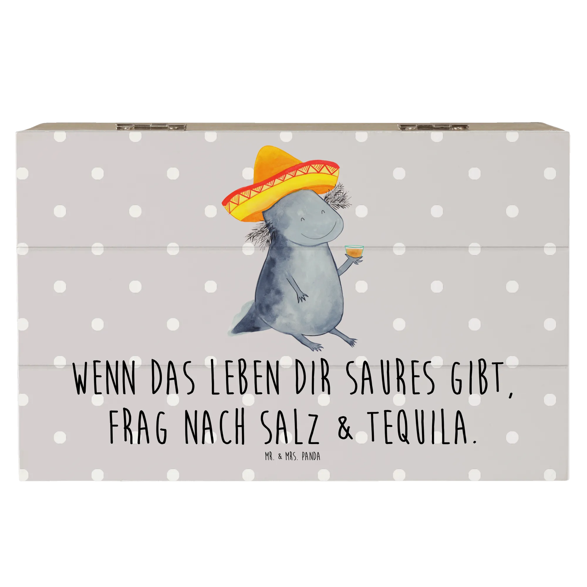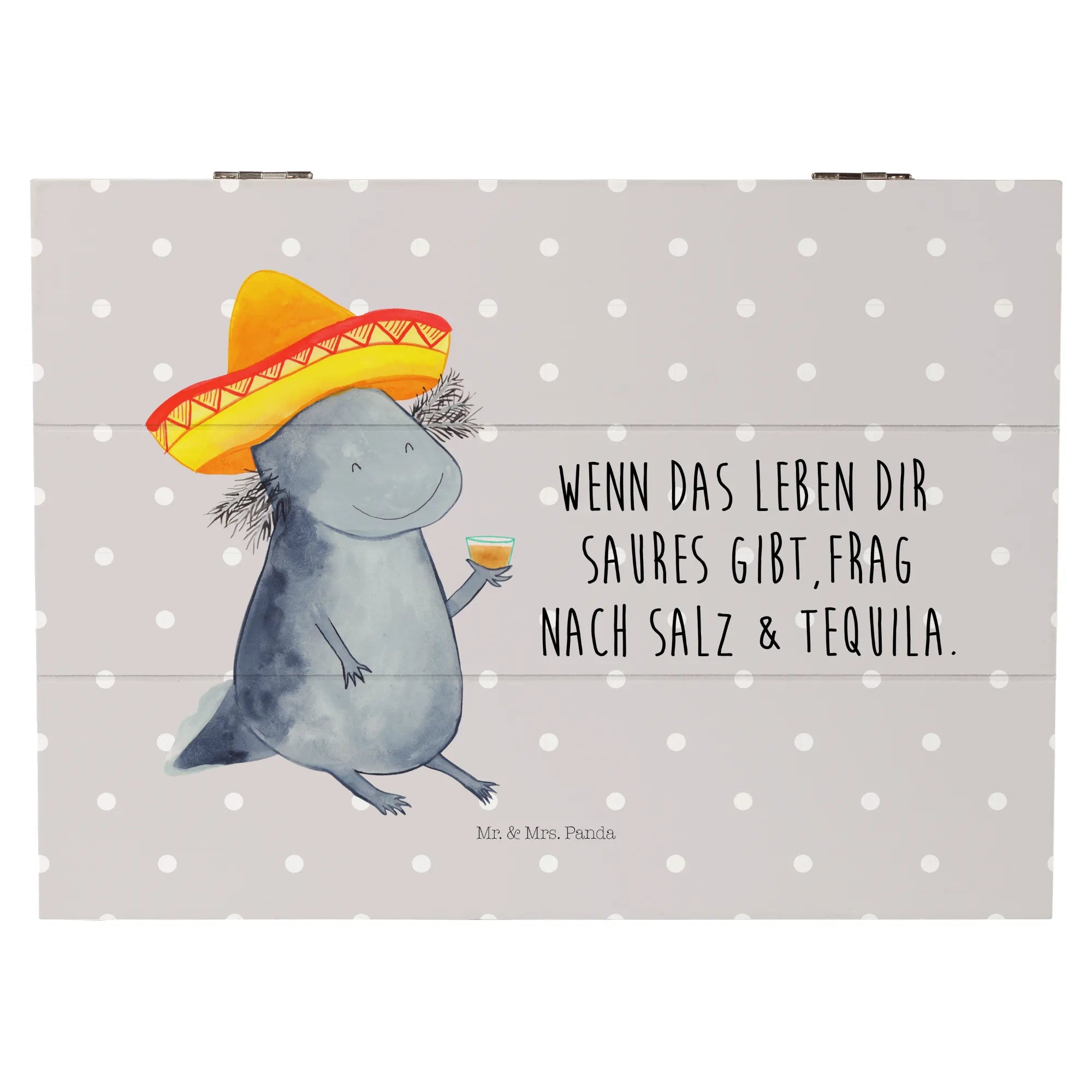 Entdecke die wunderschöne Holzkiste mit dem niedlichen Axolotl Tequila Motiv von Mr. & Mrs. Panda!