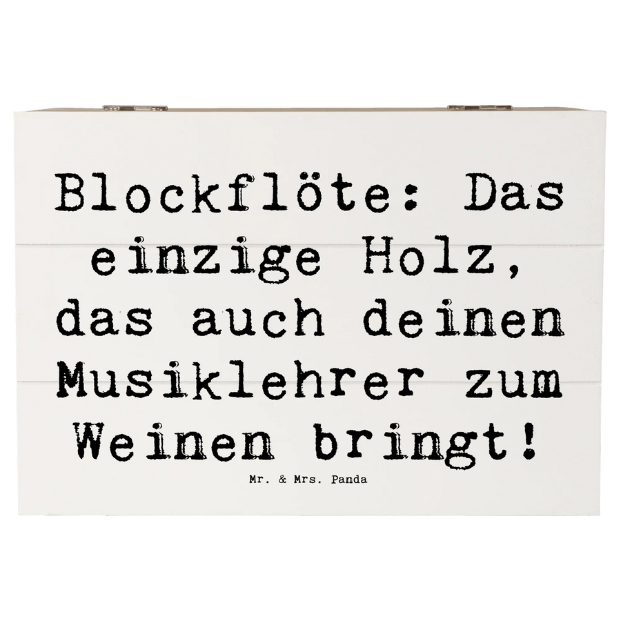 Entdecke die wundervolle Holzkiste von Mr. & Mrs. Panda mit dem einzigartigen Motiv "Blockflöte: Das einzige Holz, das auch deinen Musiklehrer zum Weinen bringt!" Diese Erinnerungskiste ist nicht nur ein praktischer Aufbewahrungsort für all deine Schätze, sondern auch ein liebevolles Geschenk für Musikliebhaber und angehende Musiker.