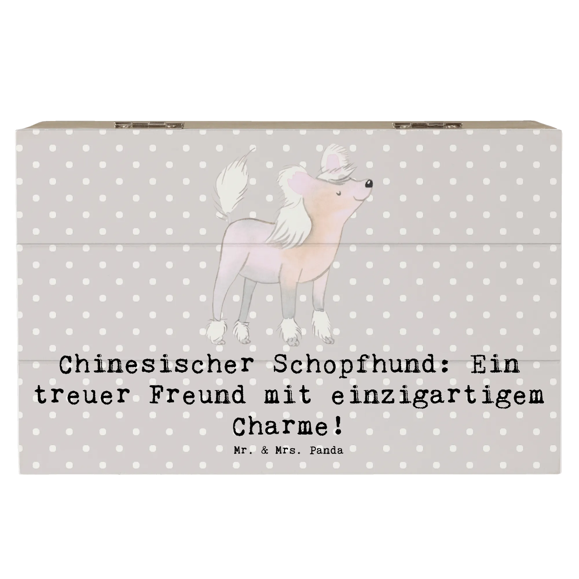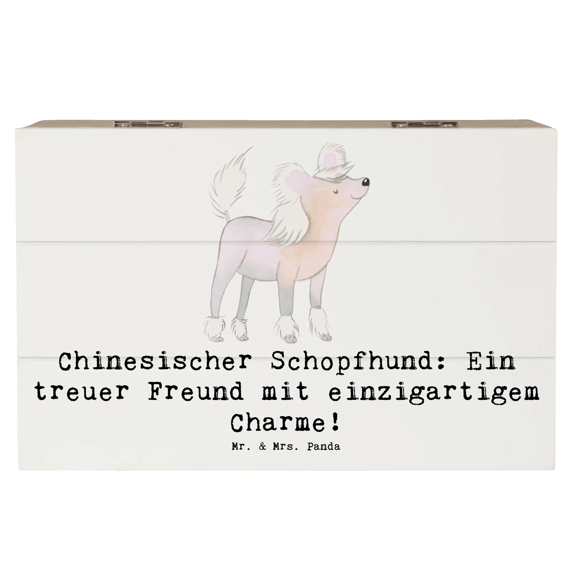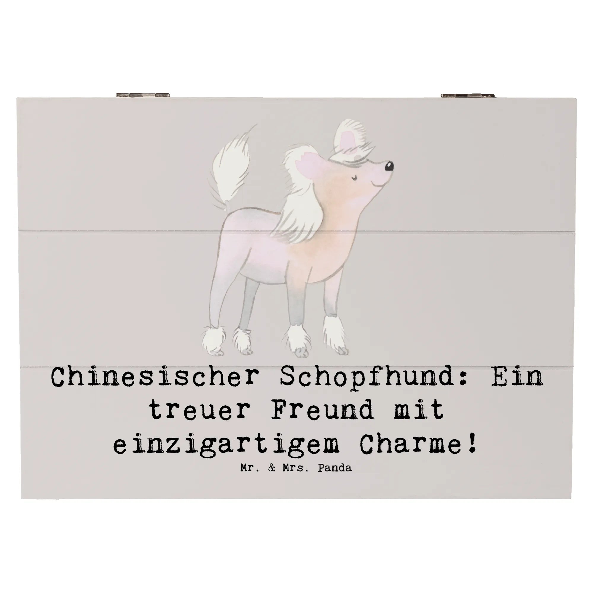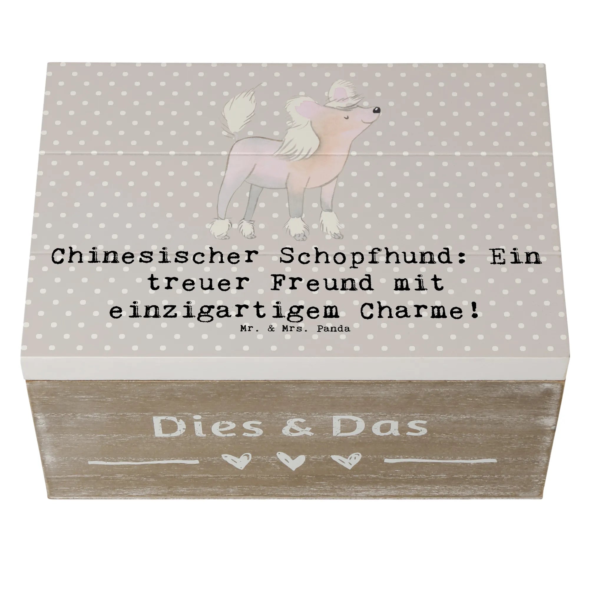 Die wunderschöne Holzkiste mit dem Motiv "Chinesischer Schopfhund" von Mr. & Mrs. Panda ist das perfekte Geschenk für alle Hundefans und Liebhaber dieser einzigartigen Hunderasse. Diese Erinnerungskiste ist nicht nur eine dekorative Aufbewahrungsbox, sondern auch ein Ort, an dem wertvolle Schätze wie Fotos, kleine Andenken oder Geschenke aufbewahrt werden können. Die liebevoll gestaltete Kiste strahlt durch ihr einzigartiges Design und den charmanten Slogan "Chinesischer Schopfhund: Ein treuer Freund mit einzigartigem Charme!" einen ganz besonderen Charme aus.