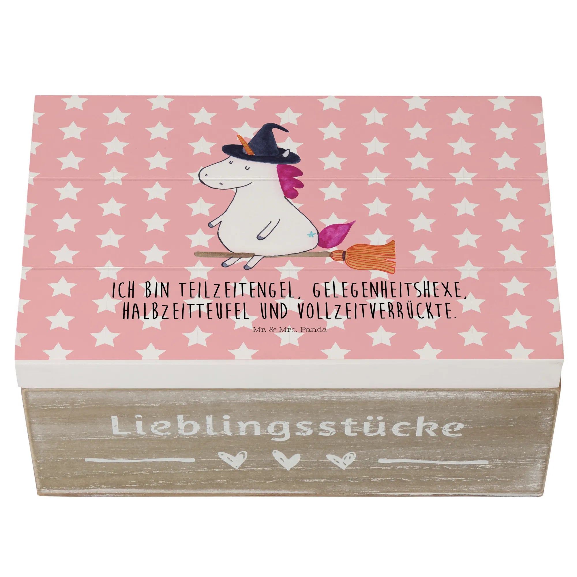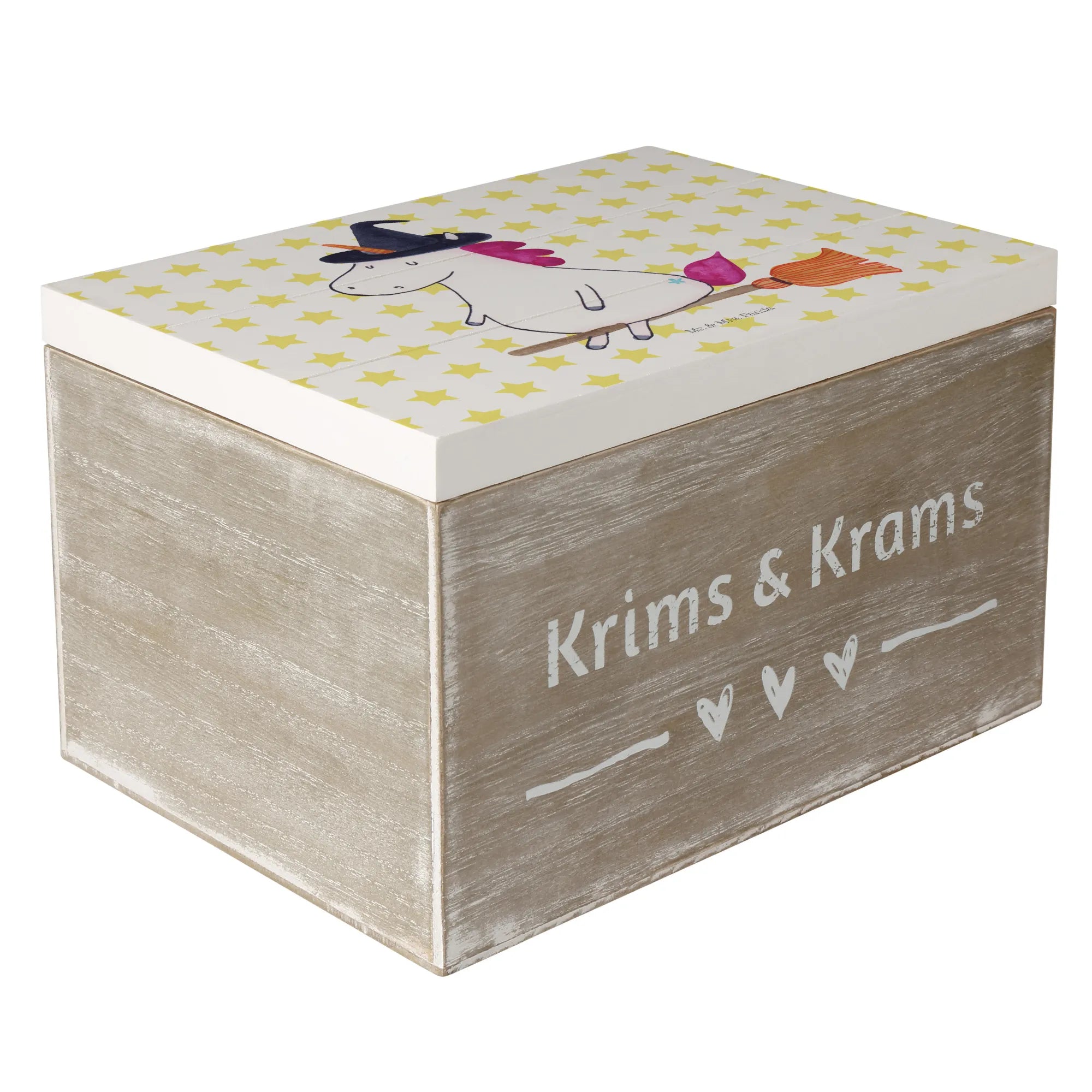 Entdecke unsere zauberhafte Holzkiste mit dem einzigartigen Einhorn-Hexe-Motiv aus der bezaubernden Einhorn-Kollektion von Mr. & Mrs. Panda!
