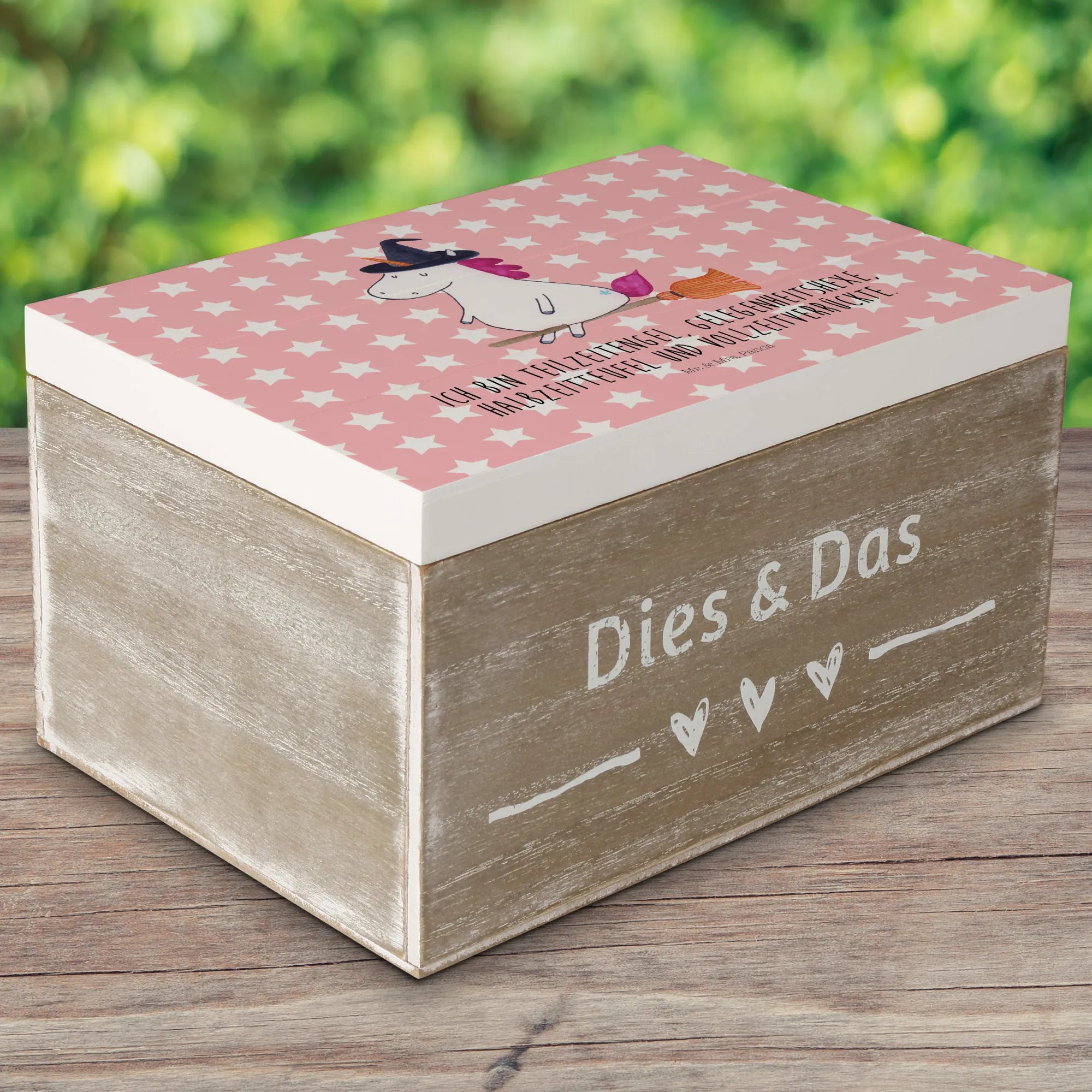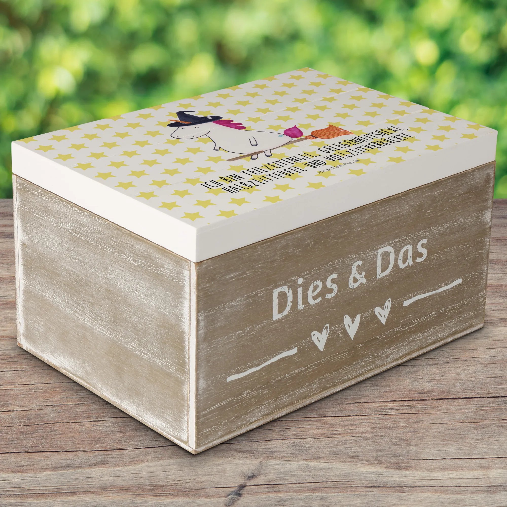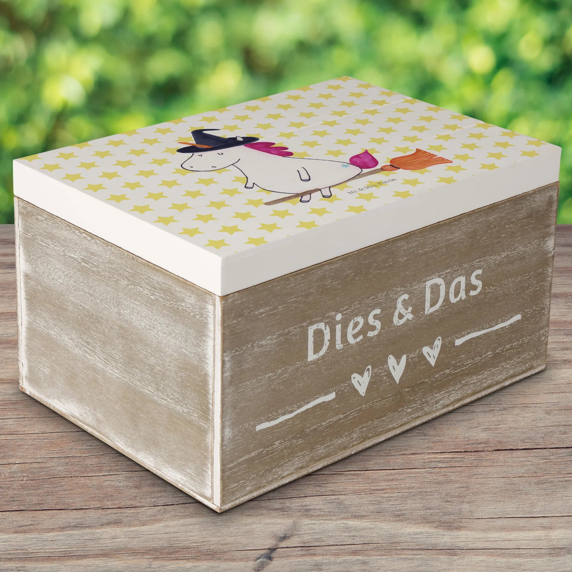 Die wunderschöne Holzkiste mit dem zauberhaften Einhorn-Motiv 'Hexe' von Mr. & Mrs. Panda ist das perfekte Geschenk für alle, die das Außergewöhnliche lieben.