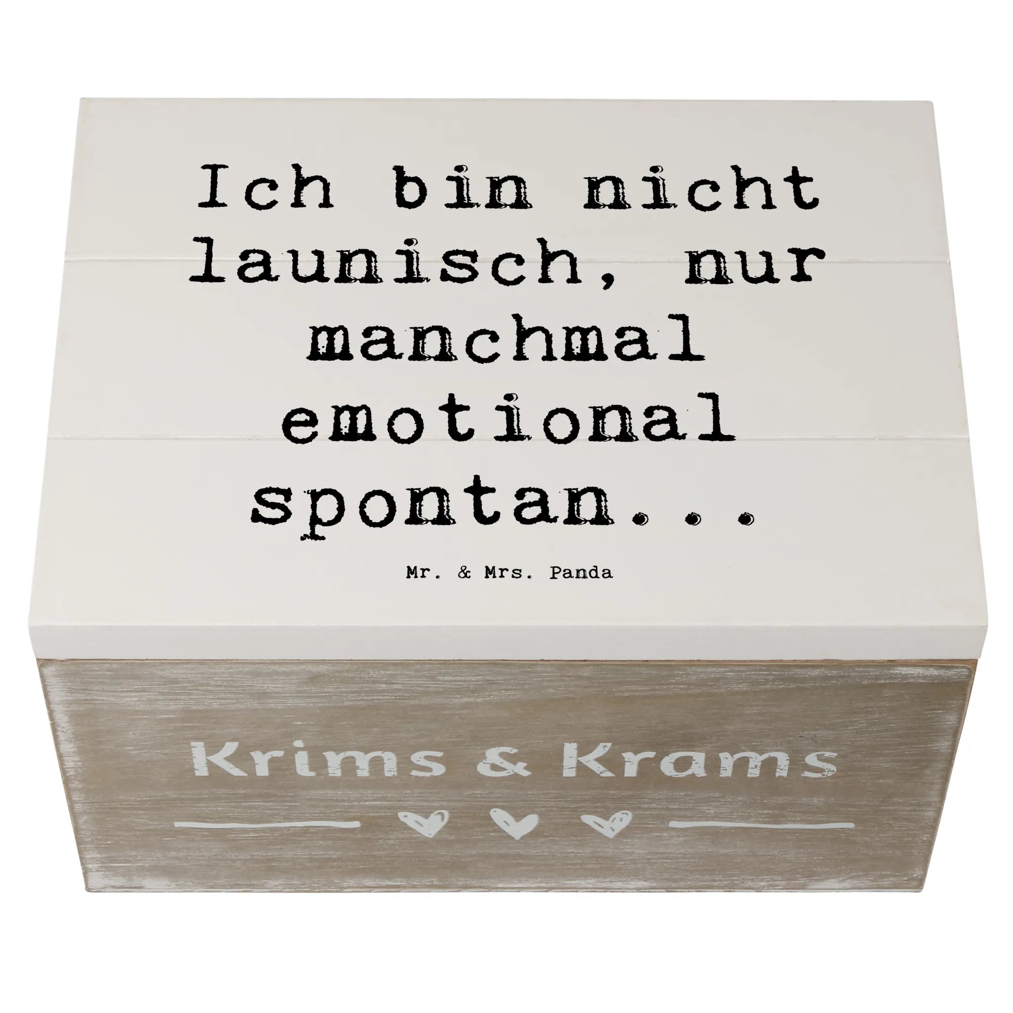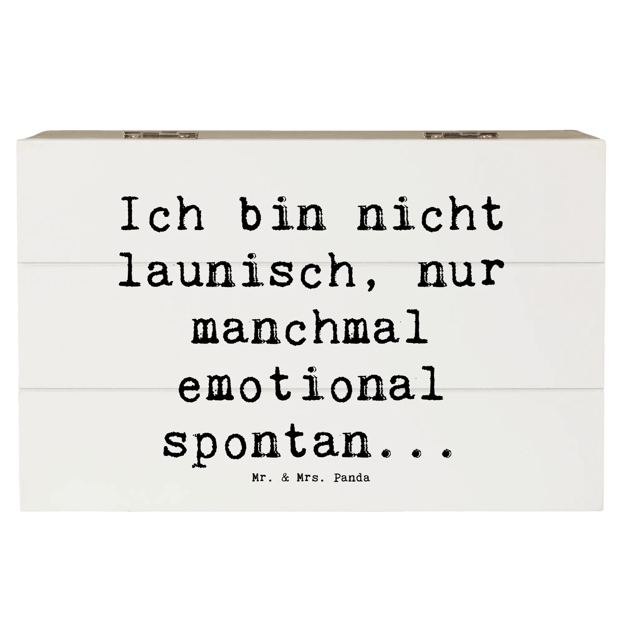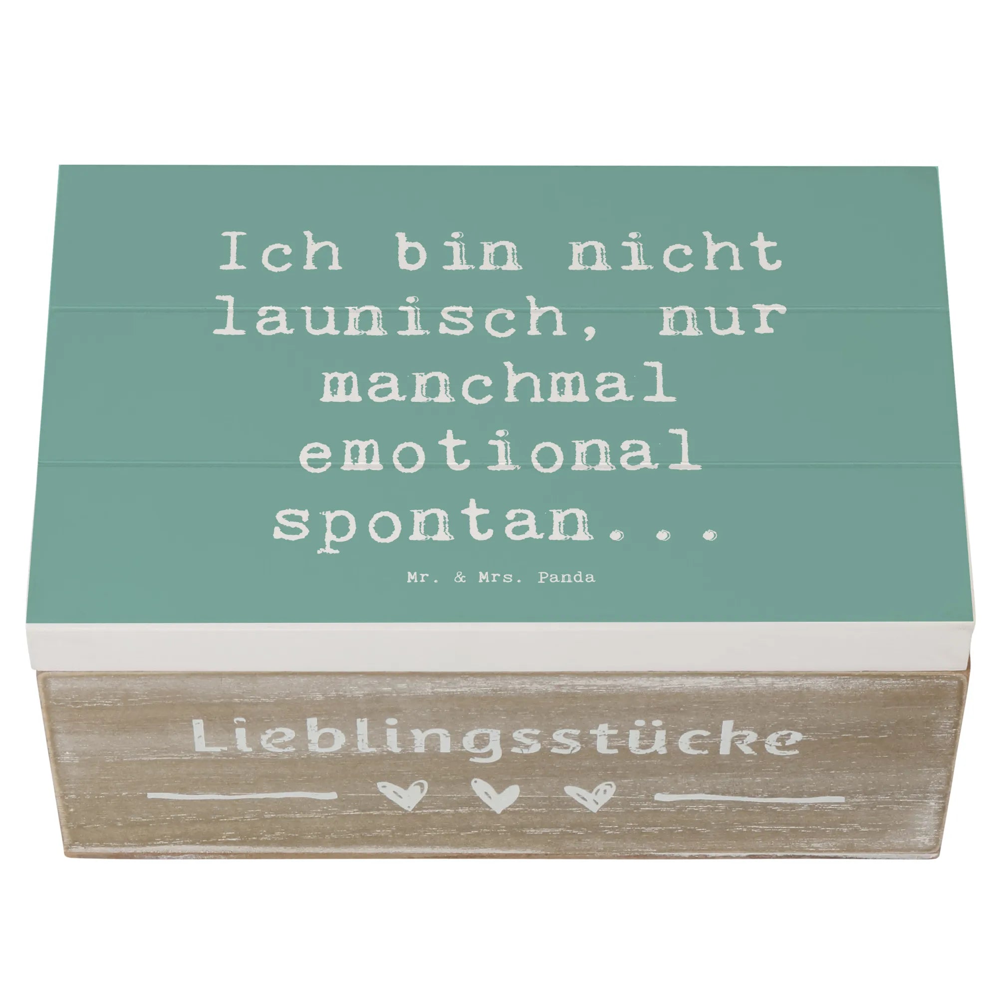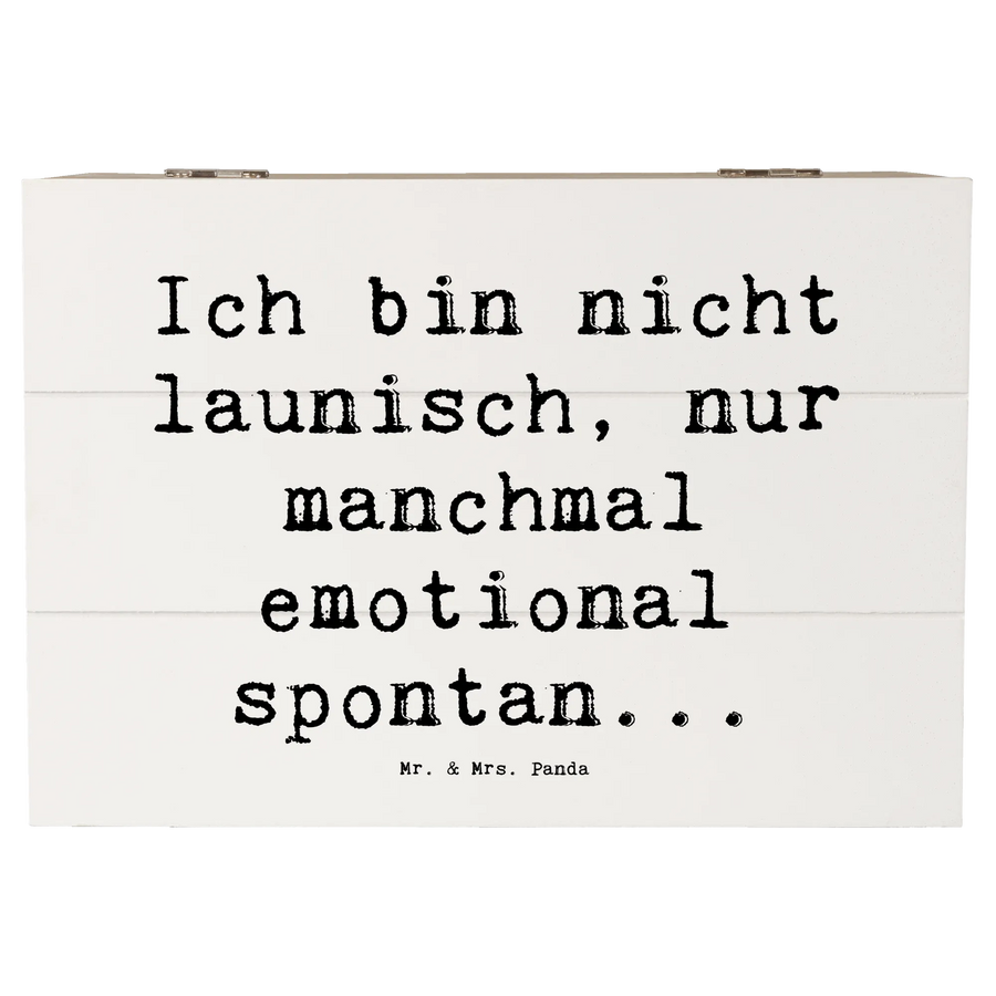 Ein ganz besonderes Highlight dieser Holzkiste ist der Spruch "Ich bin nicht launisch, nur manchmal emotional spontan...". Dieser Spruch bringt nicht nur ein Lächeln ins Gesicht, sondern erinnert uns auch daran, dass es in Ordnung ist, seine Emotionen zu zeigen. Sie eignet sich hervorragend als Geschenk für Freunde und Familie, die ein wenig Mut und Zuversicht brauchen oder einfach als Erinnerung an die schönen Dinge im Leben.