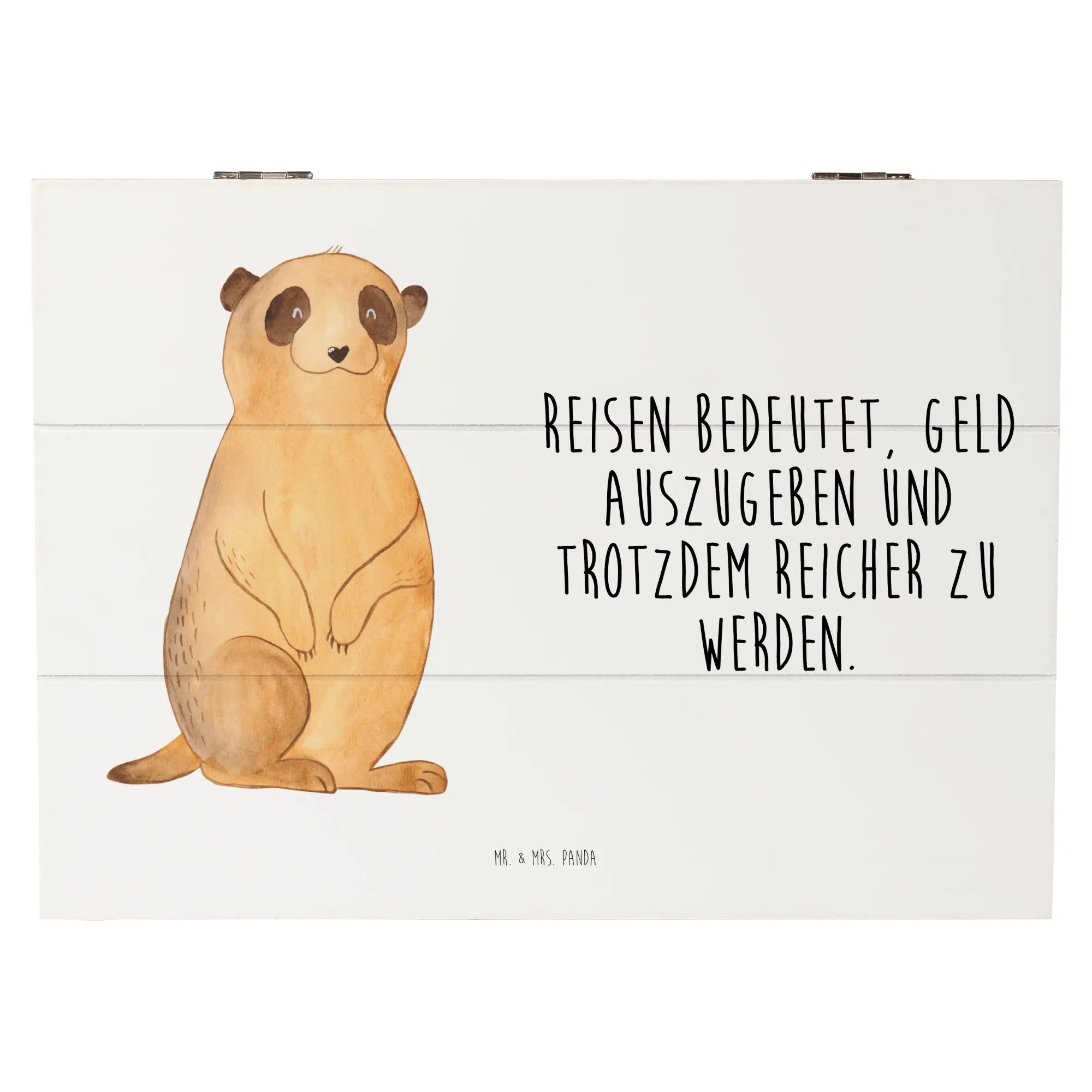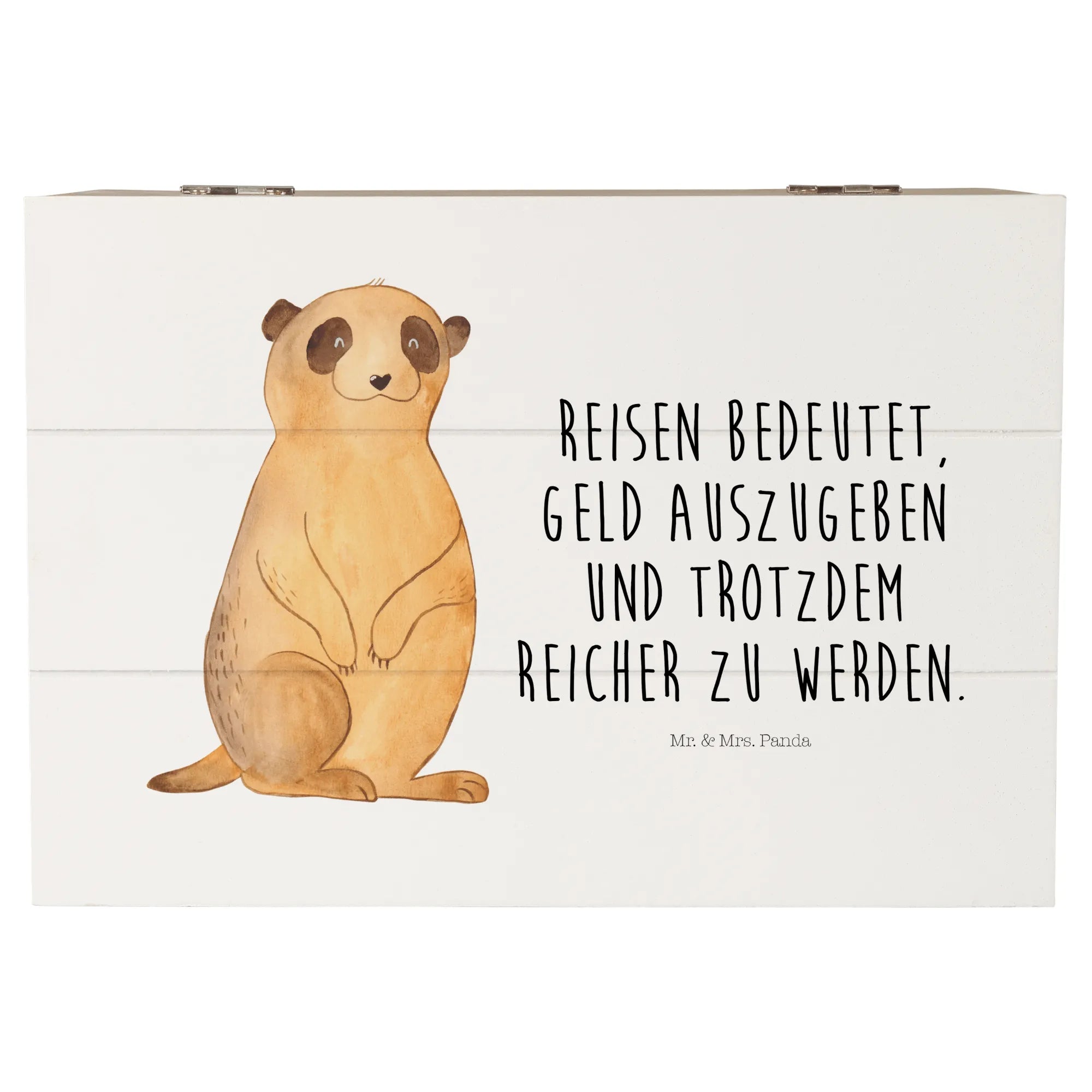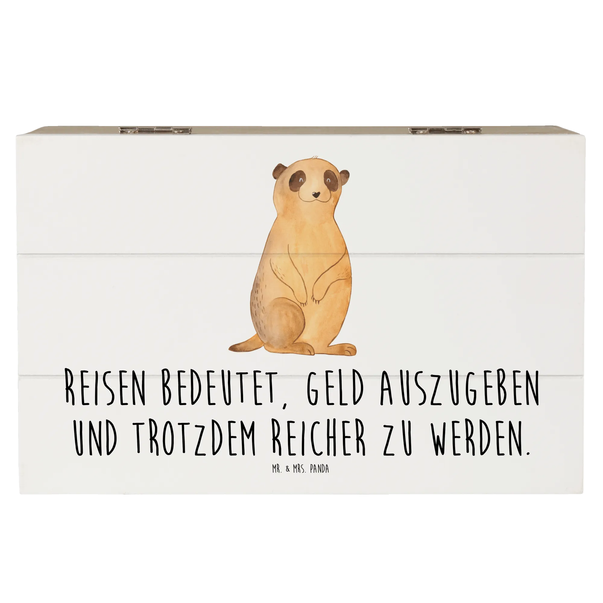Das süße Erdmännchen, das neugierig aus der Kiste schaut, symbolisiert die Freude am Entdecken und die Schönheit des Reisens. Durch den Spruch 'Reisen bedeutet, Geld auszugeben und trotzdem reicher zu werden.' ist diese Kiste ein ganz besonderer Begleiter für alle Abenteurer.