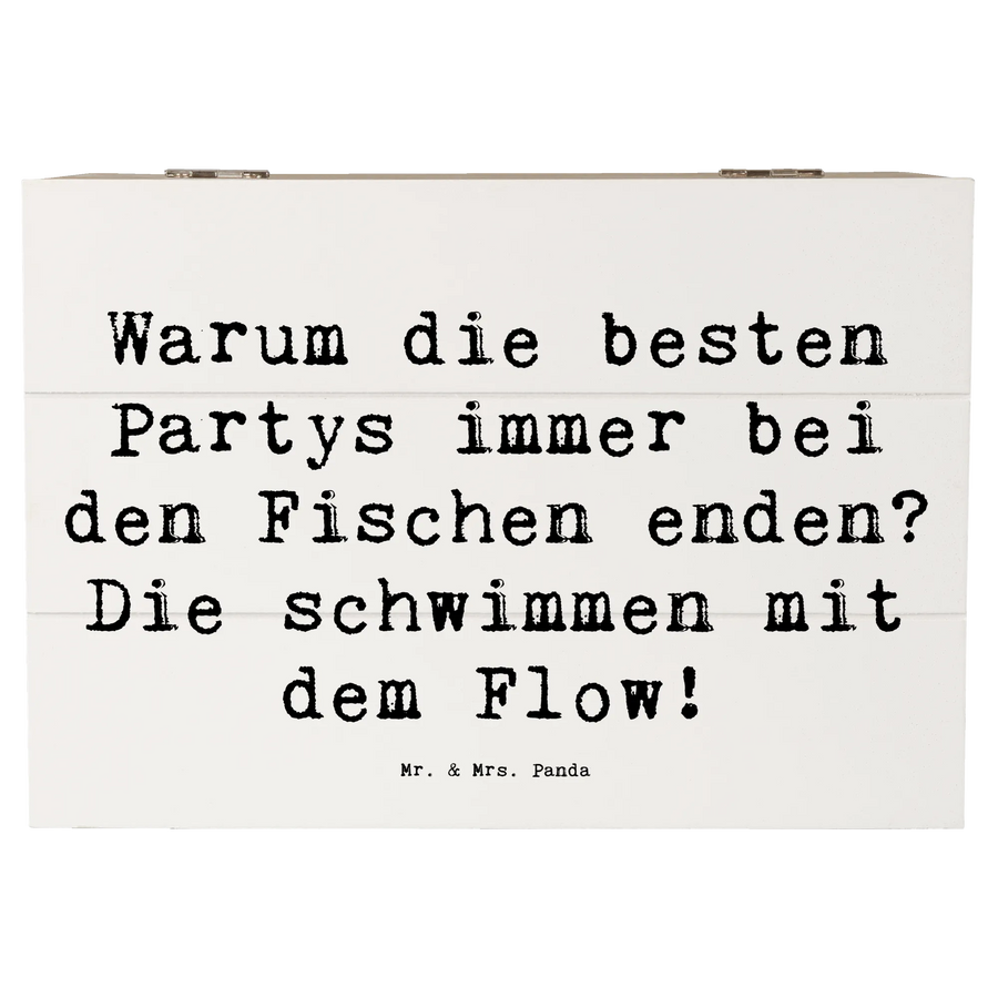 Die Einschlagscharniere ermöglichen ein einfaches Öffnen und Schließen der Kiste und machen sie besonders benutzerfreundlich. Mit ihrem entzückenden Design aus einer liebevollen Auswahl an handgezeichneten Motiven und Sprüchen ist diese Holzkiste nicht nur funktional, sondern auch ein wahrer Hingucker. Sie enthält das Motto, das für alle Fische spricht: 'Warum die besten Partys immer bei den Fischen enden? Die schwimmen mit dem Flow!'